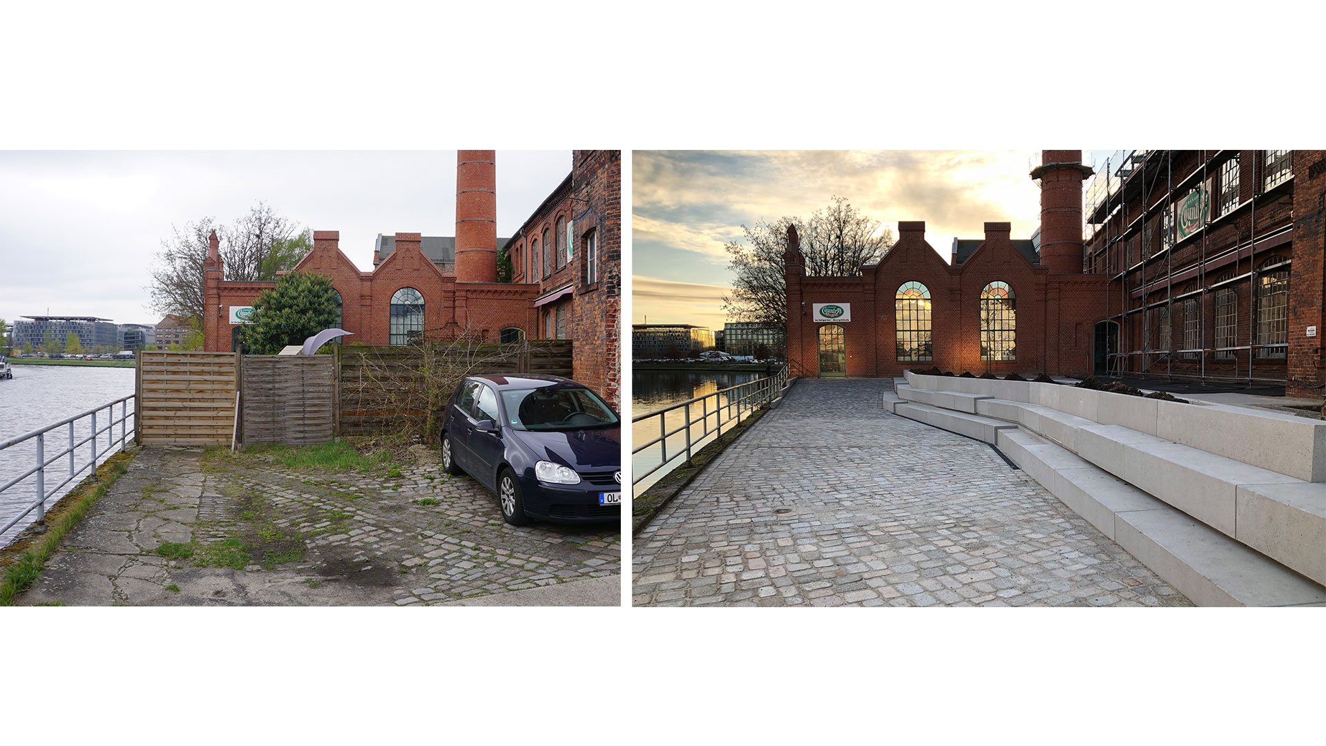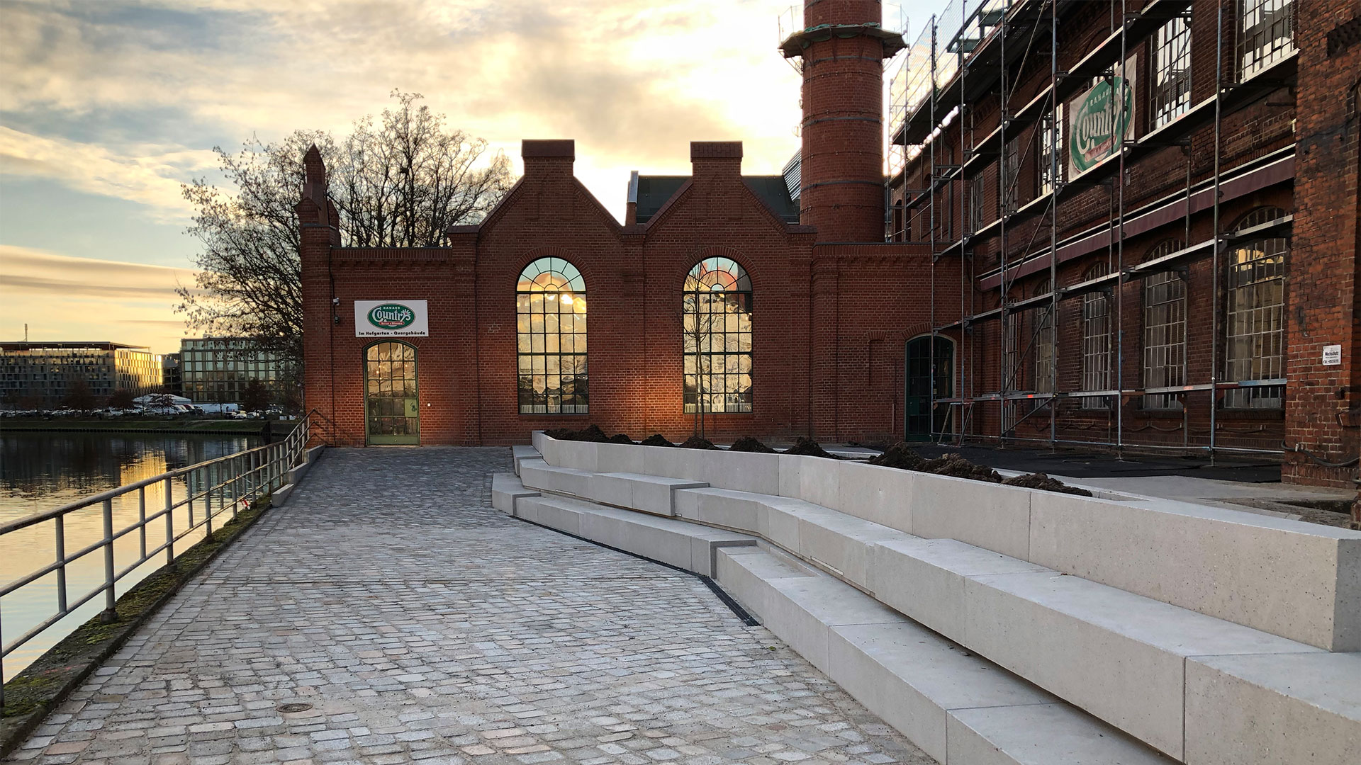 Die Gebauer Höfe mit ihrer Entstehungszeit aus der Mitte des 19. Jd. werden aktuell aufgewertet. Das überarbeitete historische Berliner Großsteinpflaster wird wieder eingebaut und verbindet die Höfe des ehemaligen Industriestandorts an der Spree miteinander. Die Erneuerung der Freianlagen wird abschnittsweise realisiert. Die ersten Flächen werden dieses Frühjahr übergeben.