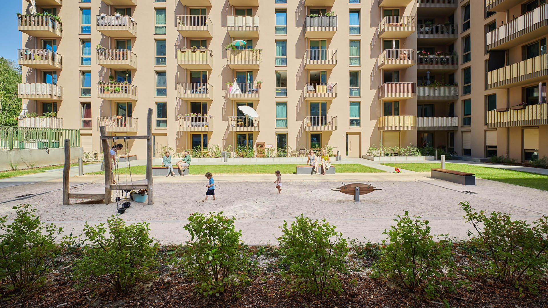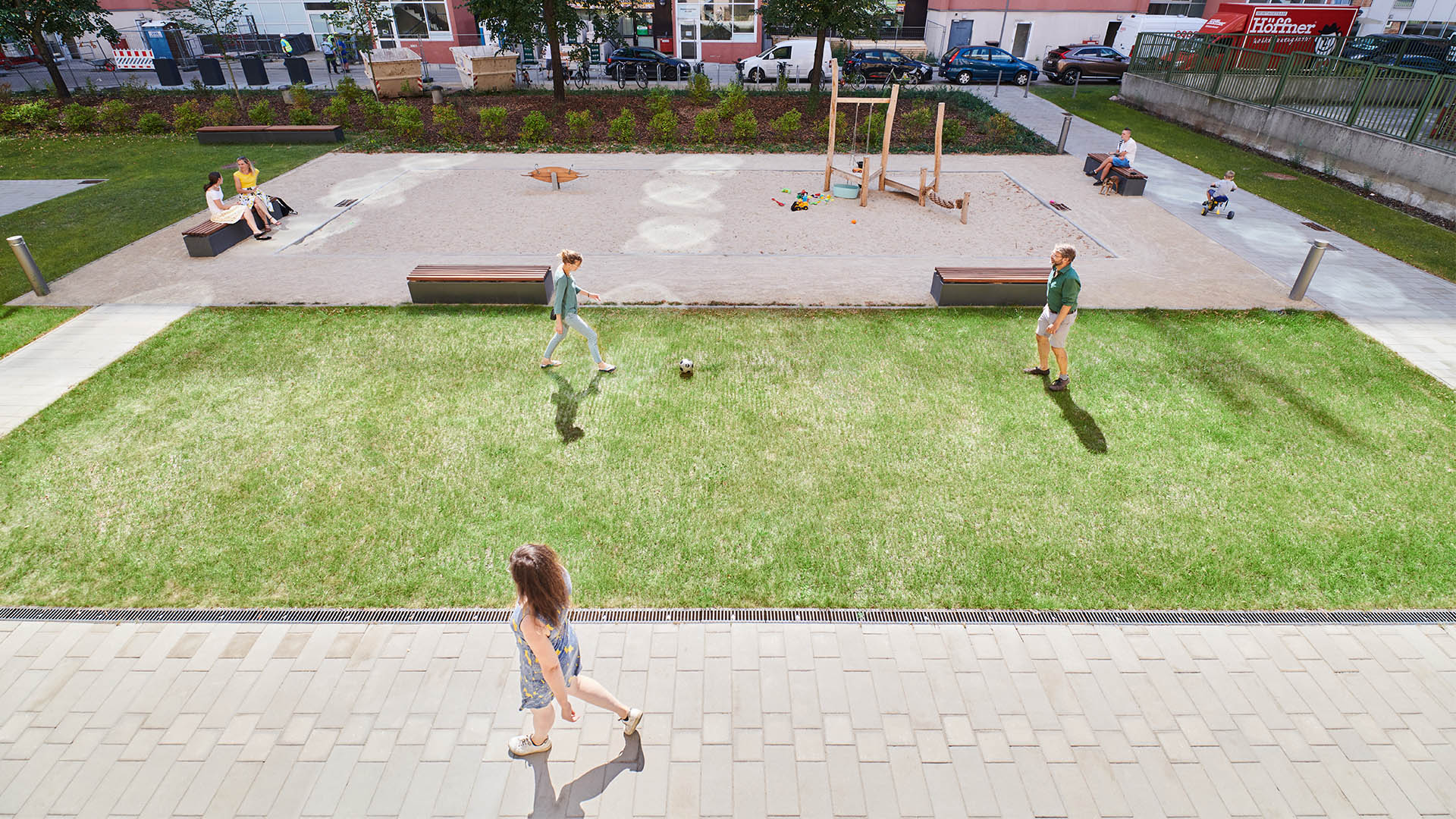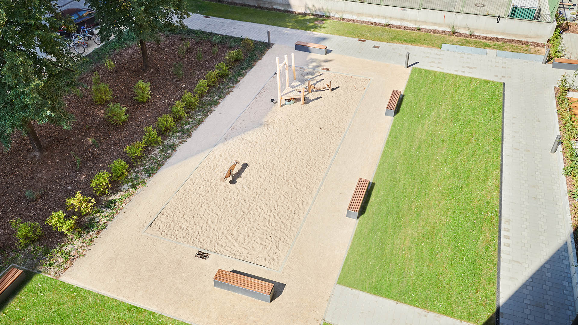 Drei zentrale Grünflächen mit Spielplätzen dienen als Treffpunkt für die Nachbarschaft.