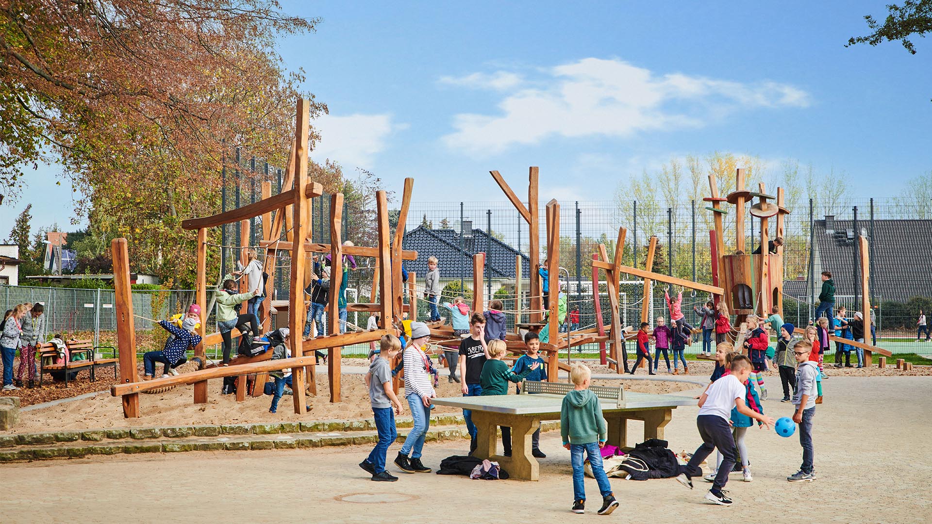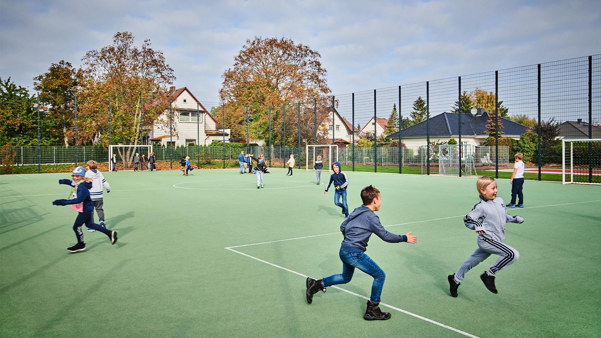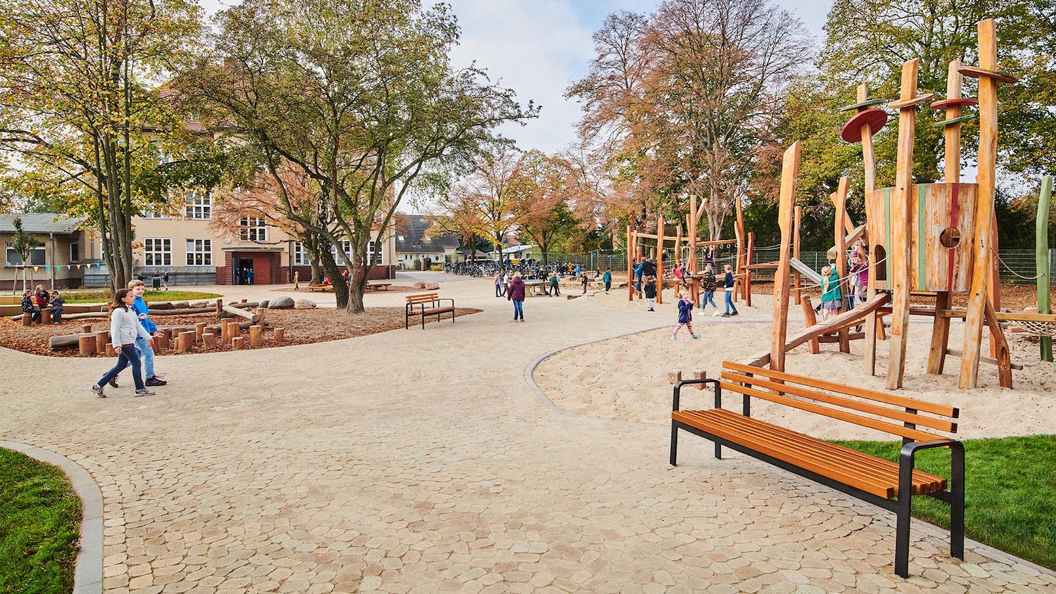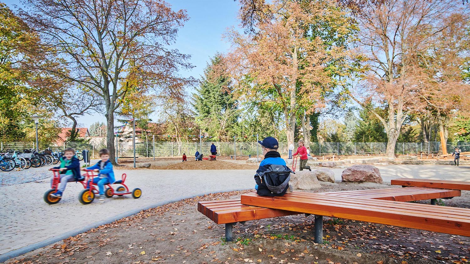 Der Schulhof der Mahlsdorfer Grundschule wird durch vielfältige Maßnahmen neu Gestaltet. Turnhallenneubau und die mobilen Unterrichtsräume werden in den Außenraum integriert und ergeben so gemeinsam ein einheitliches Erscheinungsbild.