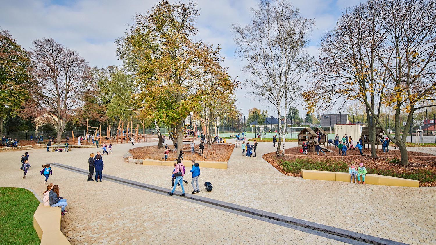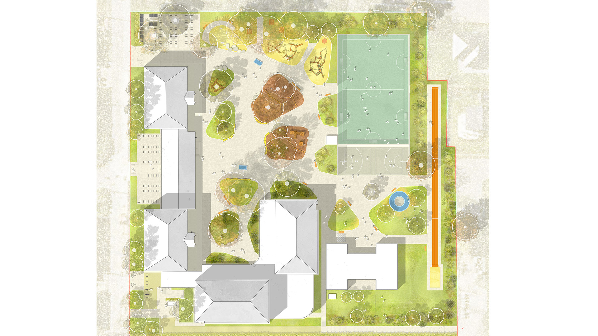 Der Hof wird als Inselkonzept gestaltet. Diese Inseln werden mit Rasenflächen, Sand bzw. Fallschutzkies versehen. Nach Altersgruppen unterteilte Bereich werden mit jeweils altersgerechten Spielgeräten bestückt. Vorhandener Baumbestand soll großteils erhalten werden, neue Bäume werden zusätzlich gepflanzt. Grasinseln dienen als Aufenthalts-und Spielbereiche, teilweise im Schatten der Bäume. Rasenflächen werden durch Solitärsträucher ergänzt, mit Blühsträuchern im Licht sowie schattenverträglichen Kleinsträuchern unter den Bäumen. Randeinfassungen der Inseln bestehen teilweise aus Betonbänken mit Sitzflächen aus Holzbelattung. Bestandsbänke und Tischkombinationen werden aufgearbeitet und wieder eingebaut. Dasselbe gilt für Bestandspflaster, das in Randbereichen neue Verwendung findet. Hauptflächen des Schulhofes werden in hochversickerungsfähigem Pflaster ausgeführt, teilweise farbig um Spielfelder hervorzuheben. Durch die Raseninseln und Bepflanzung wird der grüne Charakter des Hofes erhalten, sowie die Entwässerung zusammen mit dem Pflaster sichergestellt.