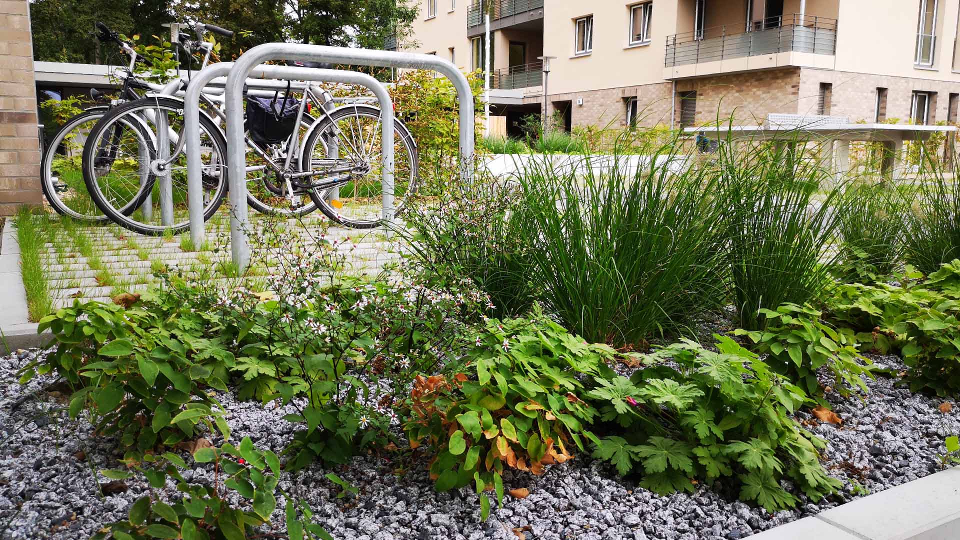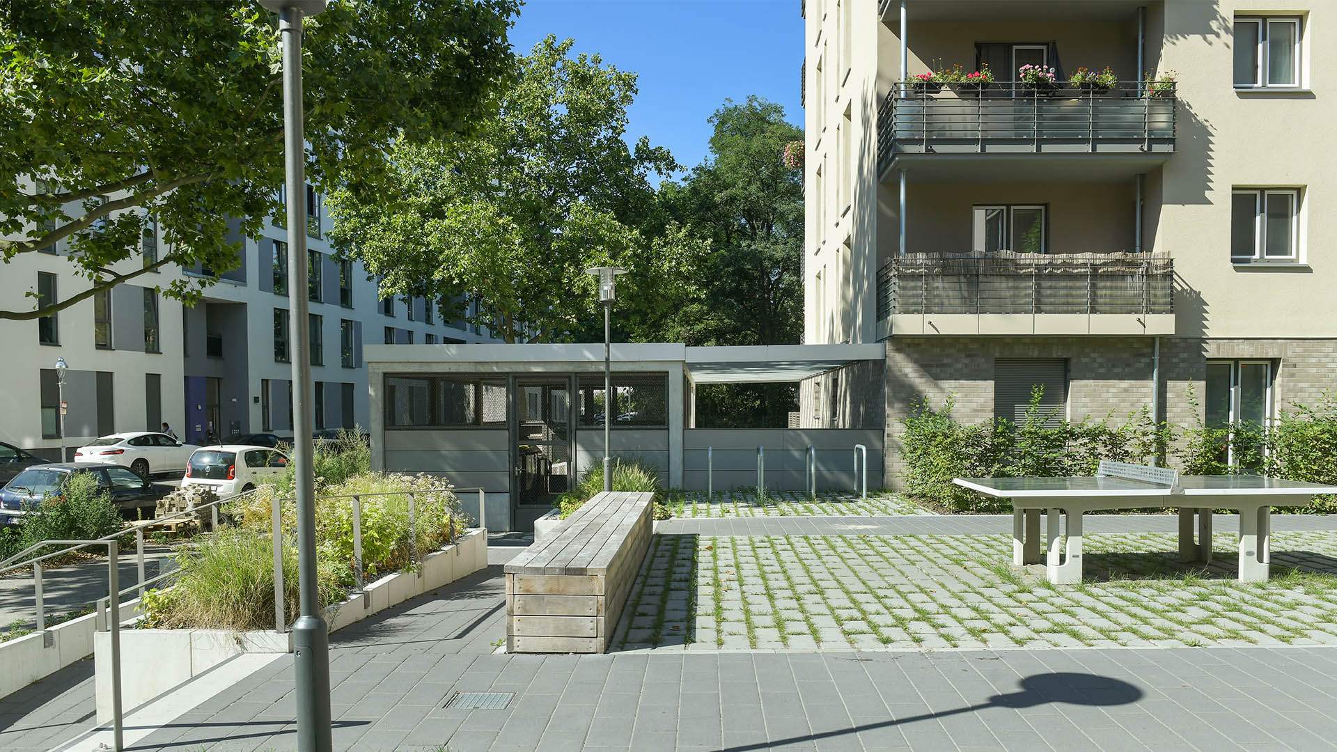 Stellplätze für PKW sind ausschließlich in der Tiefgarage vorgesehen, sodass das gesamte Gelände frei von motorisiertem Verkehr ist.