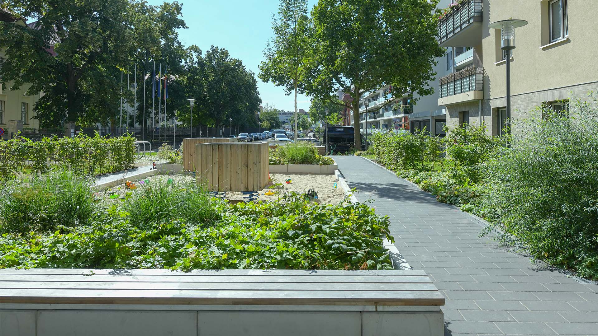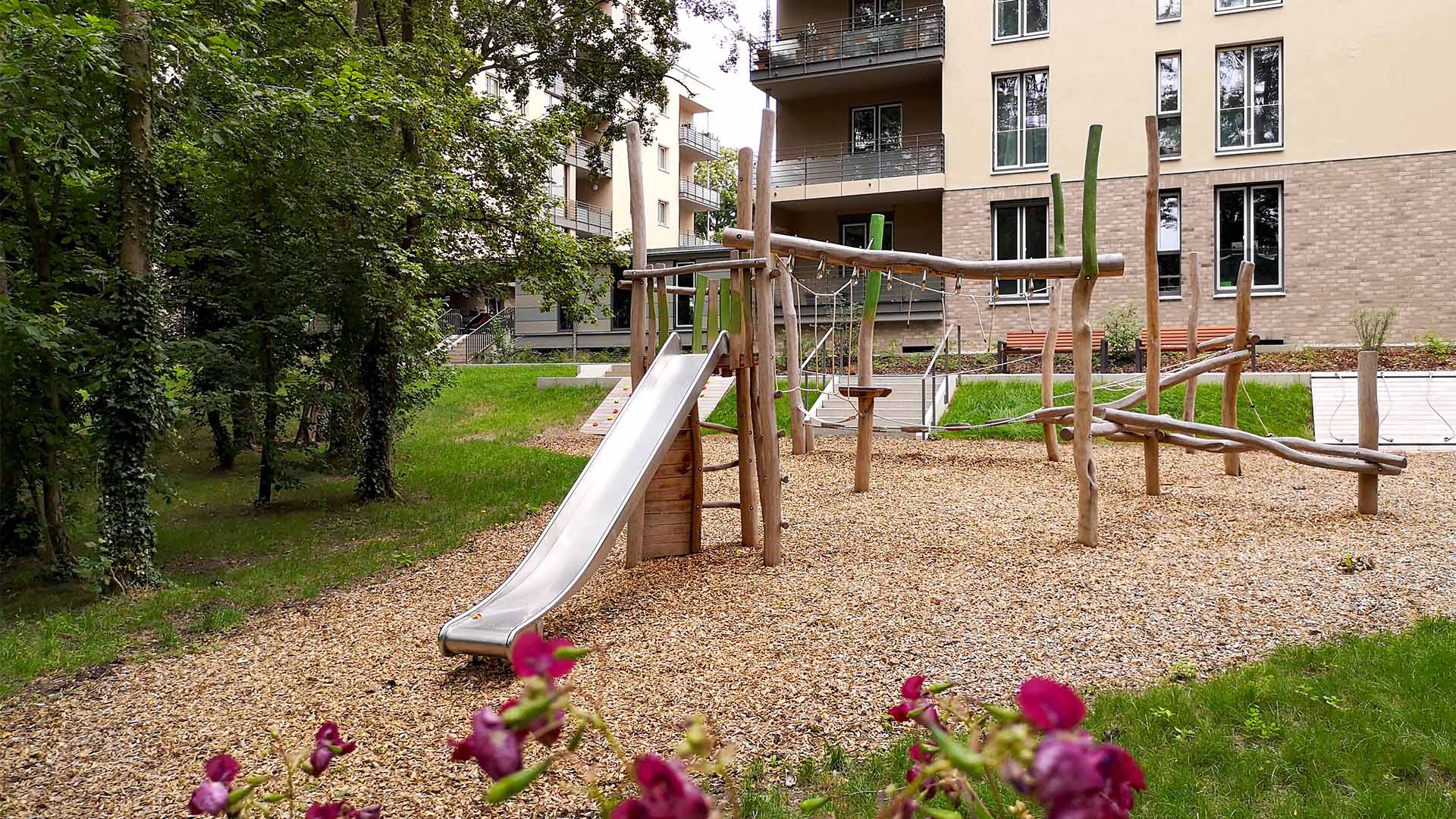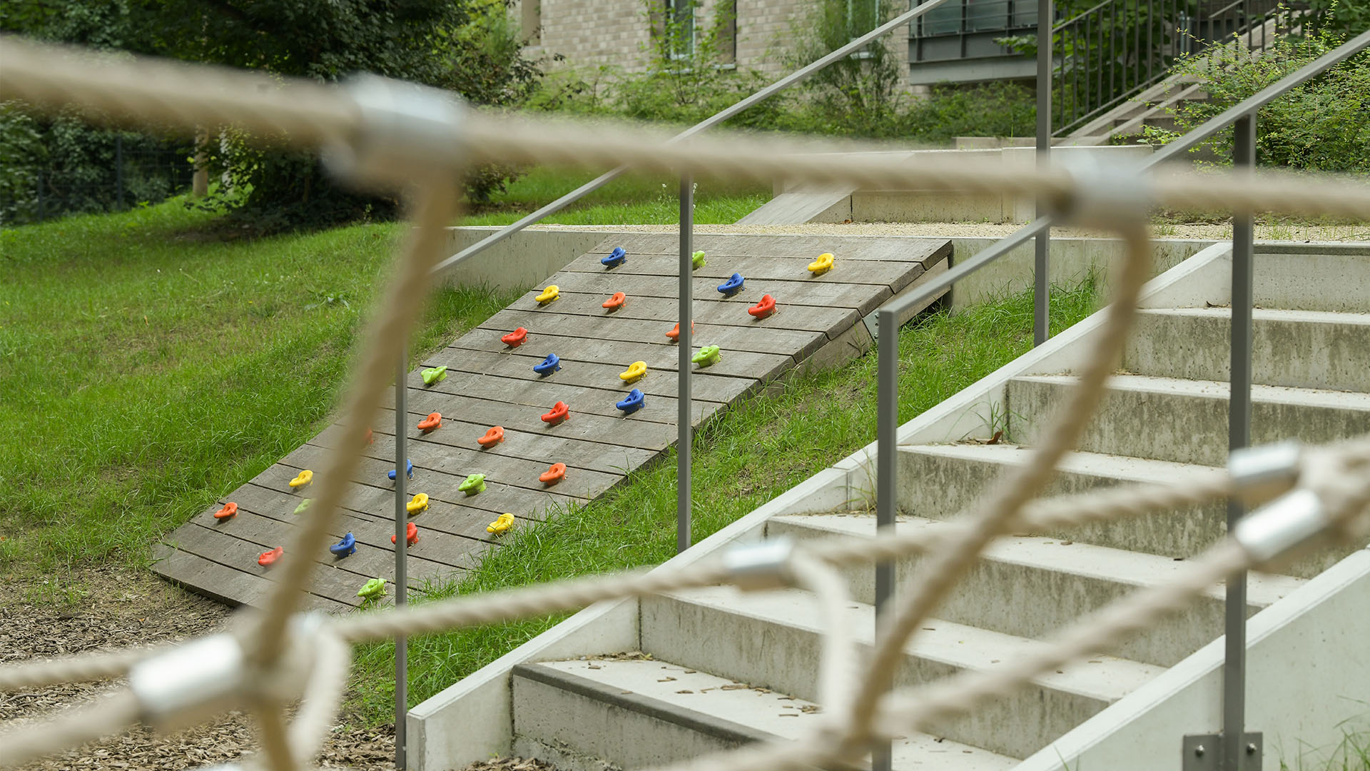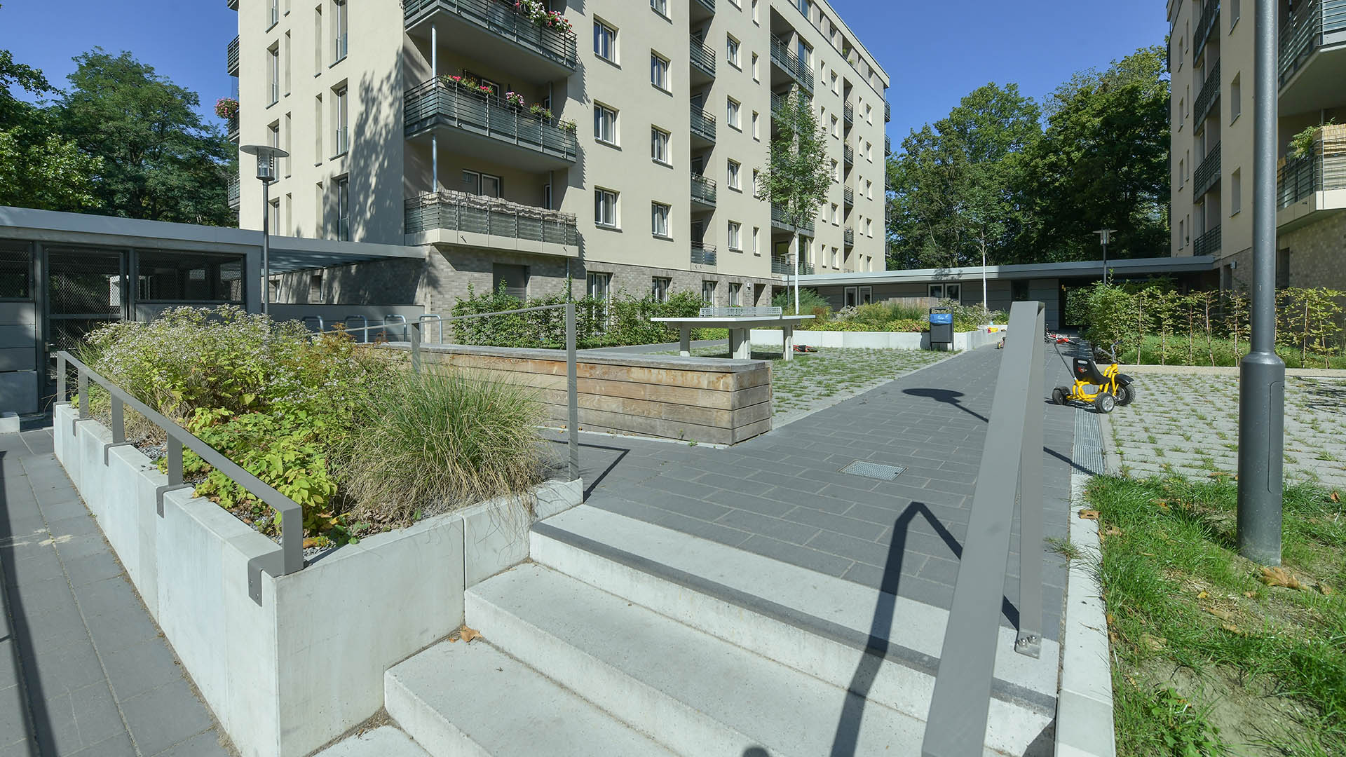 Für die Erdgeschosswohnungen wurden Loggien mit daran anschließenden Mietergärten angeboten, die mit Laubhecken abgeschirmt sind. Die übrigen Freiflächen sind für alle Bewohner nutzbar und werden über einen umlaufenden Gartenweg bzw. Trittplatten erschlossen. Im Innenhof gibt es Sitzangebote, eine Spielmöglichkeit für Kleinkinder sowie eine Tischtennisplatte. Nördlich der Gebäude, zum Teil unterhalb des dichten Baumbestandes, befindet sich der Spielplatz für die älteren Kinder - bestimmendes Thema „Klettern“.