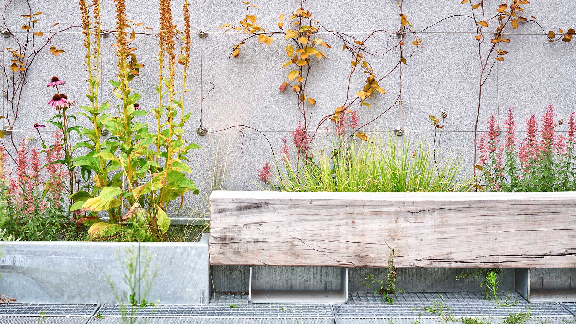 Der zweite Bereich und essentielle Gestaltungsflächen sind die Hochbeete von unterschiedlicher Größe, die mit feuerverzinktem Stahl eingefasst sind. In der Mitte des Daches befindet sich das größte Beet, in dem zwei Zimtahorne gepflanzt wurden, umgeben von Gräsern und Stauden, deren Blütenfarbe auf das rost-orange der umgebenden Wände angestimmt ist.