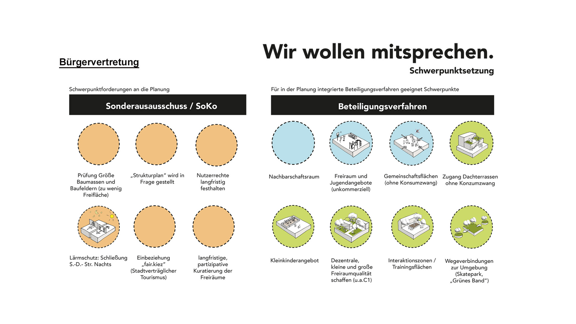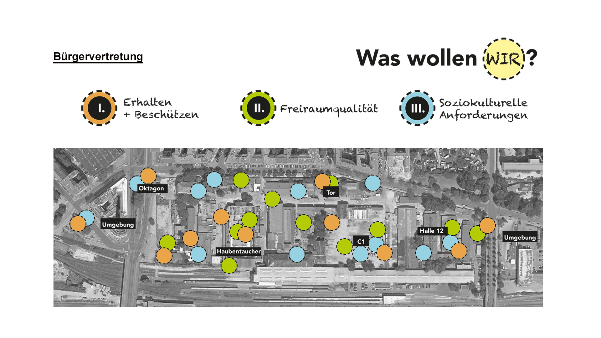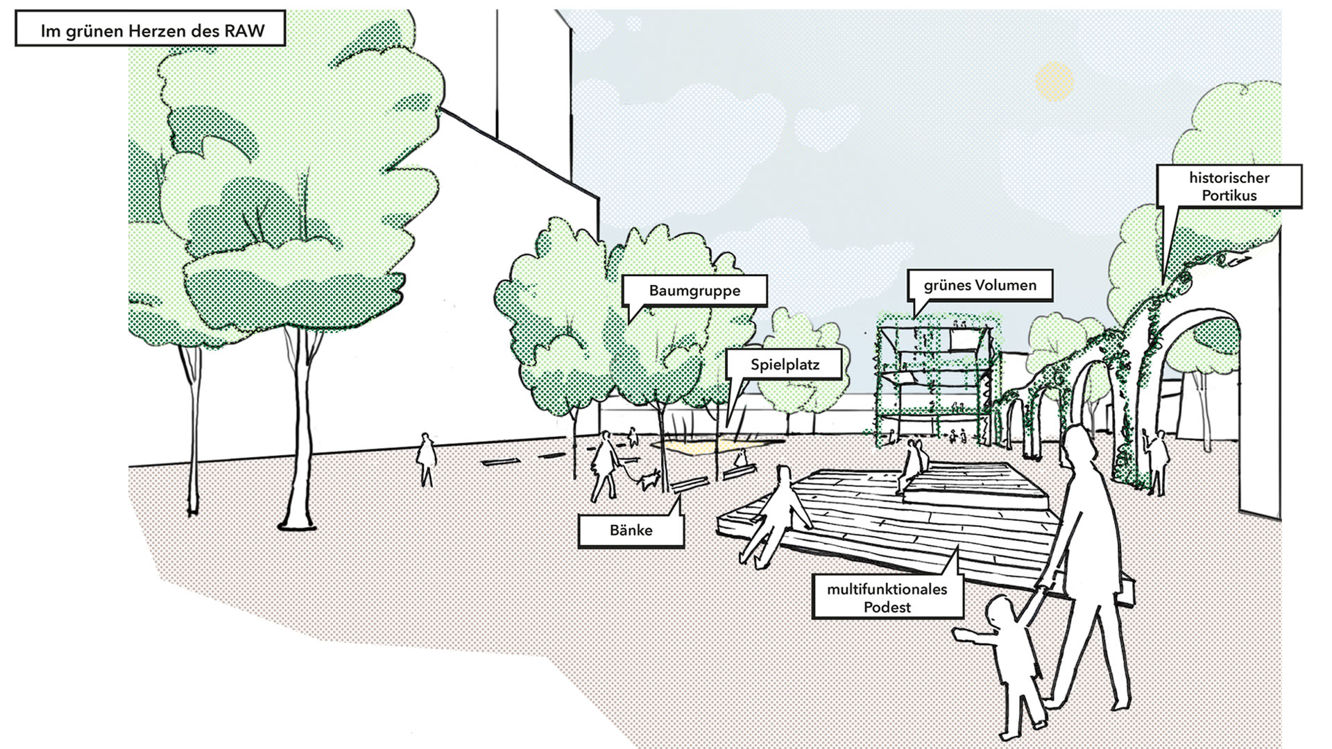 Parallel zur Freiraumstudie hat hochC die Bürgerinitiativen vom RAW Gelände in dem Verfahren planerisch unterstützt. Deren Ideen wurden in Workshops mit hochC gesammelt, ausformuliert und strukturiert. Als Diskussionsgrundlage mit anderen Akteuren auf dem RAW Gelände wurden die Stellungnahmen der Initiativen nachvollziehbar grafisch präsentiert.