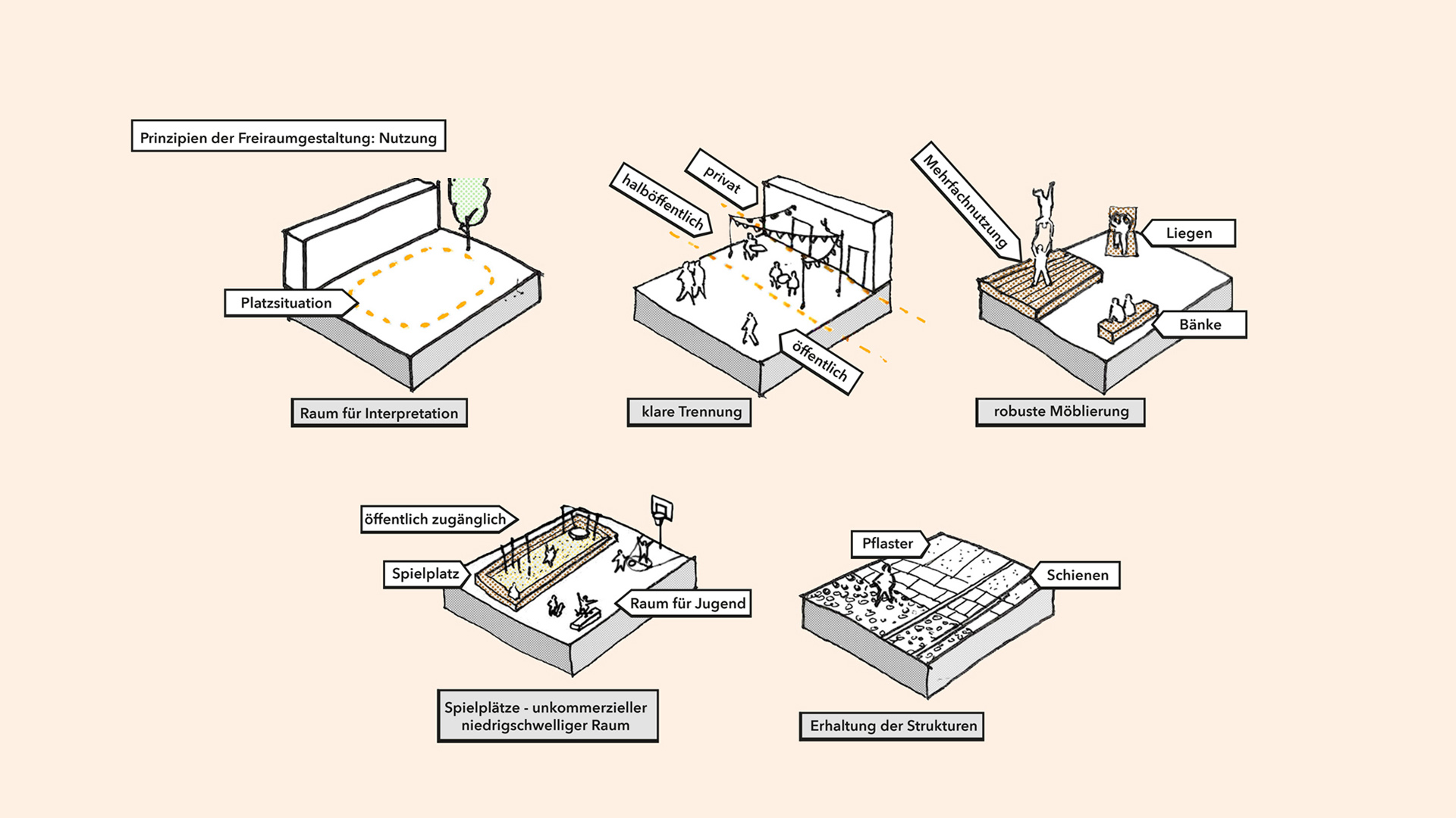 Der Freiraum wurde in der Studie als ein selbständiger Bereich gedacht. Nur dadurch konnte seine Struktur richtig begriffen werden. Es wurden Aspekte wie Raumsequenzen, Verbindungswege, Sonnenbelichtung und Aufenthaltsqualität analysiert. Ein besonderer Fokus lag auf der Abstufung des öffentlichen, halböffentlichen und privaten Raumes.