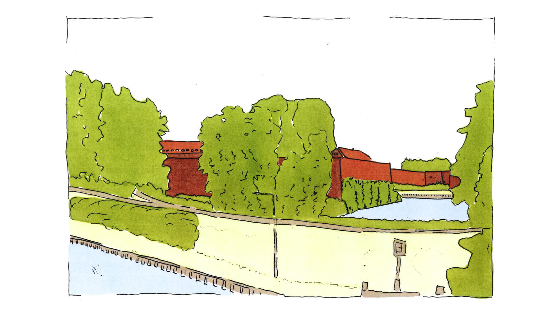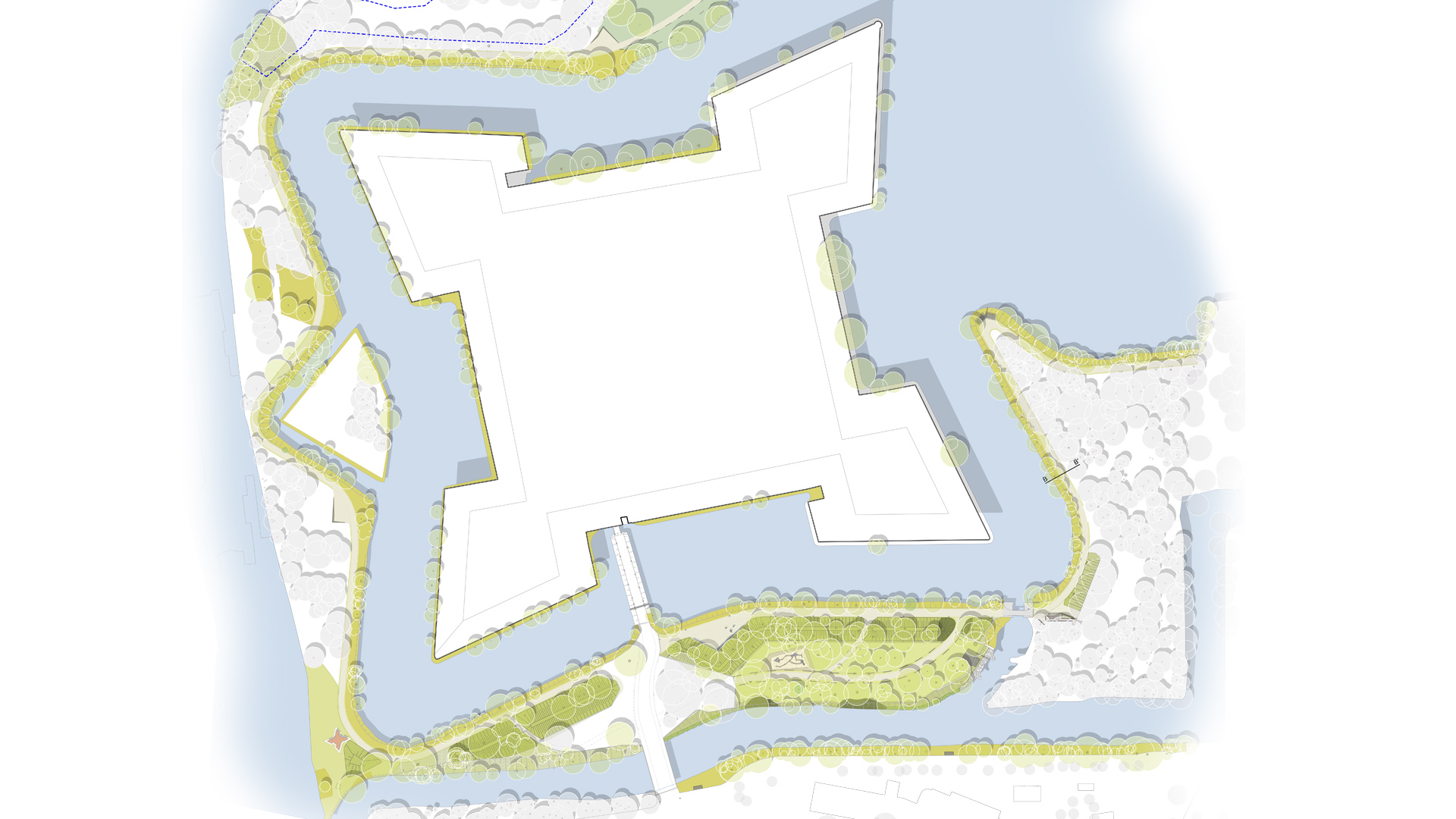 Die Festung und die historischen Wallanlagen werden durch Pflegemaßnahmen der Gehölzflächen entlang der Ufer sowie auf den Wällen wieder stärker sichtbar gemacht sowie teilweise freigelegt. Die Rasenflächen werden zu Wiesen und Saumflächen weiterentwickelt. Durch lockere Steinschüttung befestigte Ufer werden mit Uferstauden- und Gehölzen angereichert. Zum Aufenthalt von Erholungsuchenden werden Aktionsflächen und Aussichtsplattformen angelegt.
