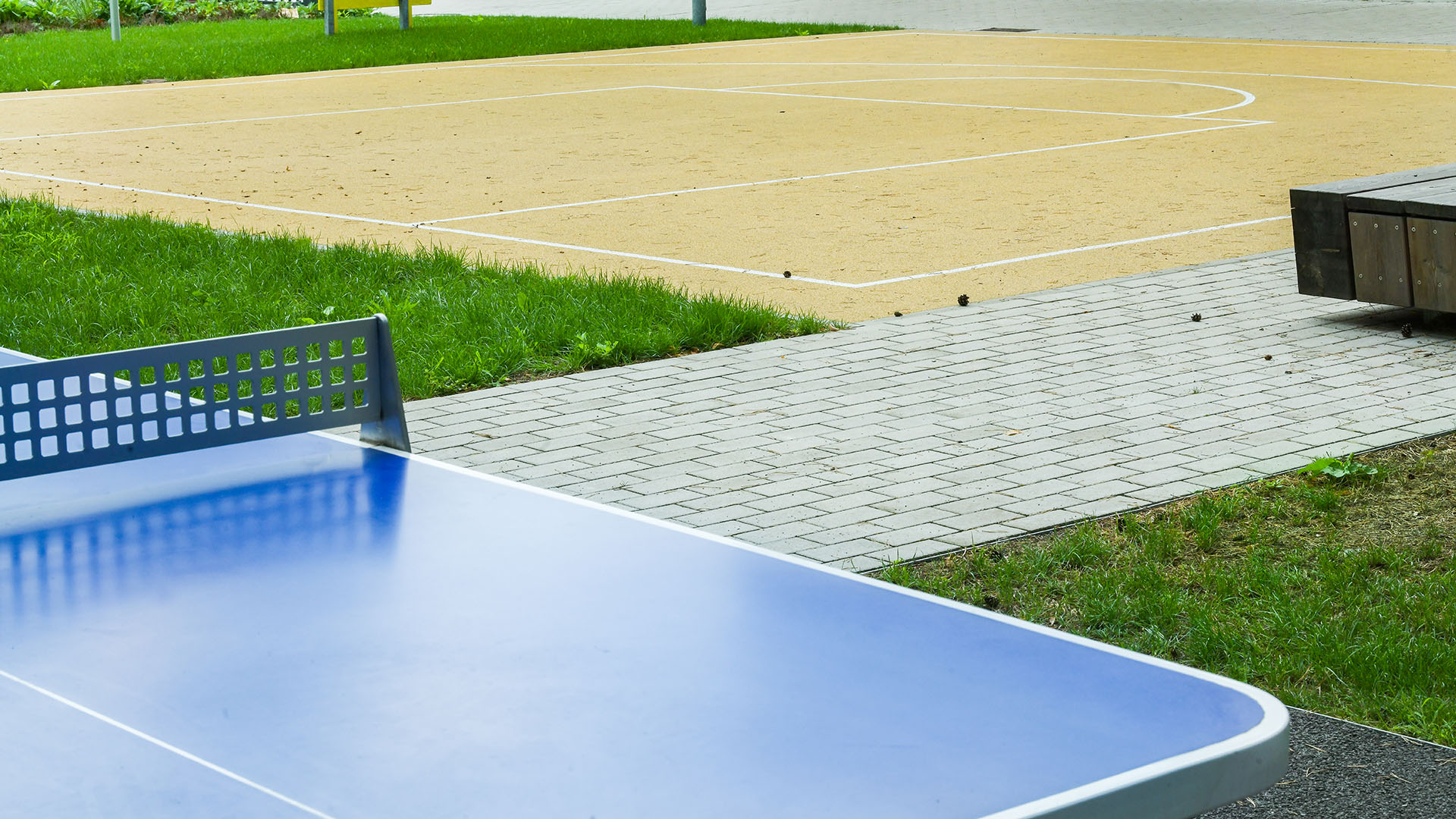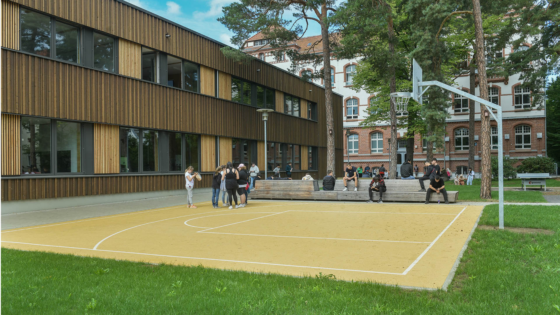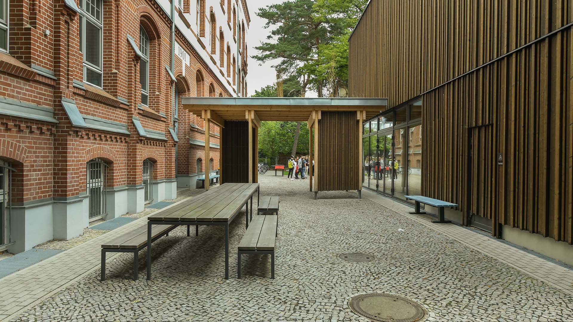 Der neue Pausenhof wird (als eine inhaltliche Erweiterung und Aufweitung) mit den Funktionsbereichen der Werkstätten (Holz – und Metallwerkstatt) des Neubaus korrespondieren, ebenso wird ein Dialog mit den Lehrbereichen des Bestandsgebäudes aufgenommen. So erhält die Pausenfläche mehrere Funktionsbereiche, welche sich dezentral in der Fläche verteilen und durch „Leitbänder“ an den mittleren Hauptweg angebunden sind.
