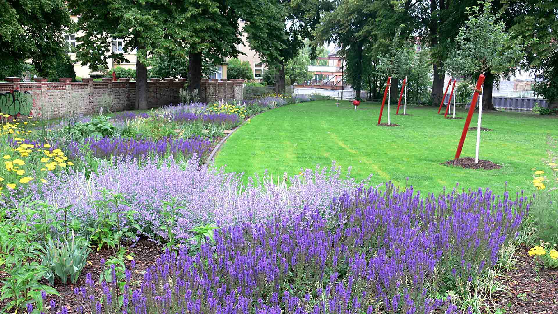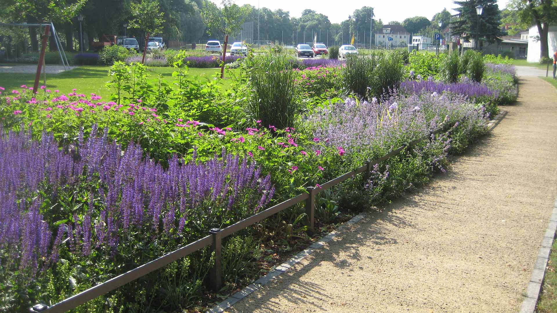 Die Gestaltung dieses öffentlichen Platzes am Wasser in der Havelstadt Zehdenick umfasst eine große zentrale Rasenfläche. Auf diese Rasenfläche sind Zierobstbäume eingestreut. Gerahmt wird die Fläche durch ein großes Staudenbeet mit Frühjahrsblüher sowie verschiedene Stauden-, Sträucher- und Gräserpflanzungen. Der vorhandene, alte Baumbestand wurde in die Gestaltung integriert und bei der Pflanzplanung berücksichtigt. Zwei geschwungene Wege aus wassergebundener Wegedecke führen entlang dieses repräsentativen aber pflegeextensiven Stauden- und Gräserbeetes zur Havel. Die Wege und das Staudenbeet sind durch ein Ziegelband eingefasst, das sich an die alte Ziegeltradition Zehdenicks anlehnt. An der Havel entstanden Sitznischen mit Bänken, in deren Gestaltung ebenfalls das Thema Ziegel aufgegriffen wird. In den Eckbereichen des Platzes zur Havel hin wurden einzelne Spielelemente aufgestellt.