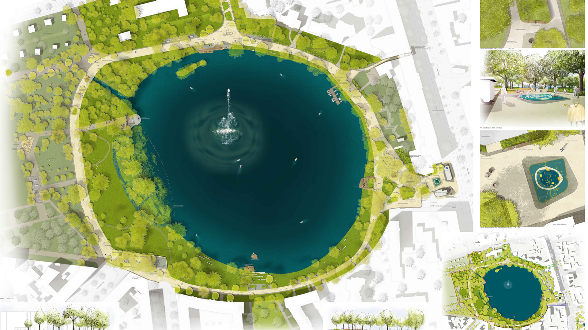 Die Baumalleen werden hierbei als Denkmalachsen aufgenommen und wieder vervollständigt. Besonderes Augenmerk liegt dabei auf den erhaltenen historischen Pflanzstrukturen: Kastanienallee, Lindenallee und Staudengarten. Die Uferzone wird durch Auslichtung des Uferbewuchses sowie Ergänzung und Weiterentwicklung der bestehenden Aussichtsplateaus wieder erlebbar und räumlich besser an den Uferweg angebunden. Die Elemente der historischen Parkanlage werden behutsam und kritisch wiederhergestellt, in ihrer historischen Gestalt erhalten und über den in Wert gesetzten Rundweg miteinander verknüpft.