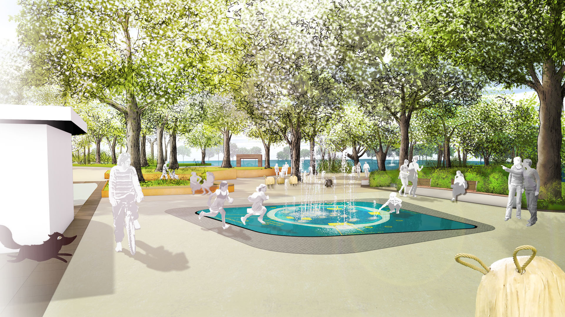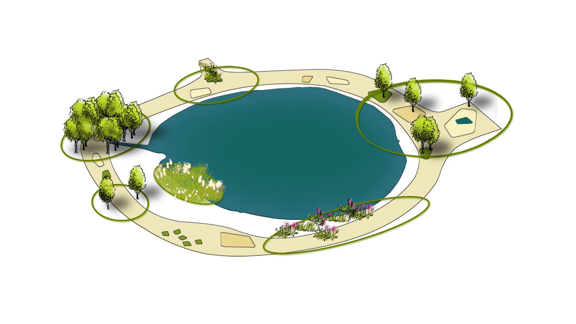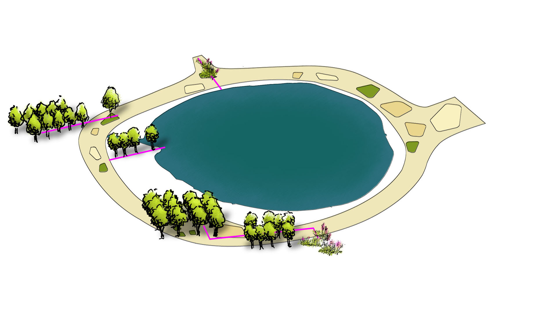 Die großzügige Weite und die Bedeutung des Rundwegs als den Schäfersee umschließende Grünverbindung wird erhalten und gestärkt. Raumbeziehungen zum Wasser werden herausgearbeitet, Kreuzungspunkte zum Ufer und Stadtraum betont. Der Rundweg wird nachhaltig und barrierefrei befestigt, um allen Nutzern ein sicheres und bequemes Vorankommen zu ermöglichen. Stellenweise werden unterschiedlich große Inseln aus dem hellen Asphaltbelag herausgeschnitten und mit wasserdurchlässigen Belägen und Grünflächen versehen. Diese sog. Cut-Outs nehmen unter Anderem Bestandsbäume und Neupflanzungen auf. Aber auch vielfältige andere Nutzungsmöglichkeiten und Aufenthaltsangebote finden sich hier. Diese inselartigen Ausschnitte sind in ihrer Form den fließenden Bewegungsströmen der Besucher angepasst und lockern den Uferweg auf.