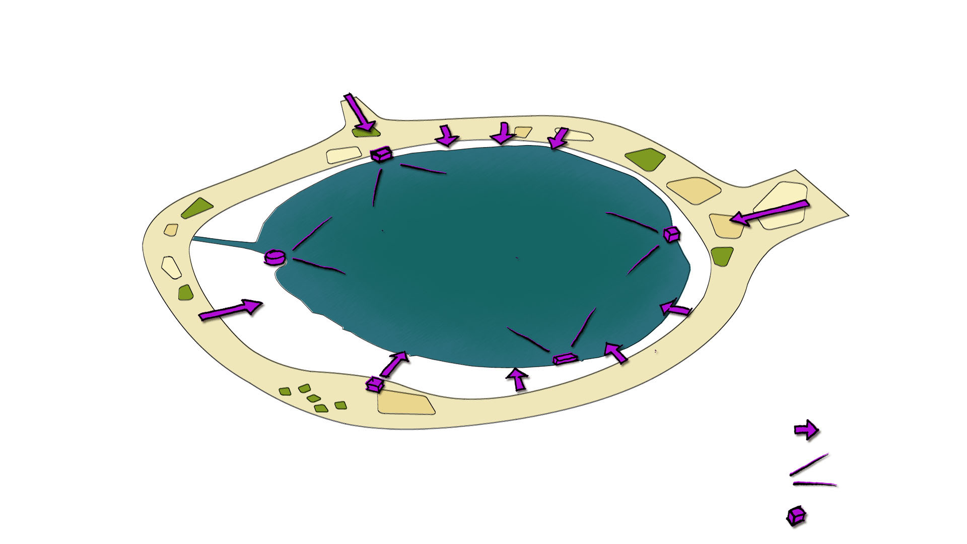 Die unterschiedlichen Atmosphären der am Rundweg angelagerten Biotope werden weiterentwickelt und in ihrer Einzigartigkeit gestärkt, dadurch stehen sich offene und eher dichte Parkbestandteile sowie unterschiedliche grüne Atmosphären wieder spannungsvoll gegenüber. Querungen an Wegen werden herausgearbeitet und zu individuellen Orientierungspunkten.