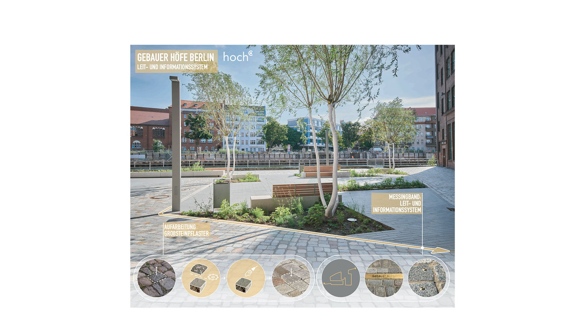 Der industrielle Charakter der zum Teil gründerzeitlichen Bebauung wird durch das gesägte Großsteinpflaster unterstrichen. Die Markierung der Durchwegung erfolgt über Markierungsnägel. Die gesamten Gebauer Höfe werden als Shared Space ausgelegt.