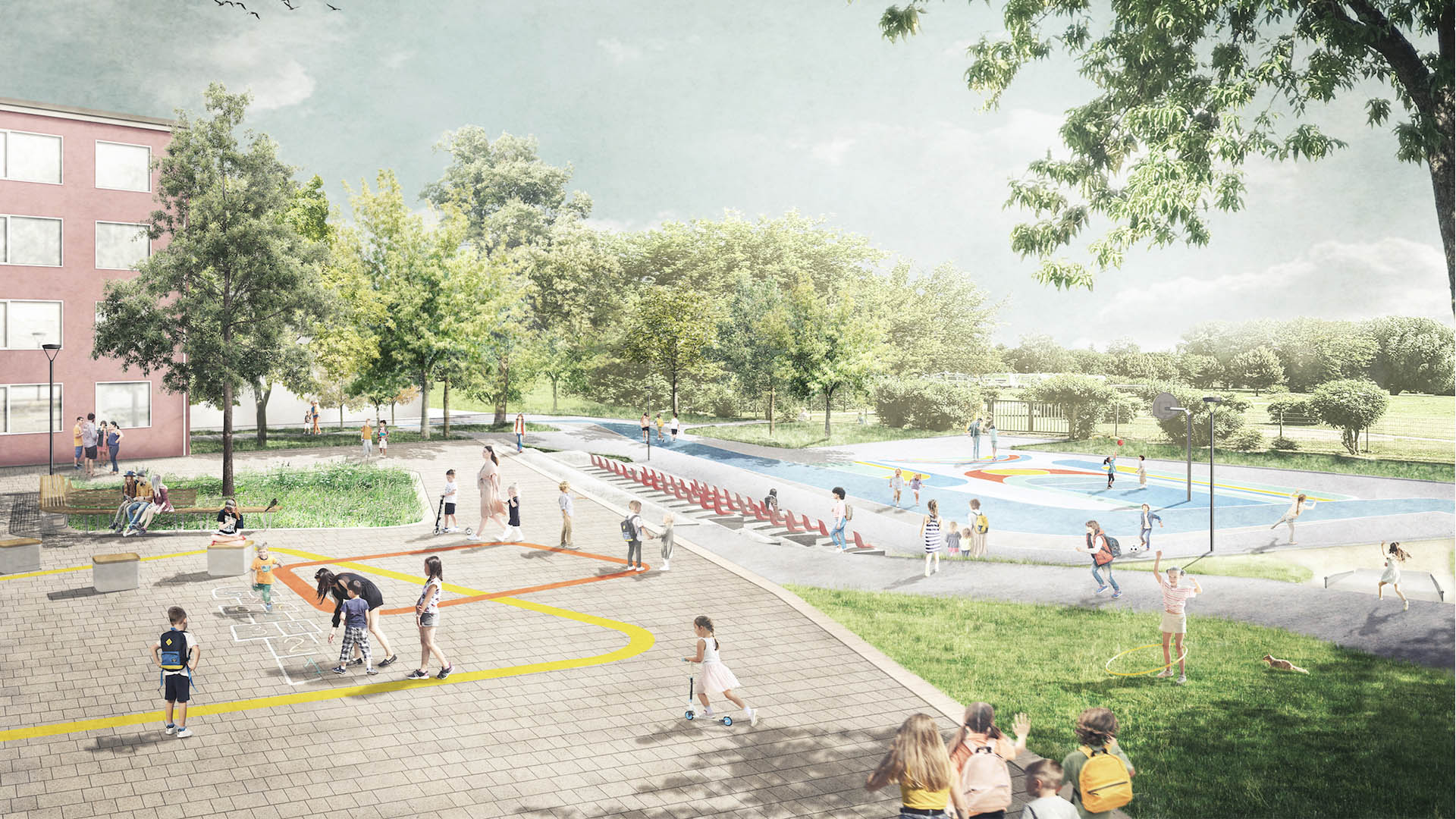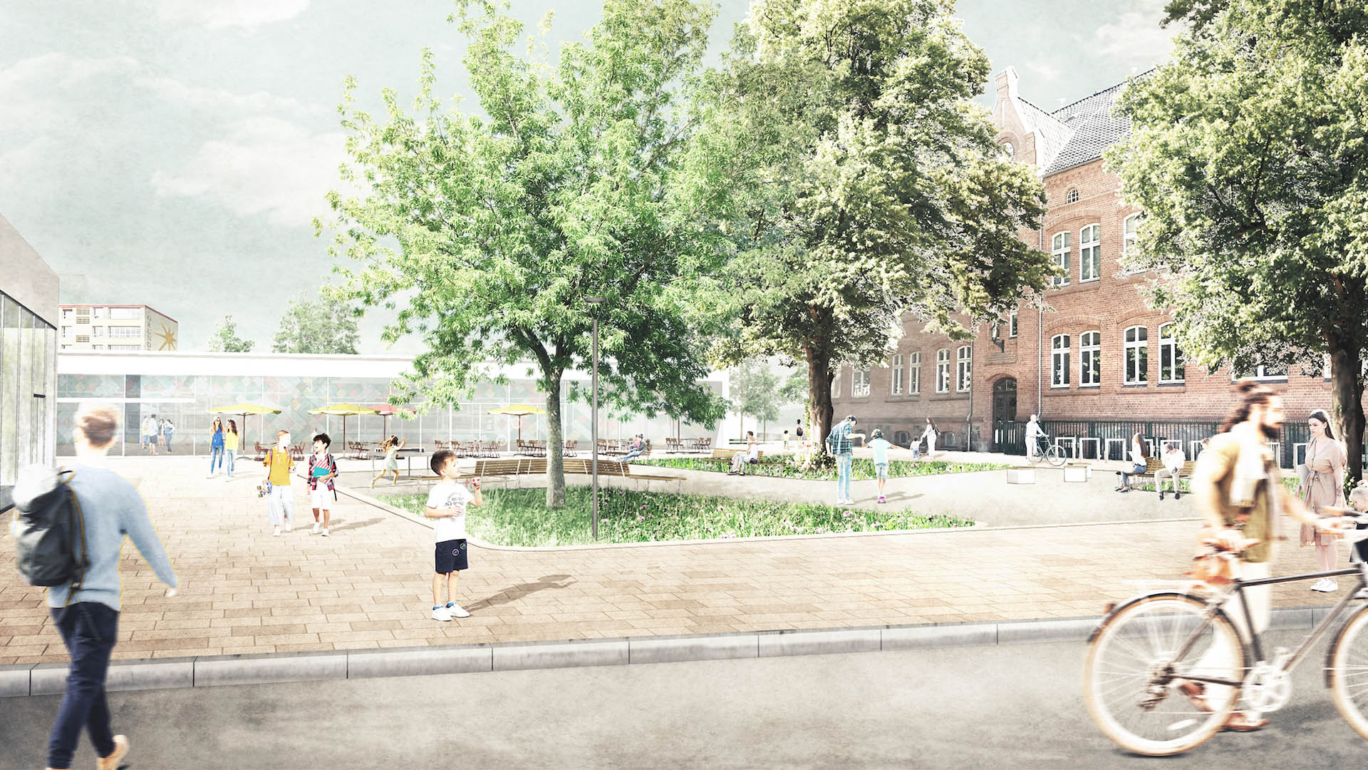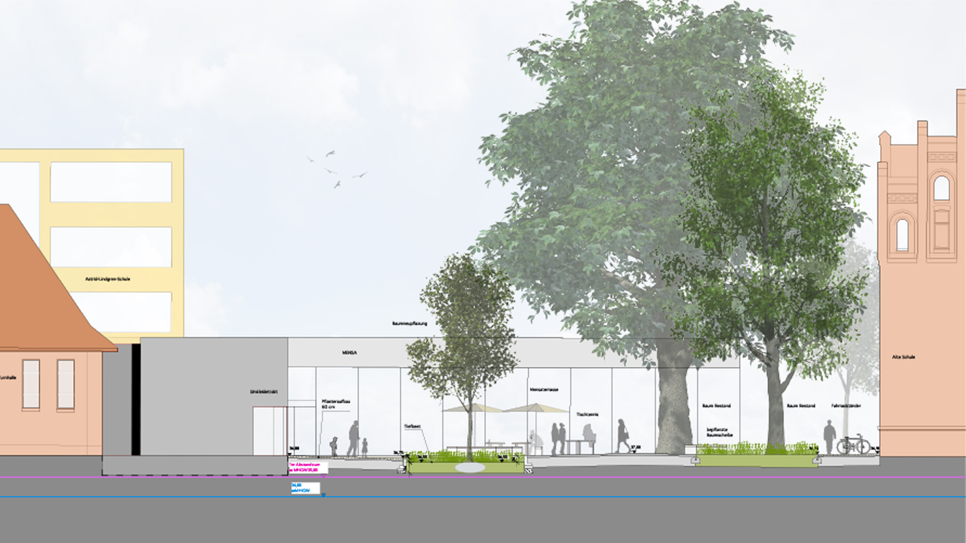 Der durch den Mensabau neu entstehende Vorplatz ist ein halböffentlicher Raum, welcher als Aufenthaltsraum für Schule und Hort genutzt werden kann, aber auch in den Abendstunden oder an Wochenenden als öffentlicher Platz zugänglich ist. Hier wird der Platzbelag komplett erneuert indem teppichartig eine Fläche aus wasserdurchlässigem Asphalt in die umschließende Pflasterfläche eingelegt wird. Die Bestandsbäume werden ergänzt und Sitzgelegenheiten vorgesehen.