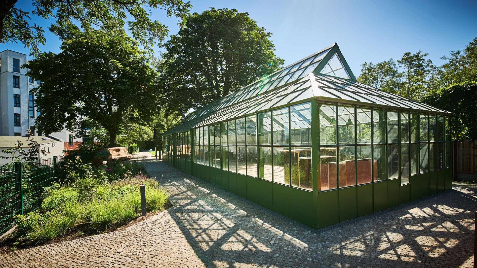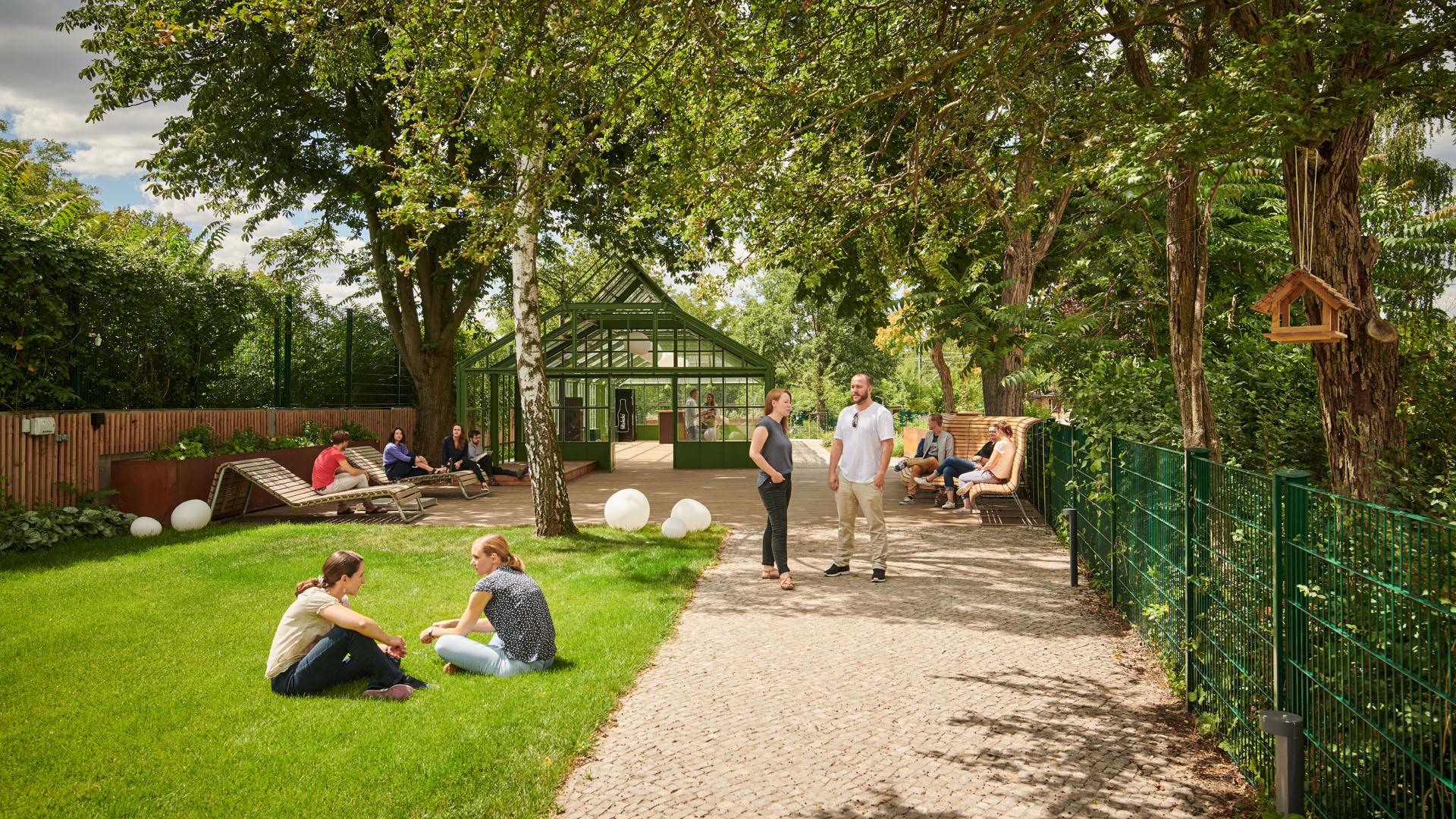 Gelegen zwischen denkmalgeschützten Gebäuden und dem Bahngelände gehörte die Freifläche ursprünglich zu einer Kleingärtneranlage. Einige Bestandbäume wurden erhalten und schenken eine idyllische Atmosphäre. Der Garten ist als grüner Erholungsort angelegt, in dem die Angestellten der ansässigen Firmen ihre Pause verbringen können, Meetings stattfinden und im Sommer ein attraktiver Standort für ein Bistro sein kann.