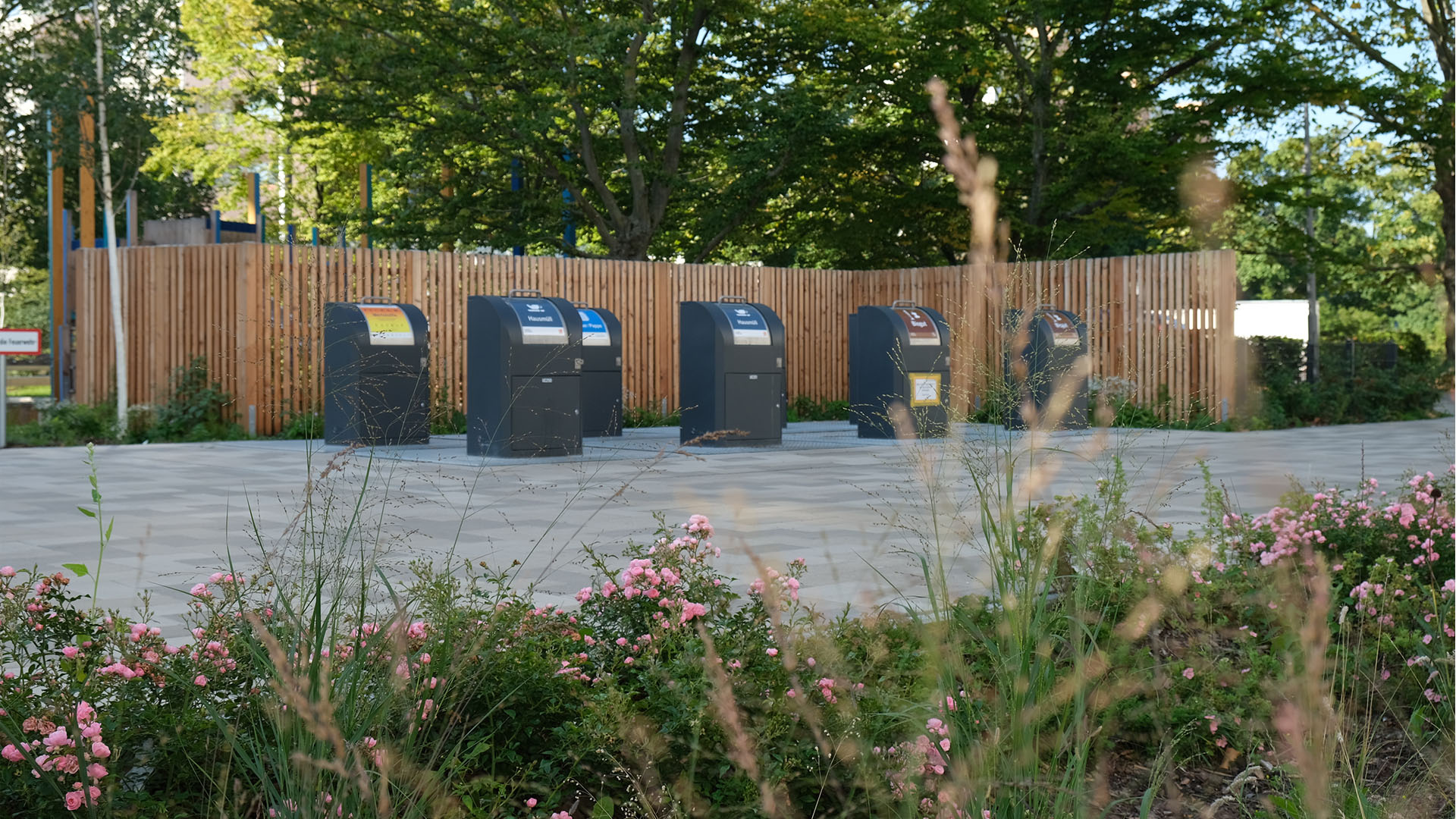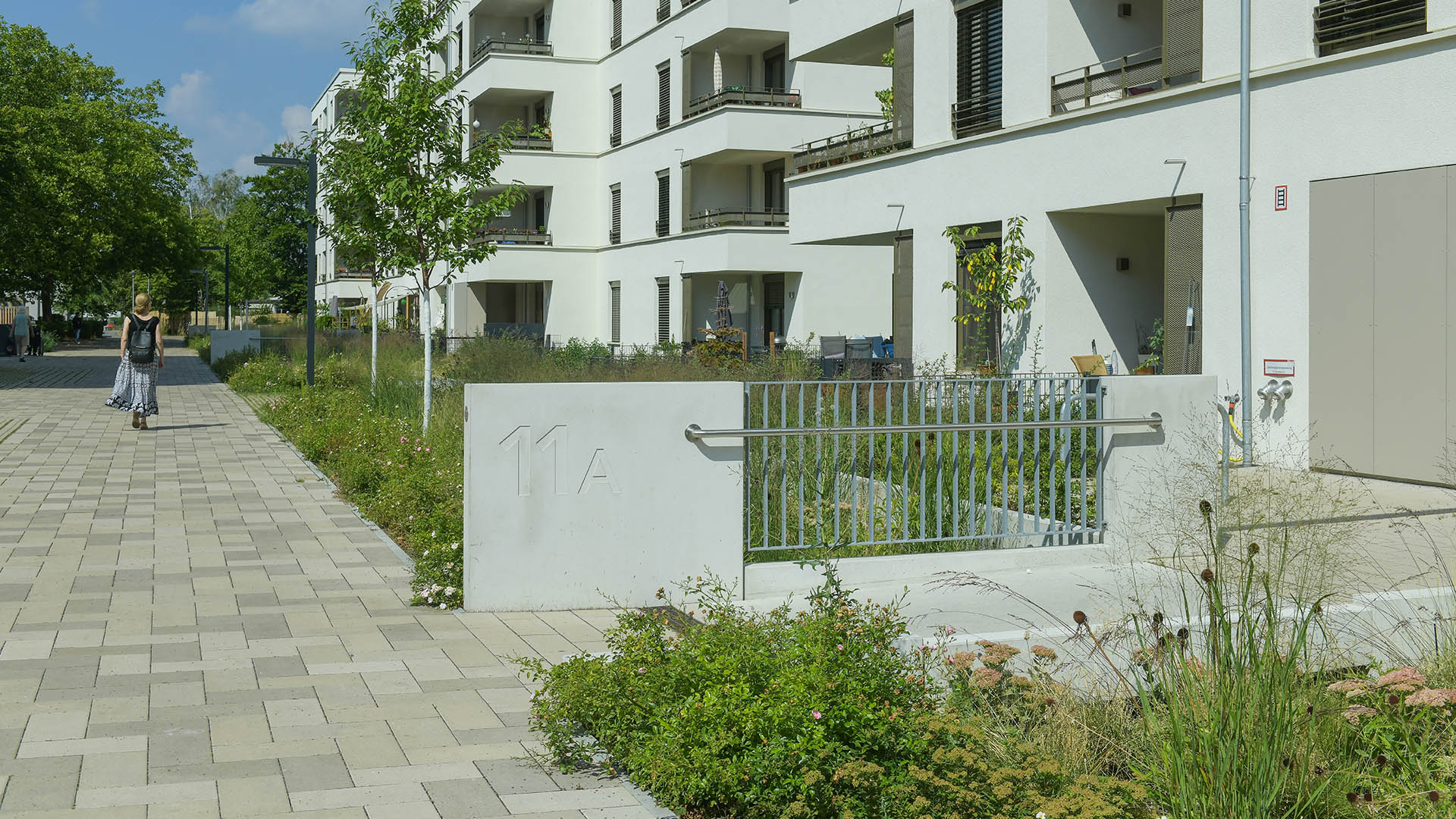 Das anfallende Niederschlagswasser von Dachflächen und Freianlagen wird auf dem Grundstück versickert. Das auf den extensiv begrünten Flachdächern der Gebäude anfallende Wasser wird über Fallrohre in den Bereich der Mieterterrassen geführt und von der Fassade über Rinnen in Tiefbeete und Mulden geleitet.