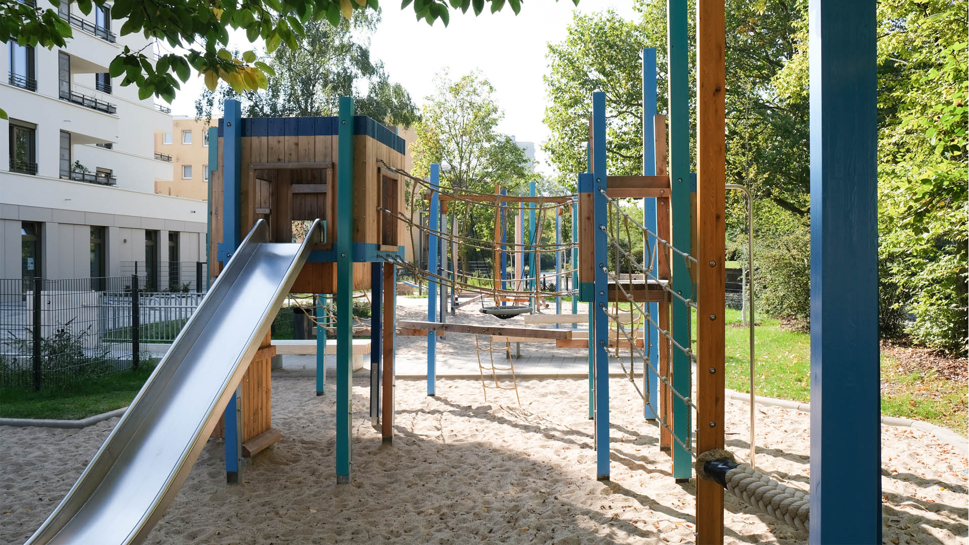 Für das Quartier wird am westlichen Grundstücksrand ein Spielplatz für verschiedene Altersgruppen geplant. Gegenüber dem Bewohnertreffpunkt im zentralen Gebäude soll der Kleinkinderbereich entstehen. Außerdem ist ein Spielbereich für ältere Kinder angrenzend an den Kita-Außenbereich geplant.