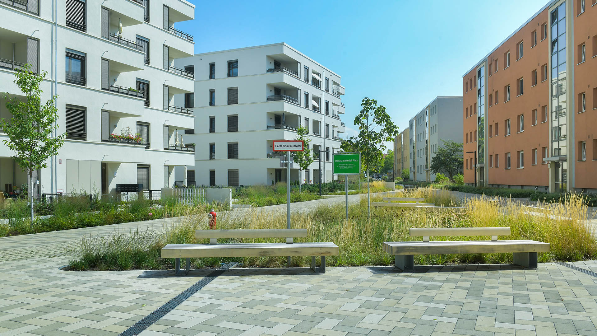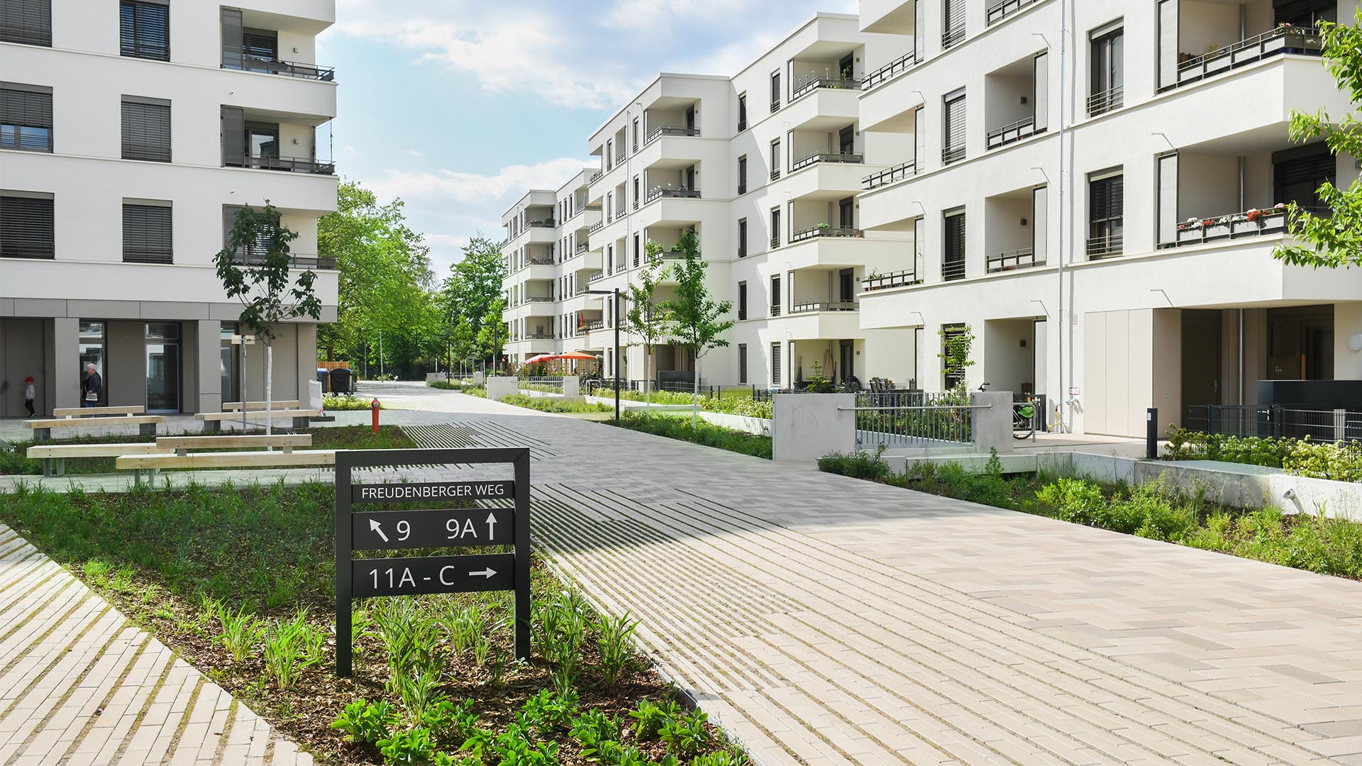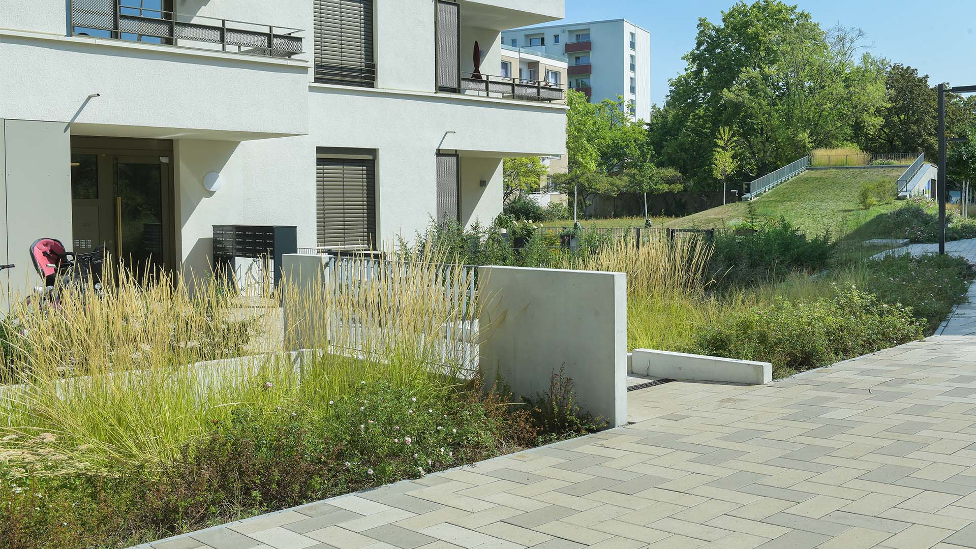 Architektur und Freiraum sollen dafür sowohl gestalterisch als auch funktional eine Einheit bilden. Es wird angestrebt, dass sich das neue Quartier mit den angrenzenden, bestehenden Wohngebäuden verzahnt ohne eine Barrierewirkung auf den Bestand zu haben. Dafür sollen insbesondere bestehende Wege- und Blickverbindungen der Nutzer erhalten und gestärkt werden. Das verbindende Zentrum der neuen und bestehenden Wohngebäude bildet ein großzügiger Platz. Die Grünflächen in seinem Zentrum sind mit einer flächigen, artenreichen Pflanzung versehen.