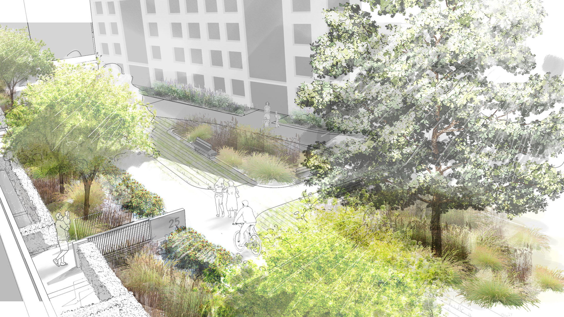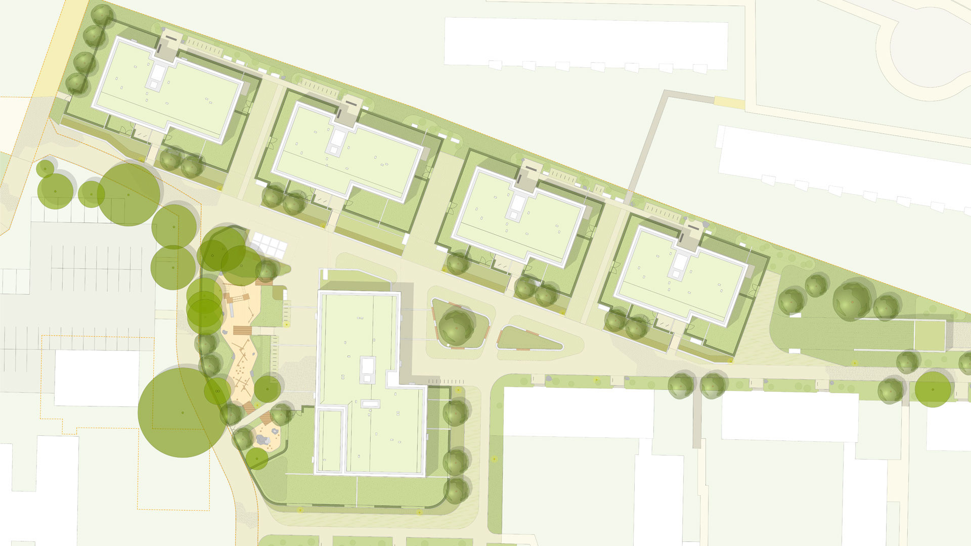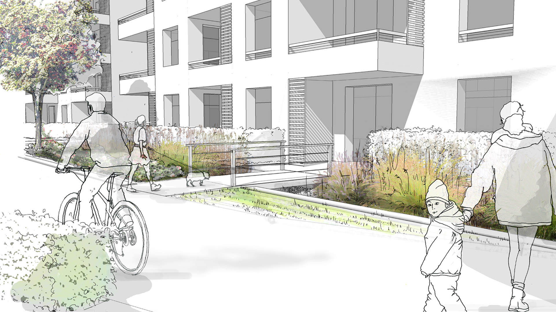 Architektur und Freiraum sollen dafür sowohl gestalterisch als auch funktional eine Einheit bilden. Es wird angestrebt, dass sich das neue Quartier mit den angrenzenden, bestehenden Wohngebäuden verzahnt ohne eine Barrierewirkung auf den Bestand zu haben. Dafür sollen insbesondere bestehende Wege- und Blickverbindungen der Nutzer erhalten und gestärkt werden. Das verbindende Zentrum der neuen und bestehenden Wohngebäude bildet ein großzügiger Platz. Die Grünflächen in seinem Zentrum sind mit einer flächigen, artenreichen Pflanzung versehen.