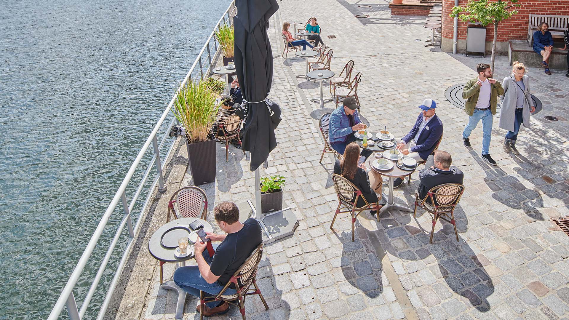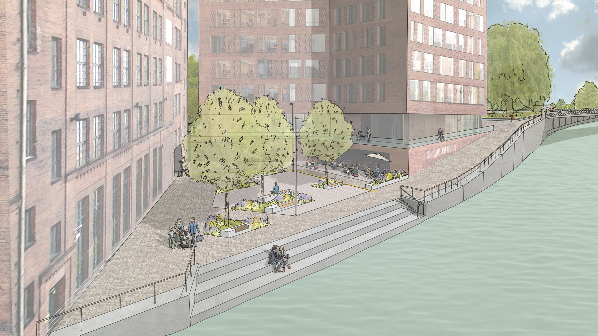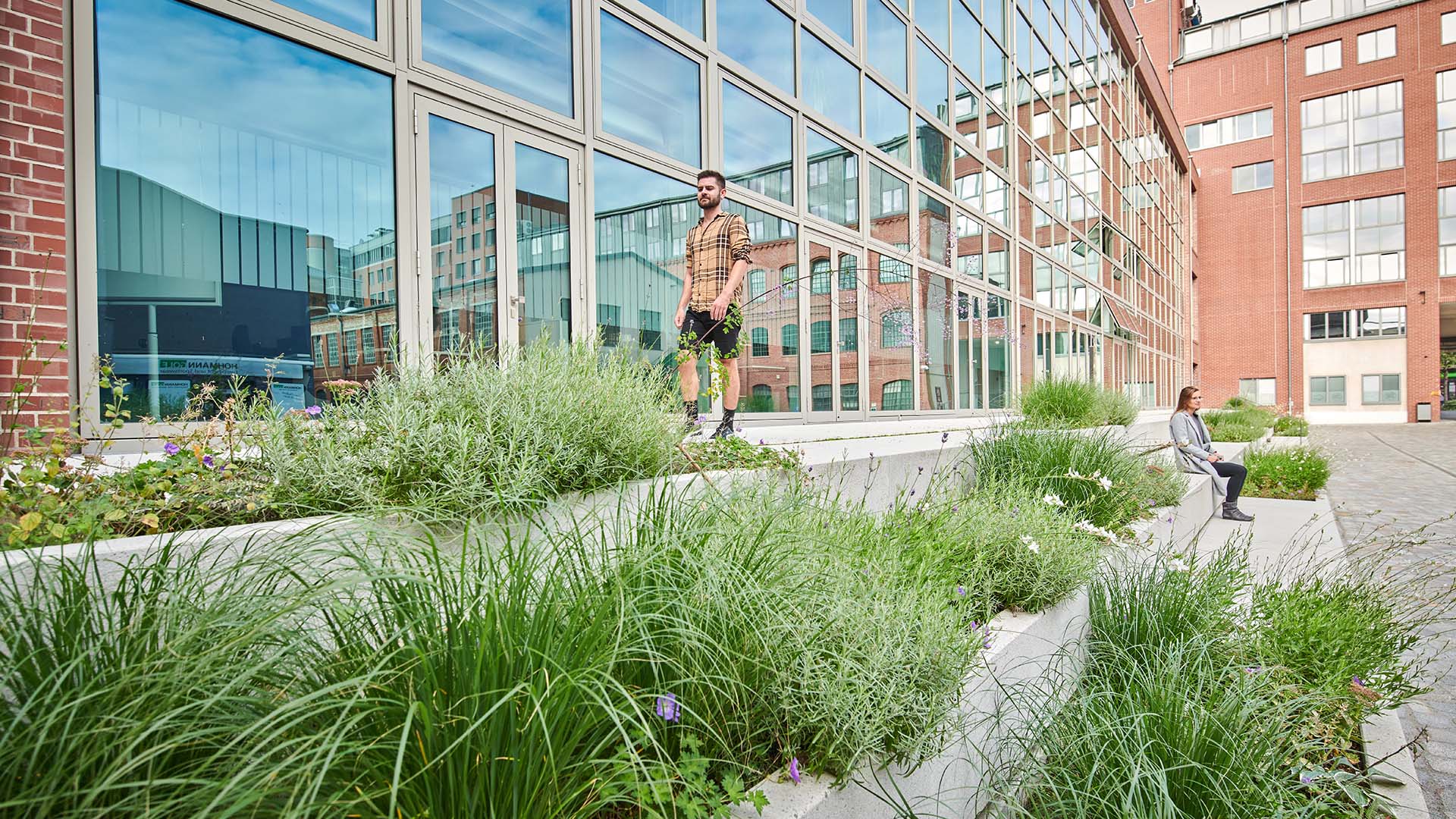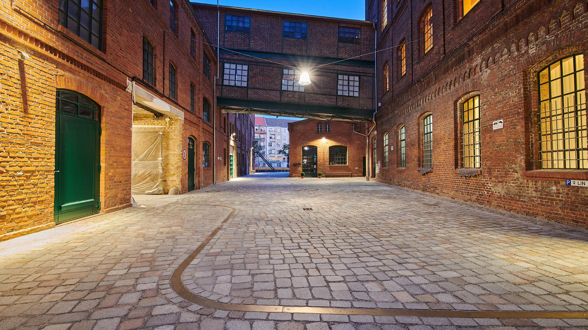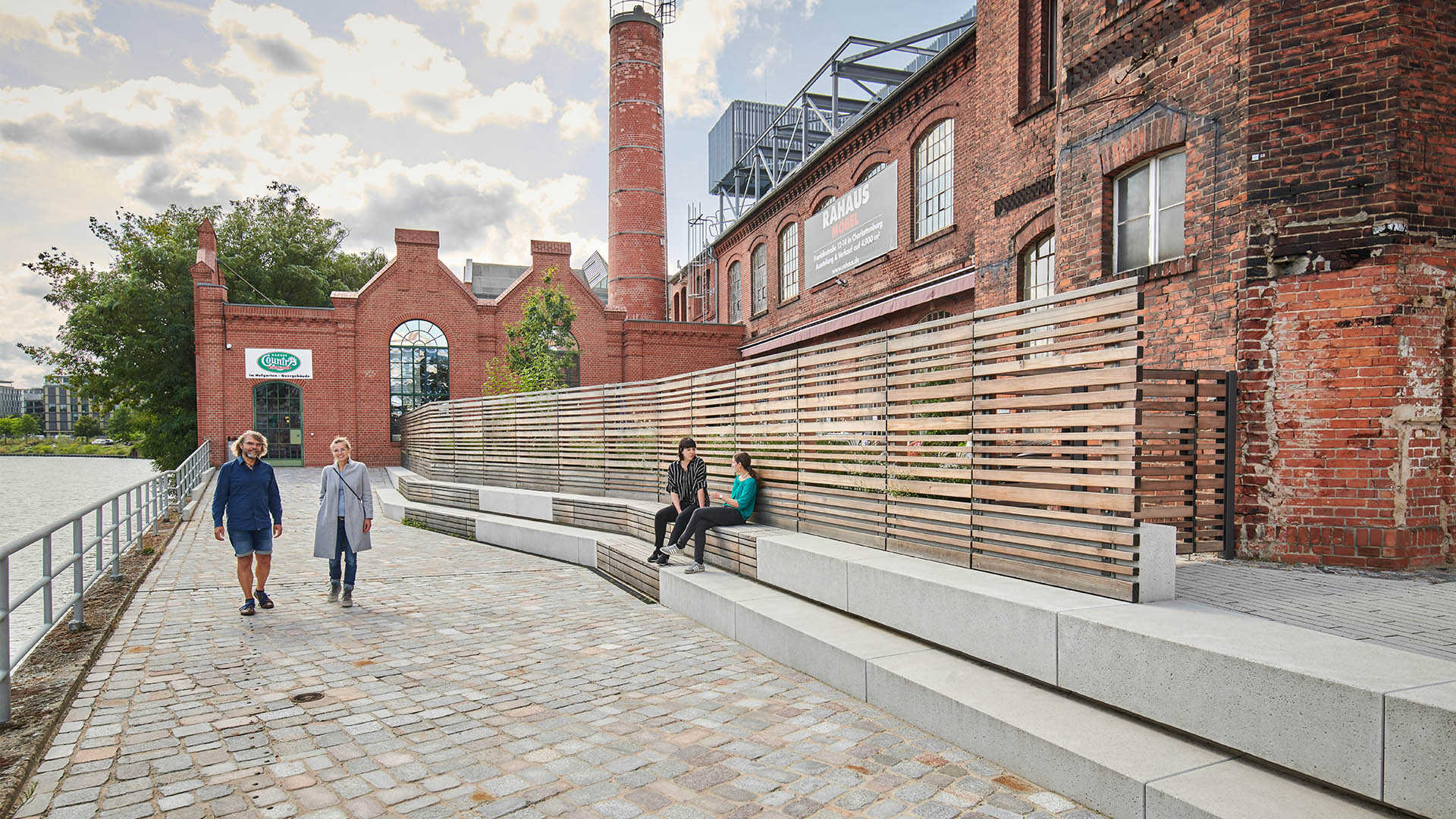 Darüber hinaus werden auf der Spreeseite neue Aufenthaltsbereiche durch Terrassenanlagen mit Sitzstufen, ausgerichtet zur Spree, geschaffen und damit die Aufenthaltsqualität gesteigert. Messingfarbene Nägel im Boden markieren die mit der Stadt Berlin vereinbarte öffentliche Durchwegung. Die von Norden an die Gebauer Höfe stoßende öffentliche Verbindung entlang der Spree soll mit Abschluss der Neu- und Umbaumaßnahmen in den Gebauer Höfen zukünftig geöffnet werden. Vor allem Hof 1 und Hof 2 werden hauptsächlich in ihrer Funktion als Gewerbehof mit allen Möglichkeiten für den ruhenden und fließenden Verkehr belassen. Durch das Hinzufügen des einheitlichen Belags mit gestalterisch ansprechender Oberfläche und die punktuelle Ergänzung von Ausstattungselementen, Pflanzungen und einer Sitzstufenanlage vor dem Umbau The Briq wird auch in dem sehr verkehrslastigen Hof 2 eine hohe Aufwertung erzielt.