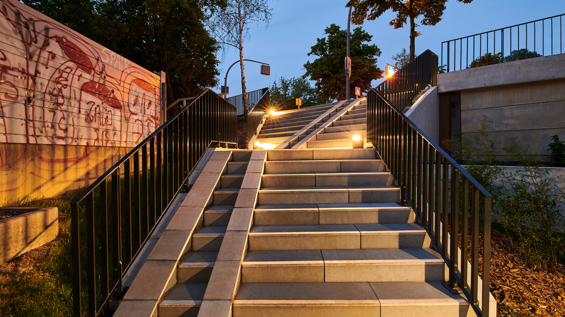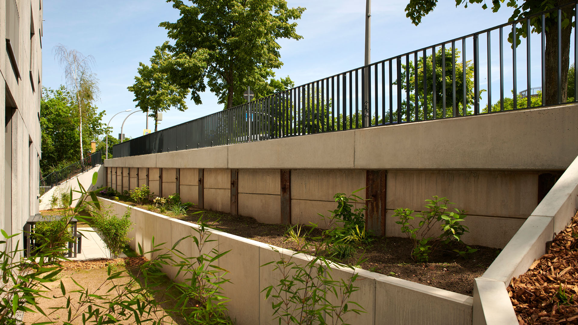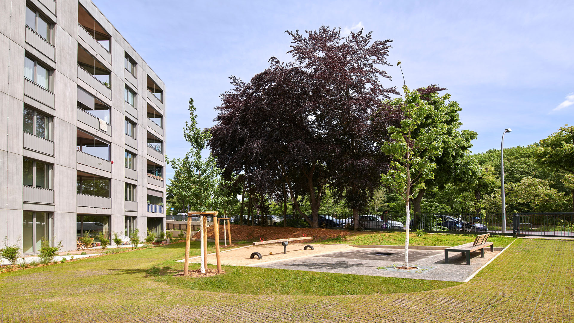 Die Erschließung des Gebäudes erfolgt von der nördlichen Gebäudeseite aus, vom Straßenniveau führt eine schräg angeschnittene Treppe hinab zu den drei Hauszugängen. An den nach Südwesten ausgerichteten Loggien im EG werden Terrassen mit kleinen Privat-gartenbereichen hergestellt und mittels Bambushecken voneinander abgegrenzt. Südlich der privaten Gartenzone ist der gesamte Gartenbereich gemeinschaftlich nutzbar, dort wird ein kleiner Gemeinschaftsplatz mit Sandspielbereich angelegt.
