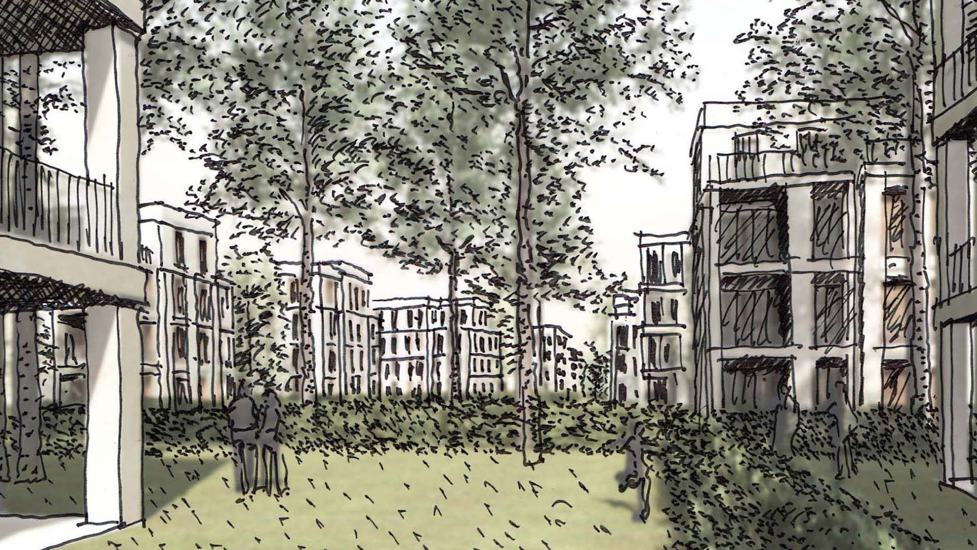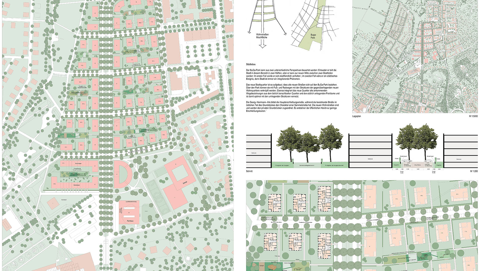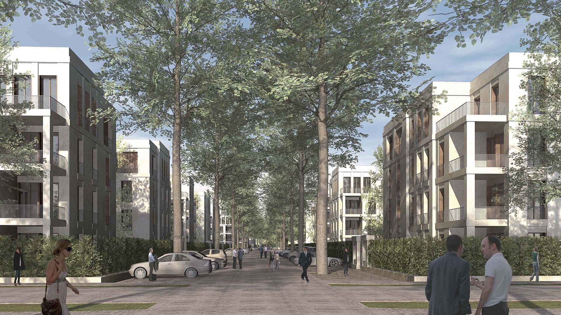 Der Entwurf geht von der These aus, dass die qualitätsvollsten Wohnlagen der europäischen Stadt die klassischen Innenstadtquartiere und Vorstädte sind. Obwohl die einzelnen Häuser solitär stehen und eine starke individuelle Ausprägung haben, bilden und prägen sie den Straßenraum. Sie besitzen elegante Proportionen und schmücken durch ihre Gestaltung den Straßenraum. Diese Quartiere ermöglichen ein Wohnen im Grünen bei gleichzeitig hoher städtischer Qualität. Die Straßen im Quartier sind Wohnstraßen mit grundstückszugeordneten Parkplätzen. Als Bäume in den Wohnstraßen werden Goldgleditschien gepflanzt. Durch deren alleeartige Anordnung kann der ruhende Verkehr sinnvoll integriert werden. Eine Vorgartenhecke und der Sockelversprung schirmen die Gartenbereiche durchgehend von den halböffentlichen Wohnstraßen ab. Diese privaten Gartenzonen weisen eine robuste und qualitätvolle Grundgestaltung auf, bieten den Bewohnern jedoch auch individuelle Ausstattungsspielräume. In den Innenhöfen befinden sich gemeinschaftlich nutzbare Gartenbereiche, in die z.B. Kleinkinderspielplätze und Aufenthaltsplätze integriert werden.