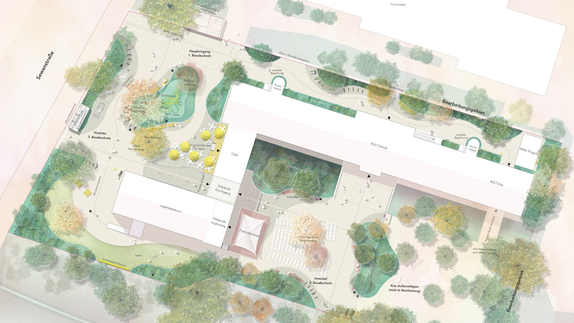 Die Gestaltung der Freianlagen soll einen einheitlichen Raum für das vielfältige Angebot der KULT Schule bieten und gleichzeitig der vielseitigen Kreativität und den verschiedenen Nutzungen gerecht werden. Insgesamt gliedert sich der Außenraum in vier Bereich auf. Im Westen befinden sich die Haupteingangsbereiche der Schule und der Kita, im Süden der Vorplatz angegliedert an die Sewanstraße, im Osten der Innenhof mit dem Kitafreiflächen und im Südosten der Außenraum des Jugendclubs.