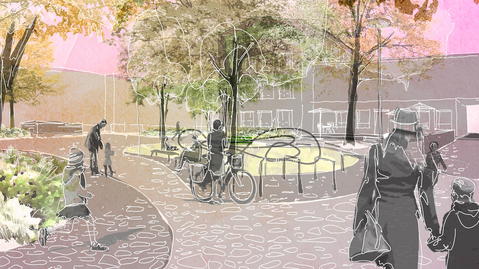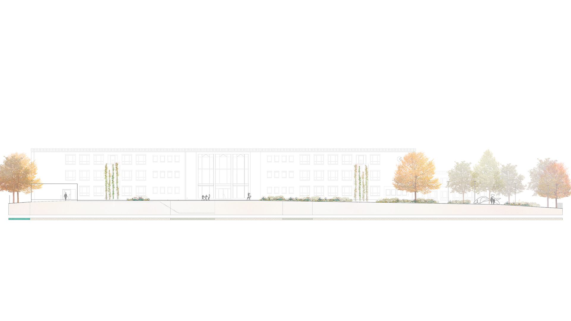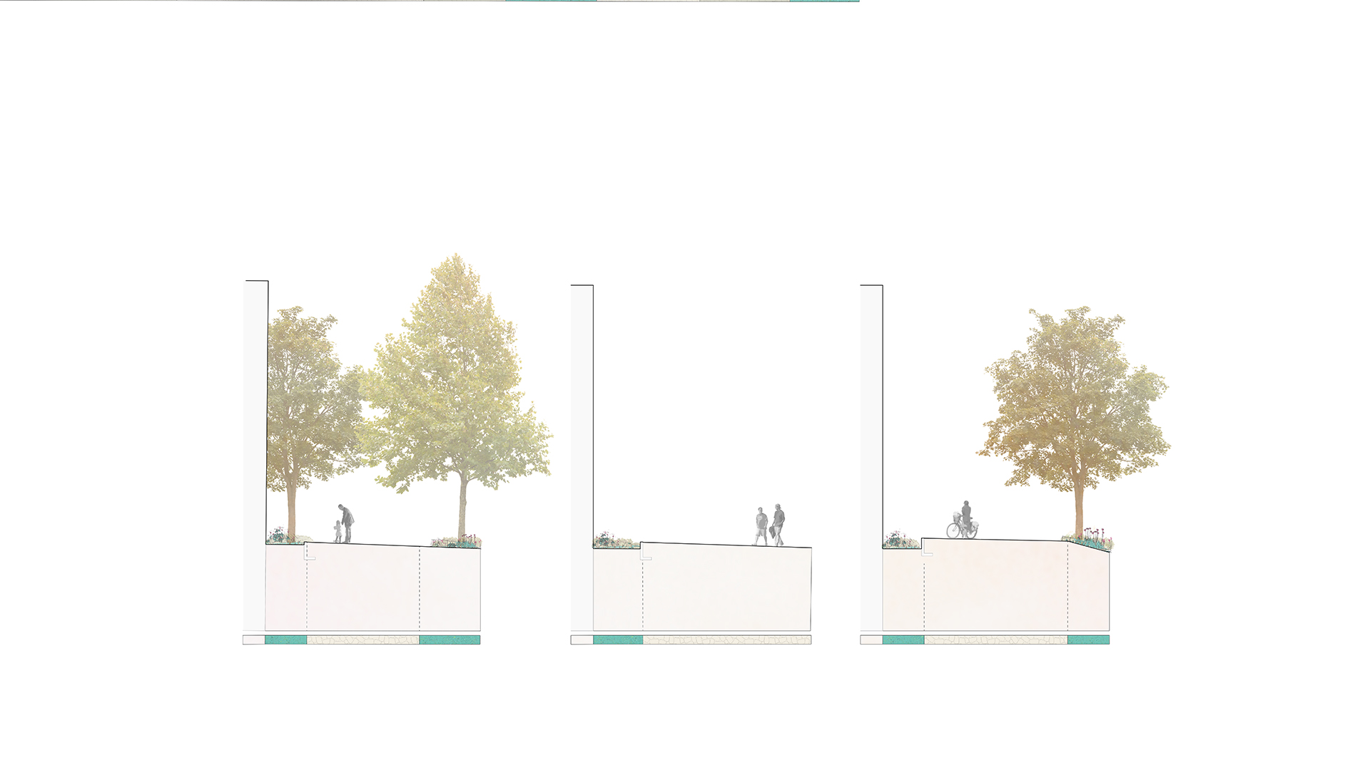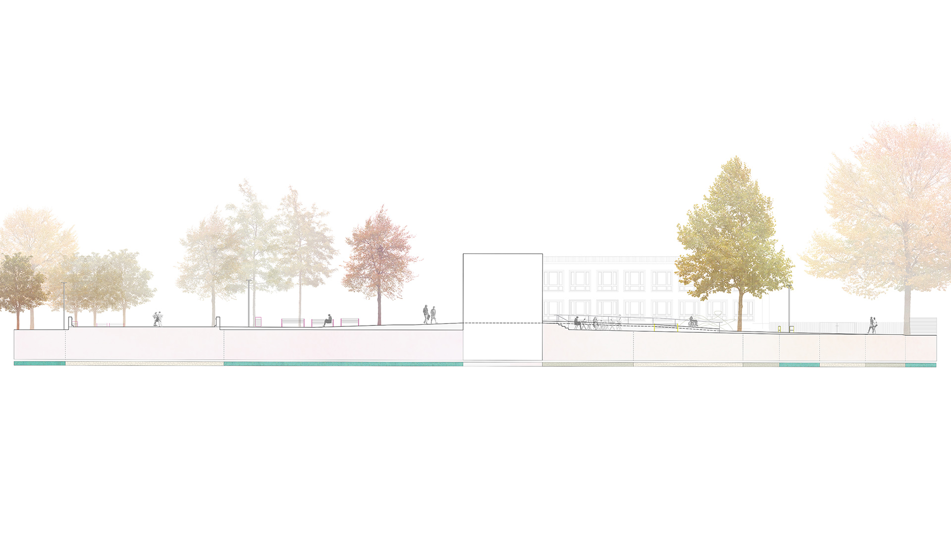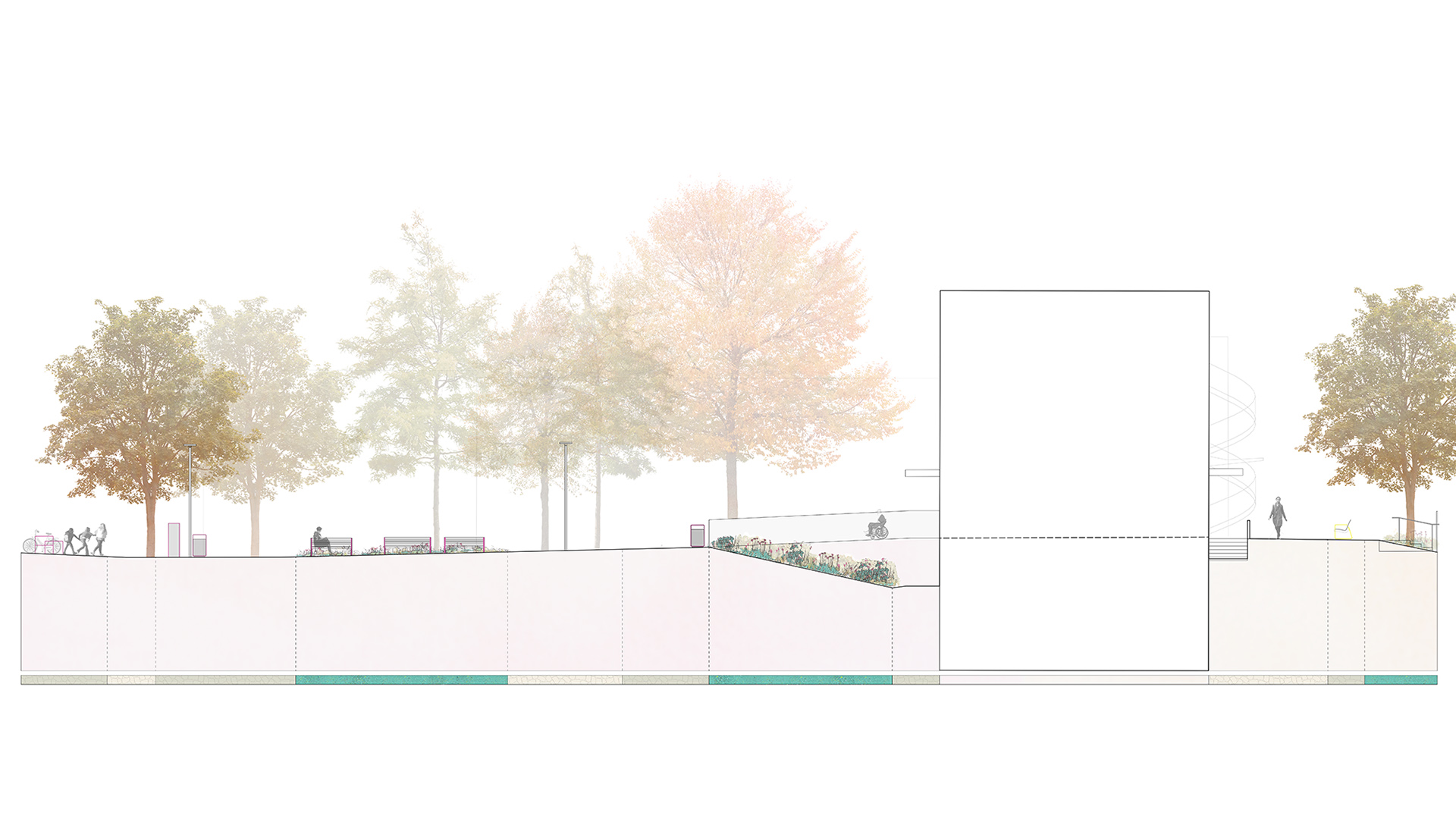 In die organische Gestaltung fügen sich verschiedene ‚Aktivbänder‘ ein, welche Bewegungsflächen, Bänke, Fahrradstellplätze, PKW-Stellplätzen integrieren. Die Grünflächen und grünen Platzinseln dienen der klimatischen wie gestalterischen Aufwertung und werden gleichzeitig als Entwässerungsflächen genutzt.