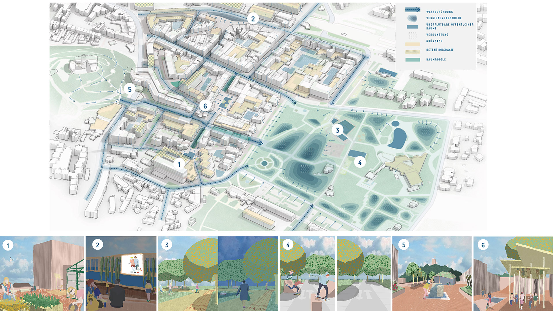 Kleine grüne Flächen im Straßenraum und auf den Dachflächen sowie neue Plätze werden wassersensibel gestaltet. Dezentrale Flächenentsiegelungen und Neubepflanzungen mit klimaresilienten Bäumen sind Teil der Maßnahme für die Klimaanpassung der Stadt. Der Kurpark wird außerdem als „Schwammpark“ aktiviert.