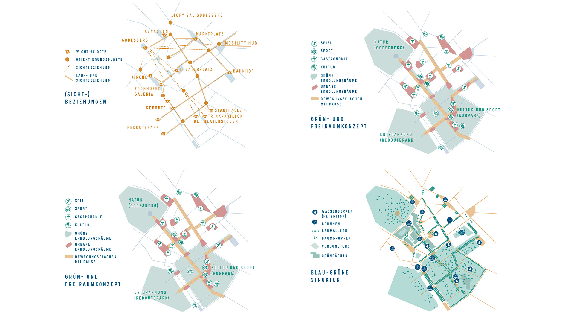 Eine neue Verbindung zwischen Kurpark und Godesberg durch eine Brücke wird erstellt. Der Berg ist als naturnaher Erlebnisraum vorgesehen. Der Kurpark wird mit vielseitigen Gemeinschafts- und Bewegungsflächen für alle Generationen sowie seinen vorhanden Kulturangeboten als urbaner Stadtpark interpretiert.