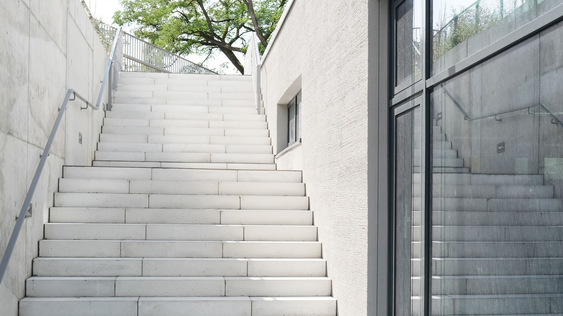 Die denkmalgeschützte Flügelmauer wurde freigestellt und von der Yorckstraße aus wieder sichtbar. Zwischen dem nördlichen Ende der Flügelmauer und dem Sockelgeschoss des Neubaus wurde eine Geländefuge in Form einer Treppe zur Belichtung der Räume ausgebildet. Sie ermöglicht den Zugang zum höher gelegenen Niveau sowie zum Gleispark. Die südliche Wange der Treppe wurde durch eine Stützwand aus hochwertigem Sichtbeton ausgeführt.
