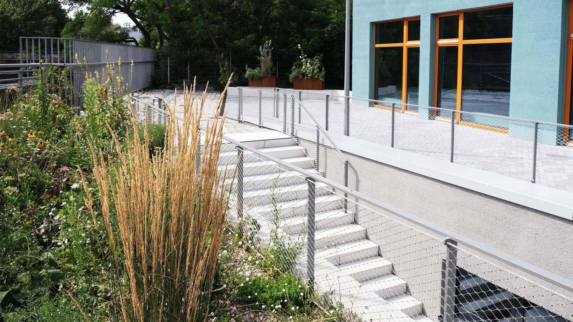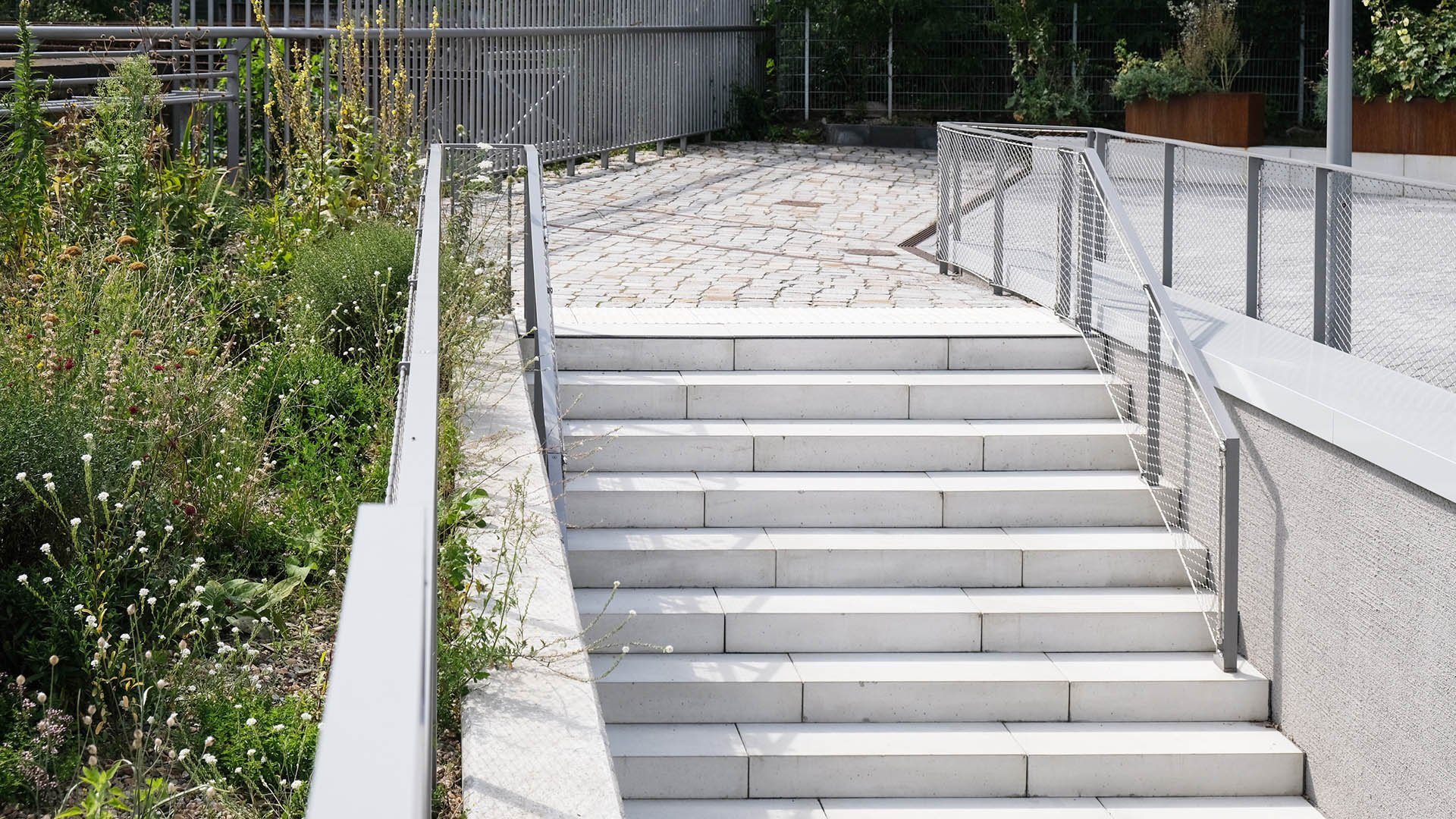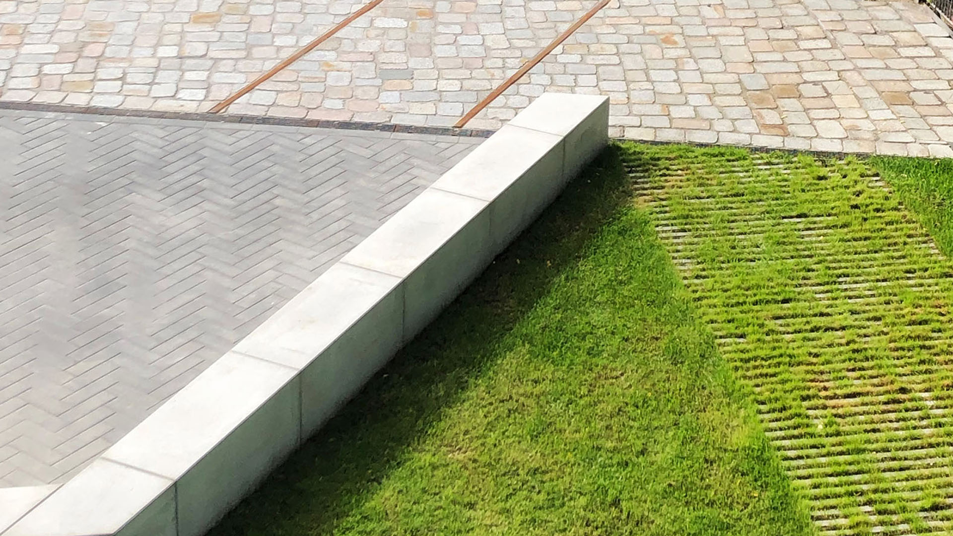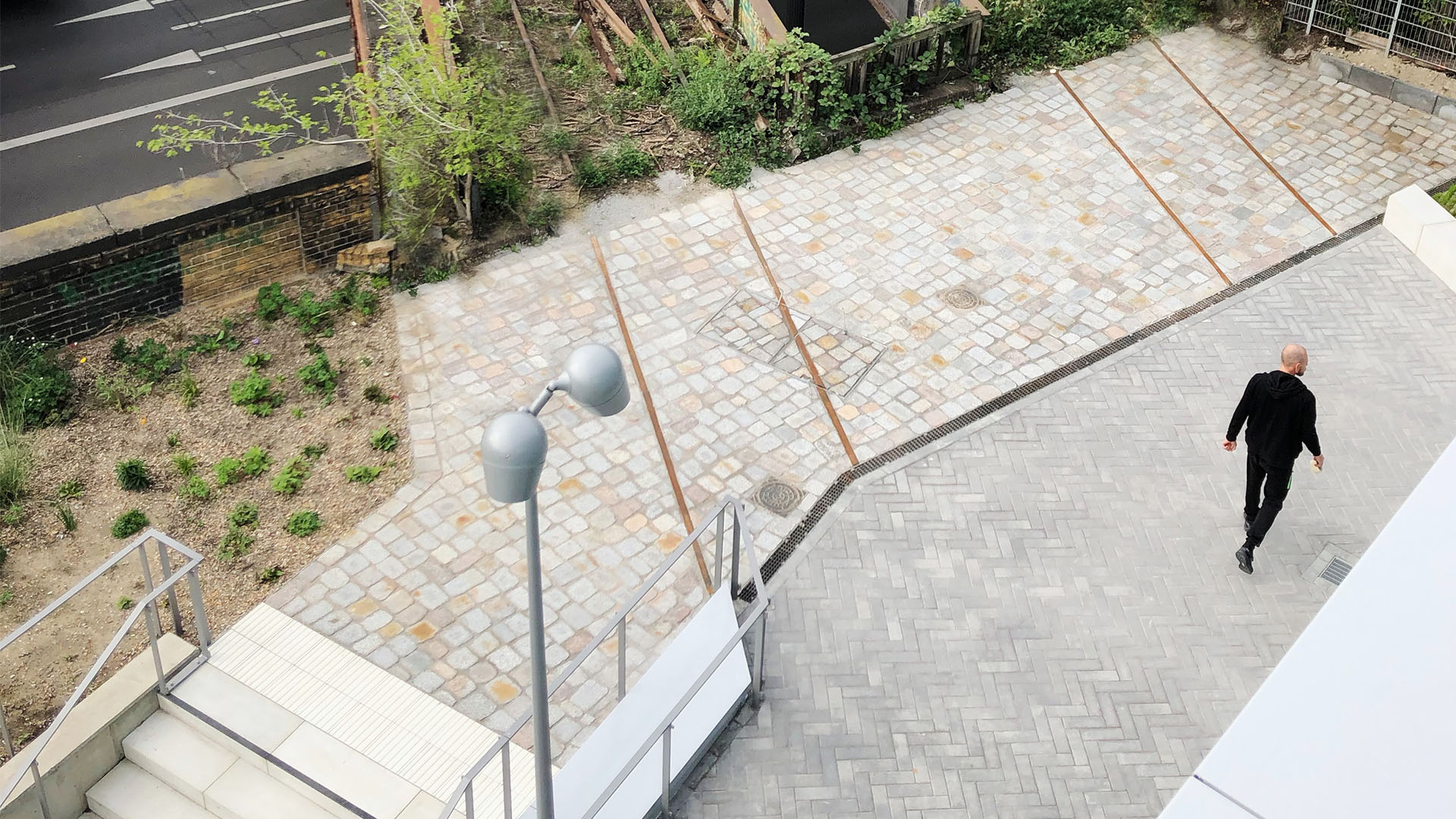 Auf dem tiefer gelegenen Niveau der Freiflächen wurde der Anschluss an den Yorckplatz mit dem passenden Belagsmaterial hergestellt.