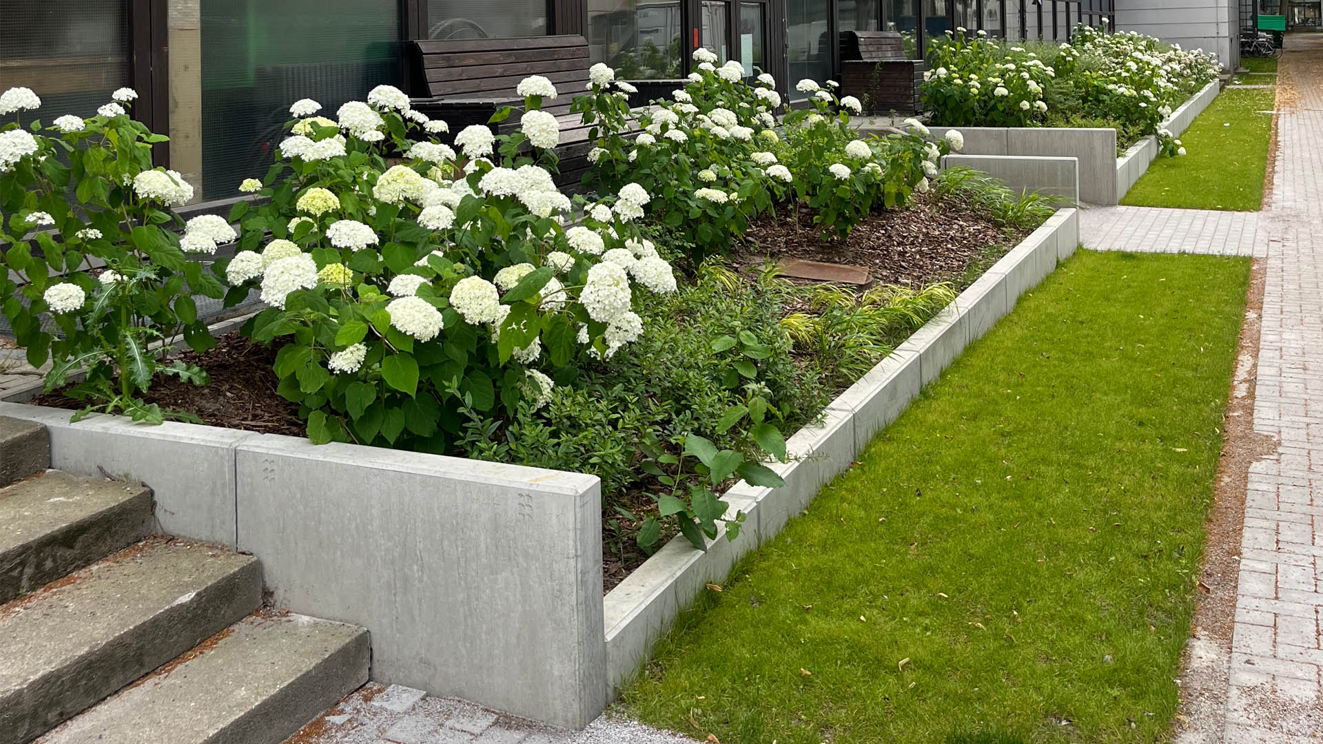 Das Konzept sieht eine lineare Verbindung zwischen Grünflächen und befestigten Flächen vor, die quer zu den Bestandsgebäuden angeordnet wurden. Die längliche Fläche gliedert sich in zwei Außenarbeitsflächen für die Werkstätten, Anfahrtszone für Anlieferungen von Material, Feuerwehrzufahrt und die angrenzenden Pflanzbereiche.