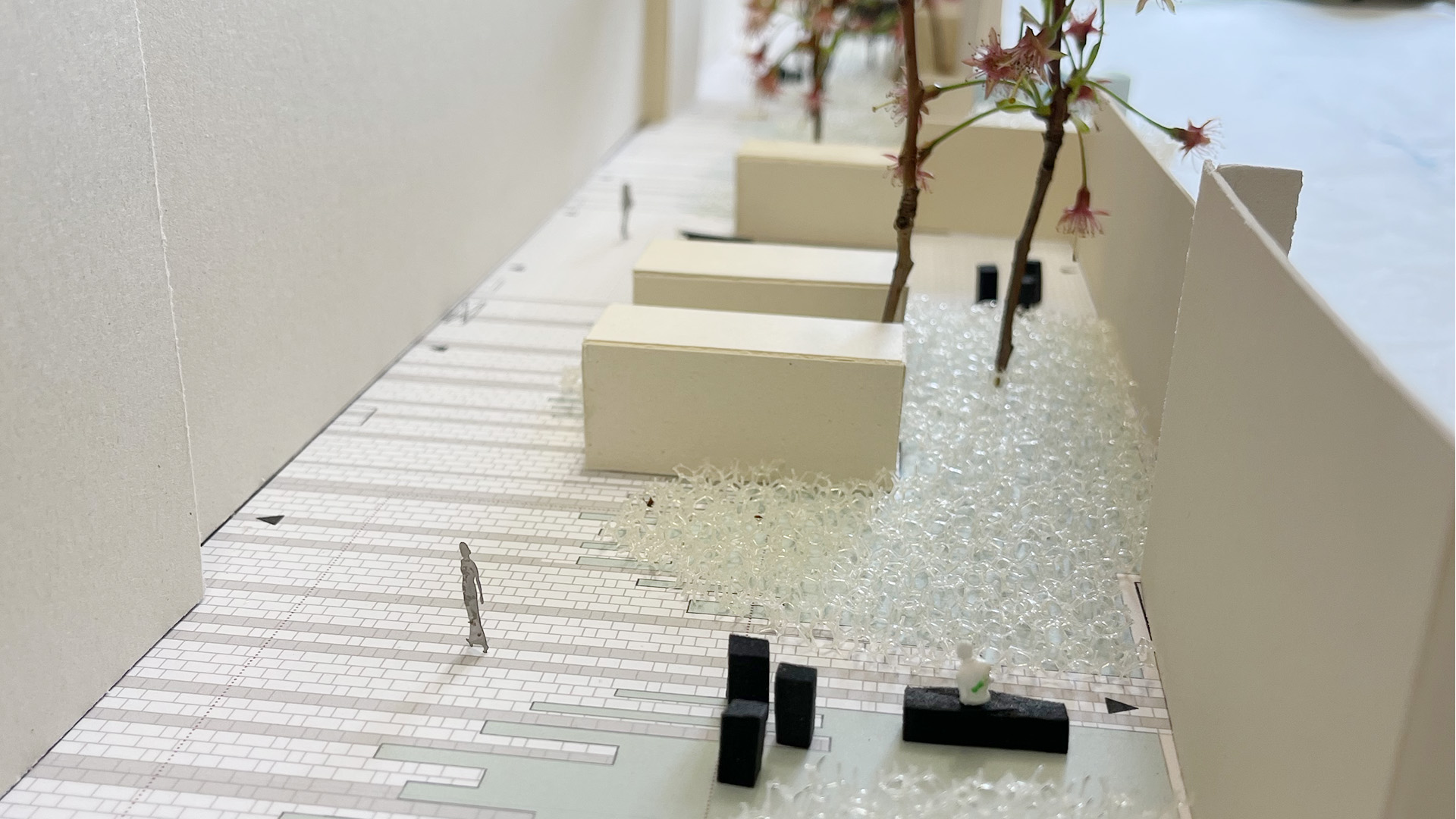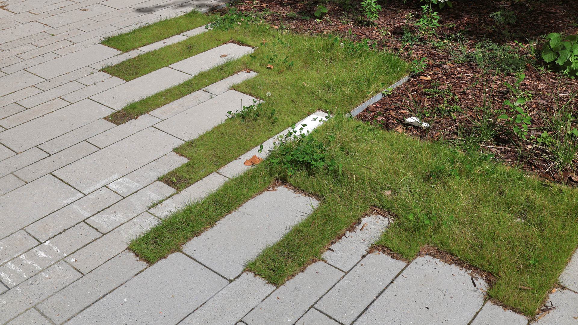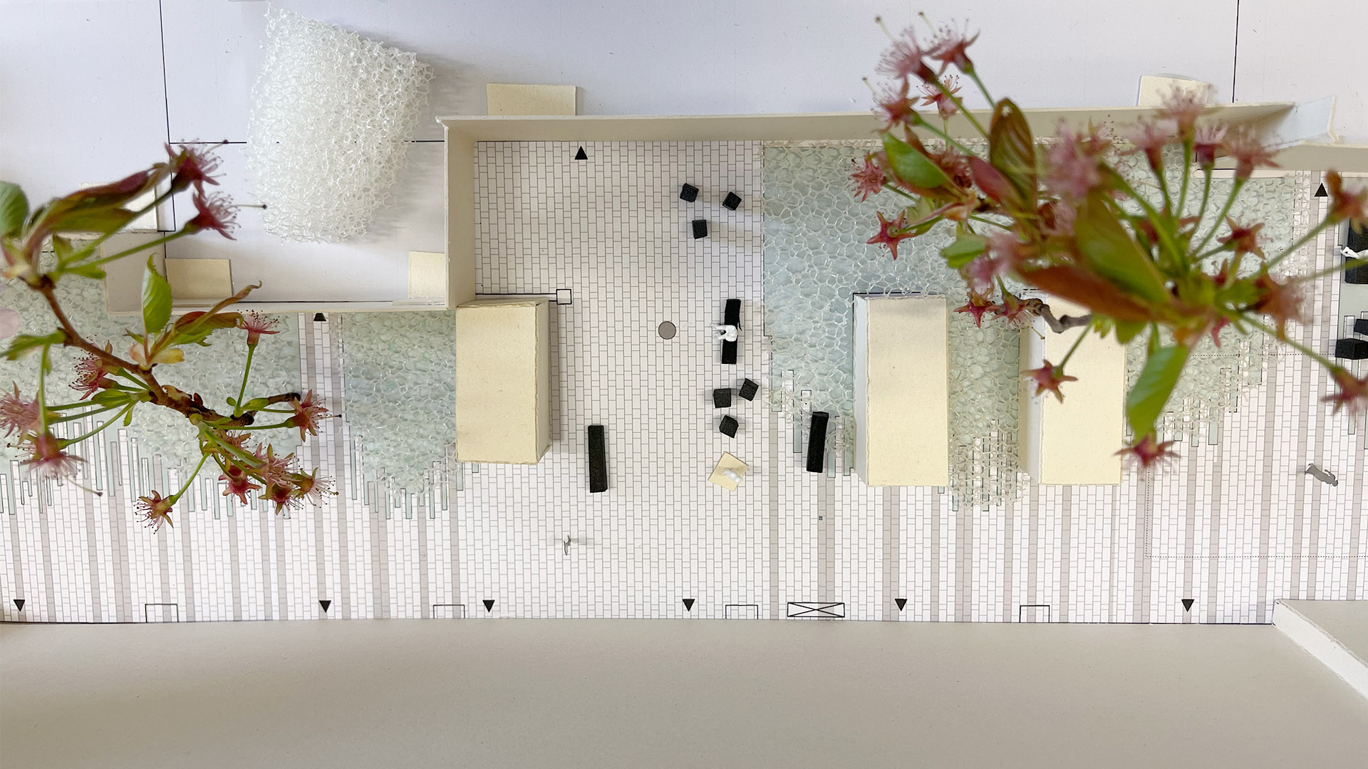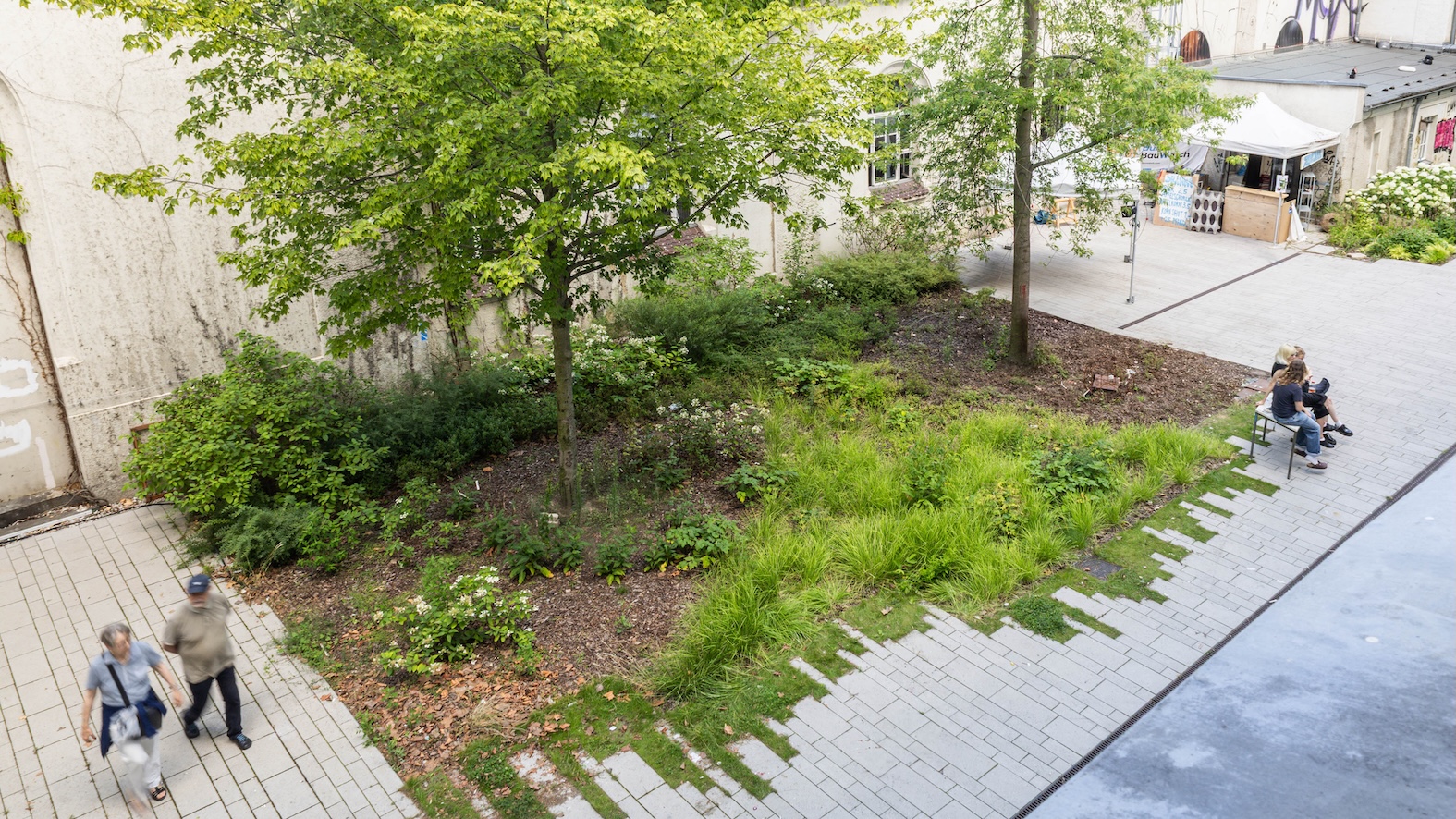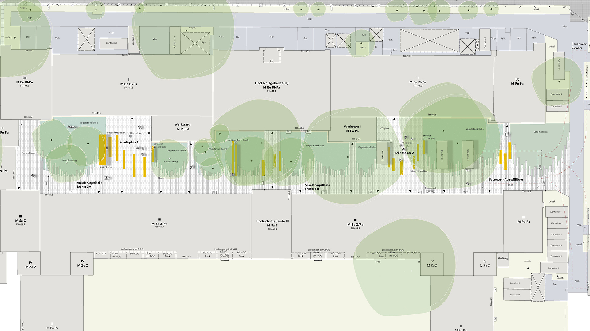 Die Arbeitsplätze werden mit einer Wasser-und Stromversorgung vorgesehen und um technische Ausrüstungen, wie Beleuchtung und Abscheider, ergänzt. Auf den Arbeitsflächen wurden robuste Betonblöcke in zwei Höhen platziert. Die Verkehrsfläche wird mit Pflastersteinen aus Recyclingmaterial hergestellt. Die unterschiedlichen Formate, die jedoch linear angeordnet werden, verschwinden spielerisch in die grünen Bereiche. Auch die Vegetationsflächen werden aufgewertet und der Baumbestand um schattenverträgliche Pflanzen in unterschiedlichen Höhen ergänzt.