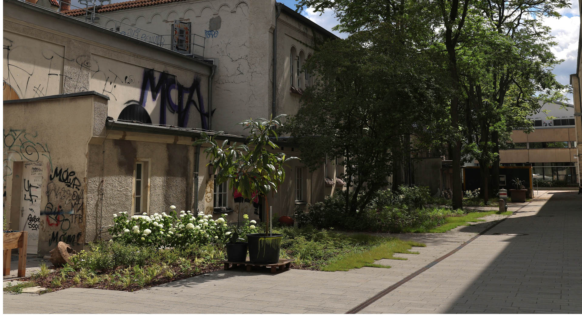 Der sanierte Hof II wird auch Werkstatthof genannt. Im EG des Gebäudes befinden sich Werkstätten und Ateliers, die auch die Außenbereiche zum Arbeiten und für Veranstaltungen nutzen. Der Werkstatthof soll neugestaltet werden, um die Aufenthaltsqualität im Hof zu erhöhen und das Belangen der Nutzer*innen zu erfüllen.