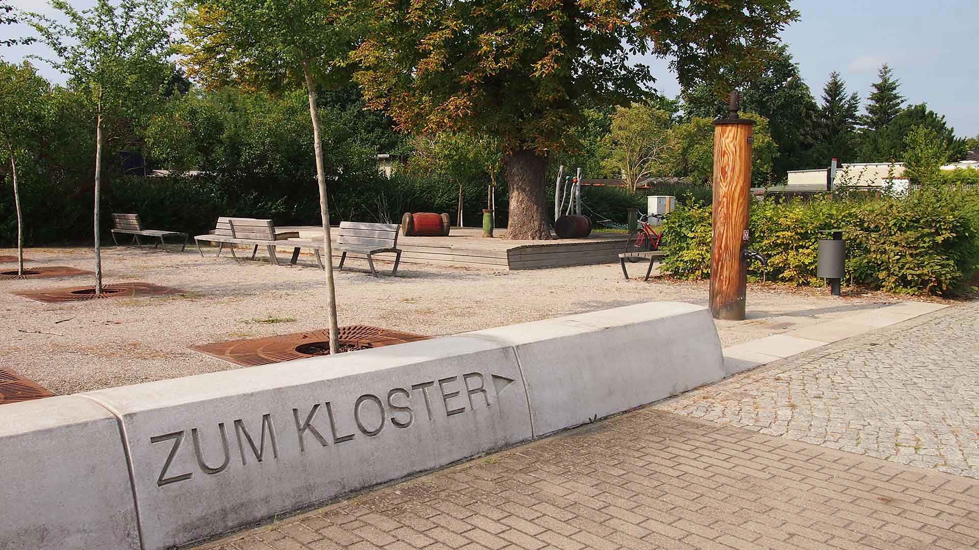 Aus stadthistorischer Sicht ist die architektonisch klare Gliederung des Platzes und eine räumliche Fassung zur Straße besonders wichtig. Eingefasst wird der Platz mit einer ca. 50 cm hohen Mauer, die zugleich als Sitzmöglichkeit dient. Auf diese Weise wird die frühere Bauflucht deutlich markiert, ohne dass die Einfassung den Blick auf den Platz beschränkt. Zur Klosterstraße wirkt ein Beet mit Pflanzstreifen aus Rosen, Gräsern und Lavendel sowie Hainbuchen-Heckenelementen als Abschirmung. Die bestehende große Kastanie ist in das Holzpodest aus einheimischem Lärchenholz integriert, in das auch eine Sandspielfläche für Kinder eingelassen ist. Innerhalb der angrenzenden Rasenfläche bieten einige skulpturale Spielobjekte weitere Anregungen für Kinder. Auf dem Rasen sind einige Zierkirschen angeordnet. Außerdem wurde die historische Wasserpumpe aus Zinna in die Platzgestaltung integriert und wieder funktionstüchtig gemacht.