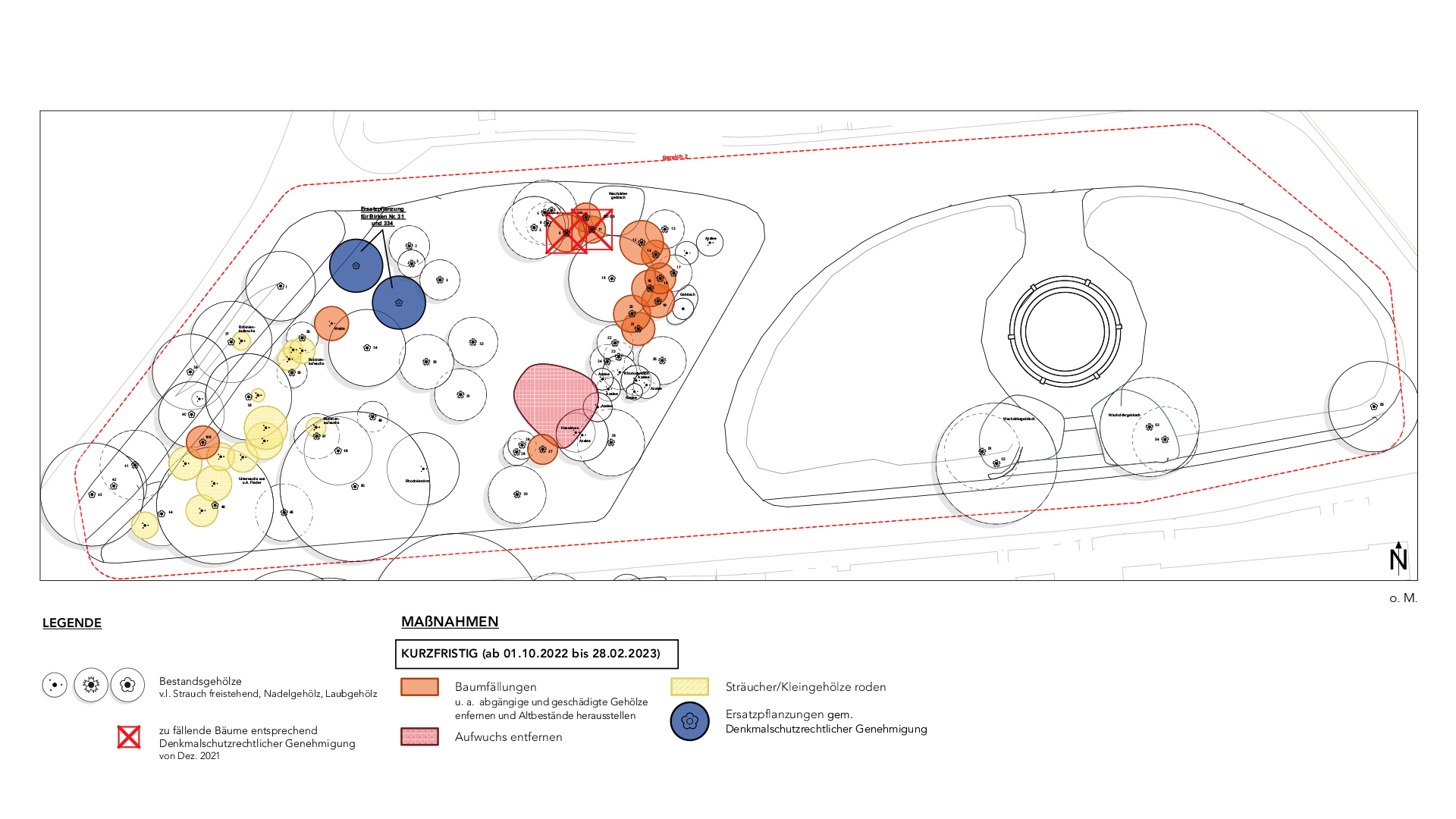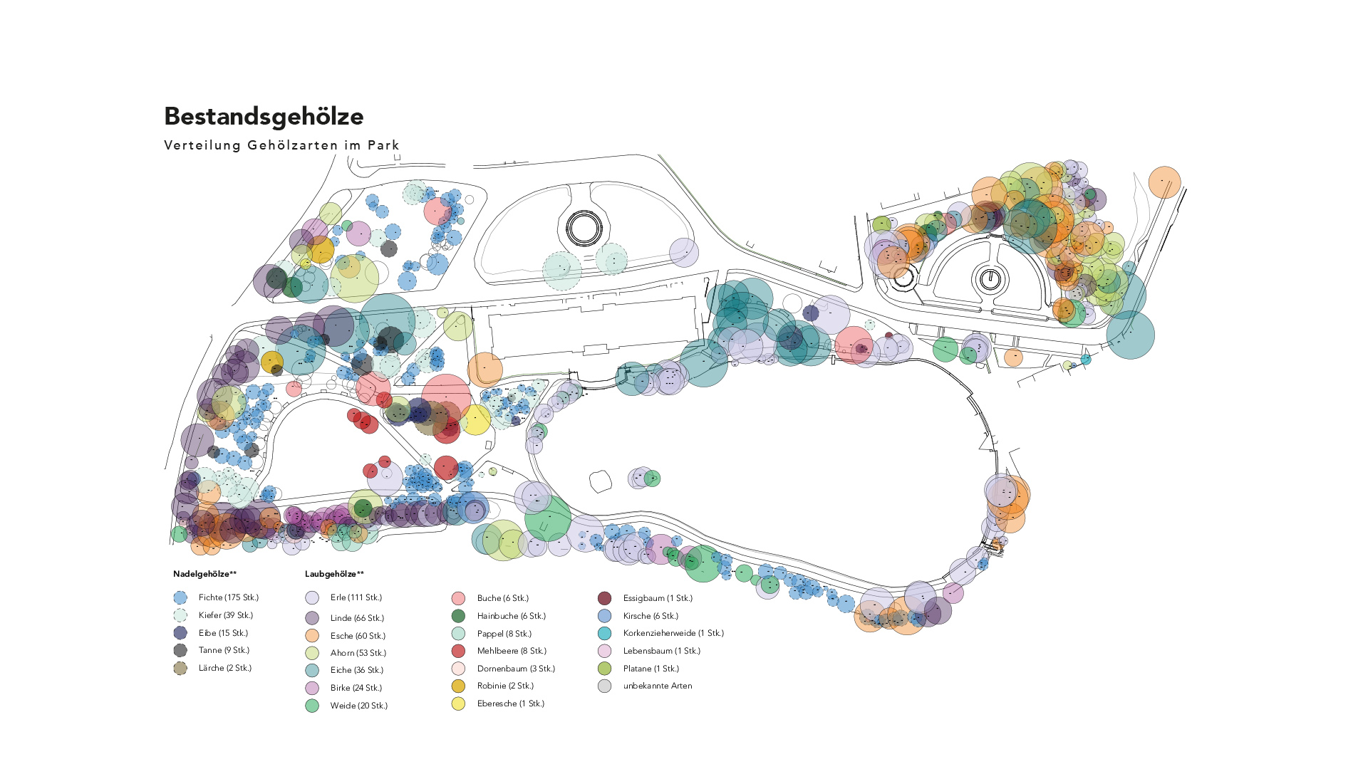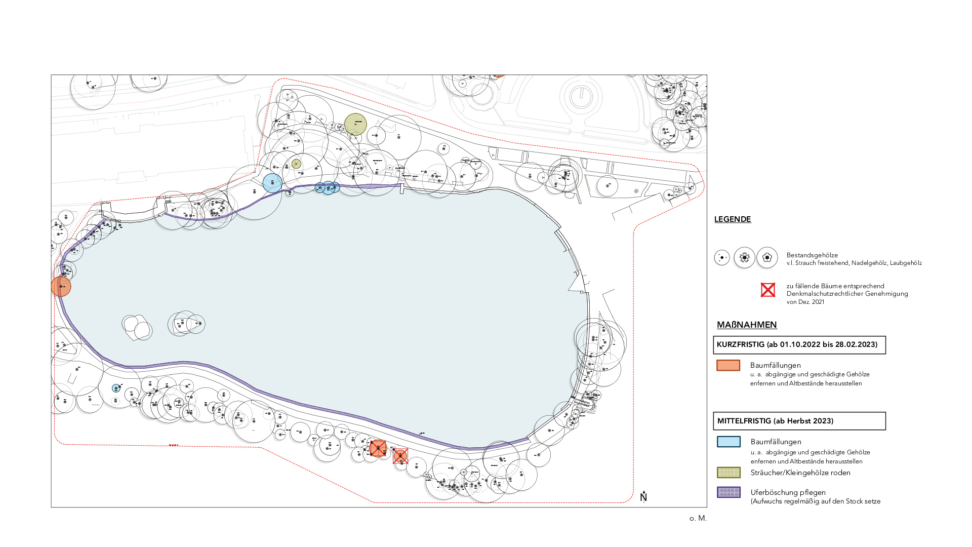 Vor diesem Hintergrund werden Maßnahmen dargestellt, die die Gehölzentwicklung für die Zukunft fördern. Es geht unter anderen darum, den Park wieder zu ordnen, die Dichte und damit die Konkurrenz aufzulösen und abgängige Gehölze zu entfernen.