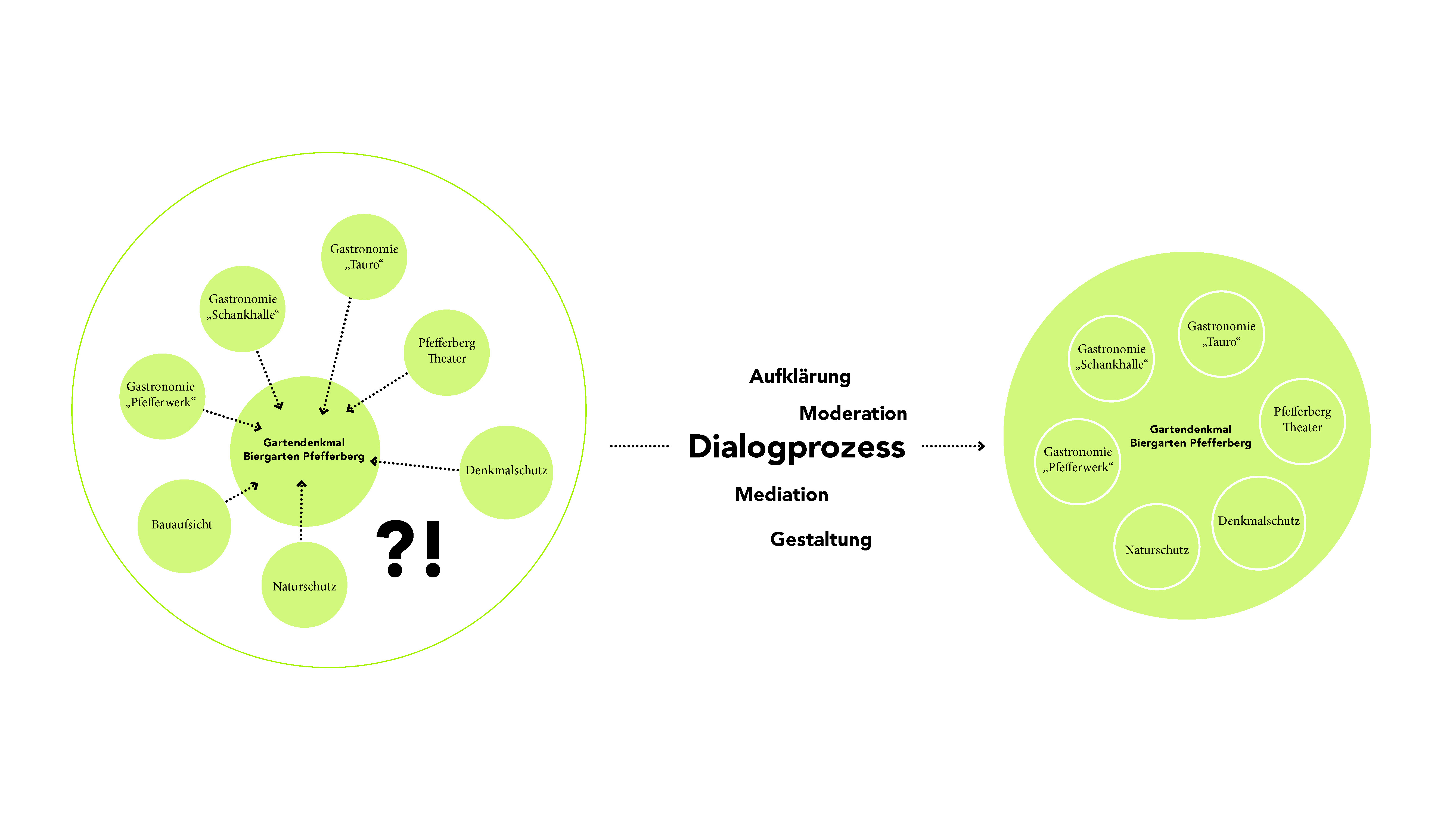 Mit der Betreuung eines Dialogprozesses konnte durch "gestalterische Moderation" ein fruchtbarerer Austausch zwischen den Interessenbeteiligten herbeigeführt werden. Daraus entstand ein Prinzipien- und Maßnahmenkatalog als Grundlage für die Weiterentwicklung des Biergartens.