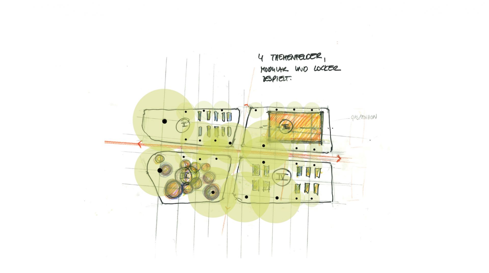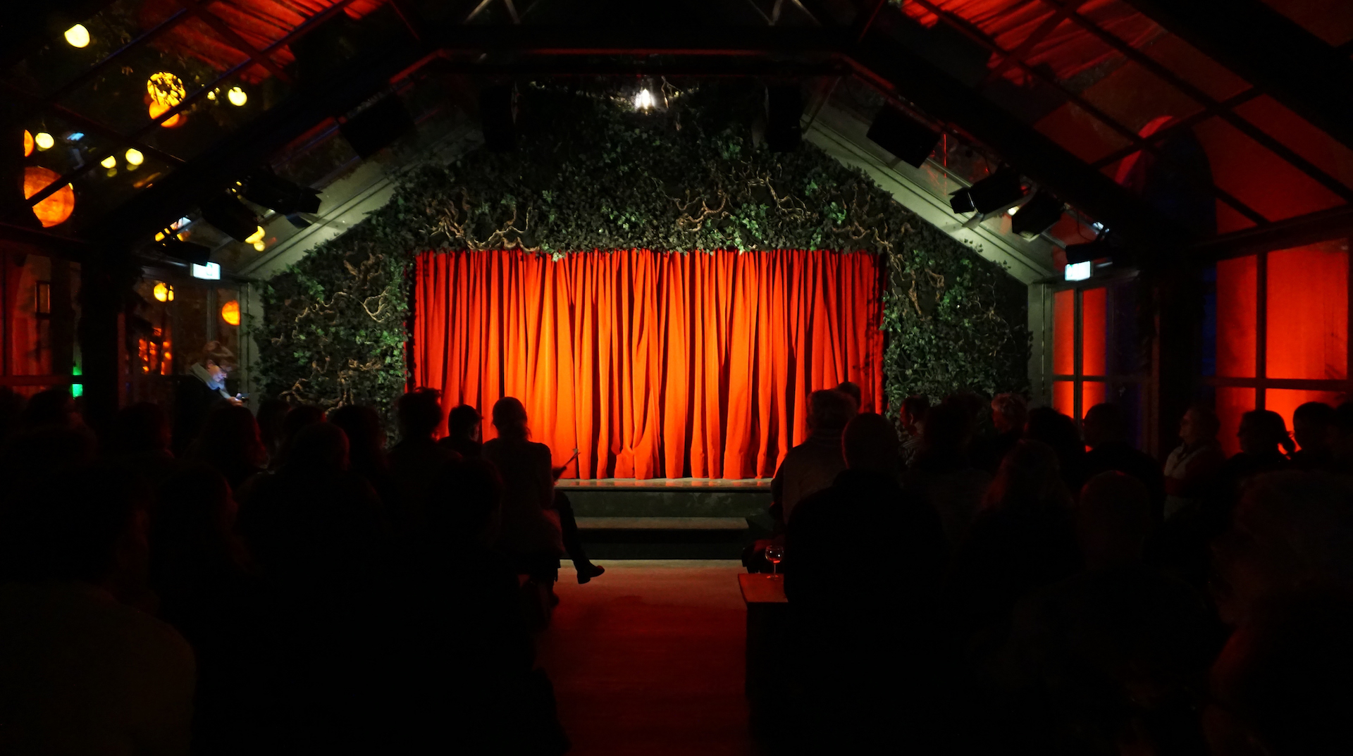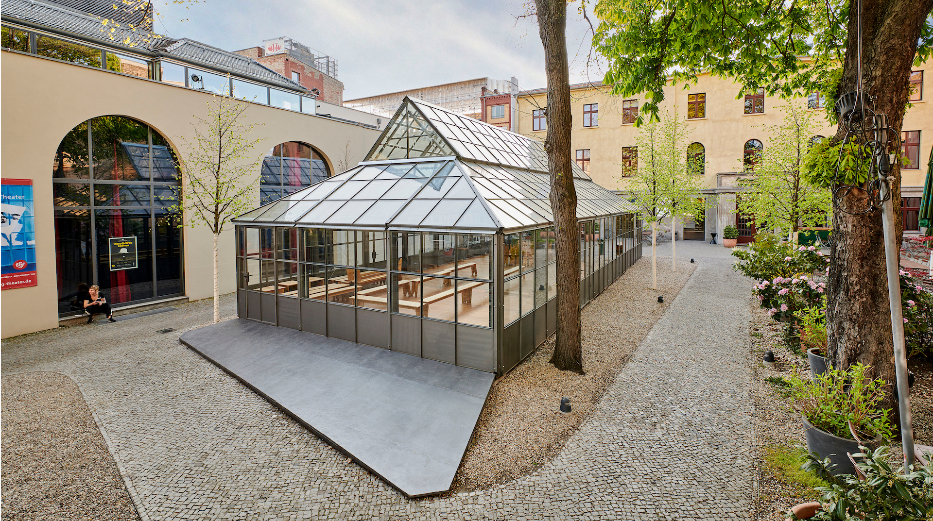 Das ansässige Theaterensemble Pfefferberg wünschte sich darüber hinaus eine besondere Spielstätte in Form eines Glaspavillons für die Winterspielsaison. Der neue Glaspavillon lässt sich im Sommer zu allen Seiten öffnen, wodurch eine leichte und offene Raumwirkung entsteht. In den Wintermonaten werden die Seiten geschlossen und es entsteht ein Raum für Theateraufführungen. Die besondere Anforderung und die Gestaltung des temporären Sonderbaus wurde in enger Zusammenarbeit mit der Gartendenkmalpflege und Bauaufsicht entwickelt.