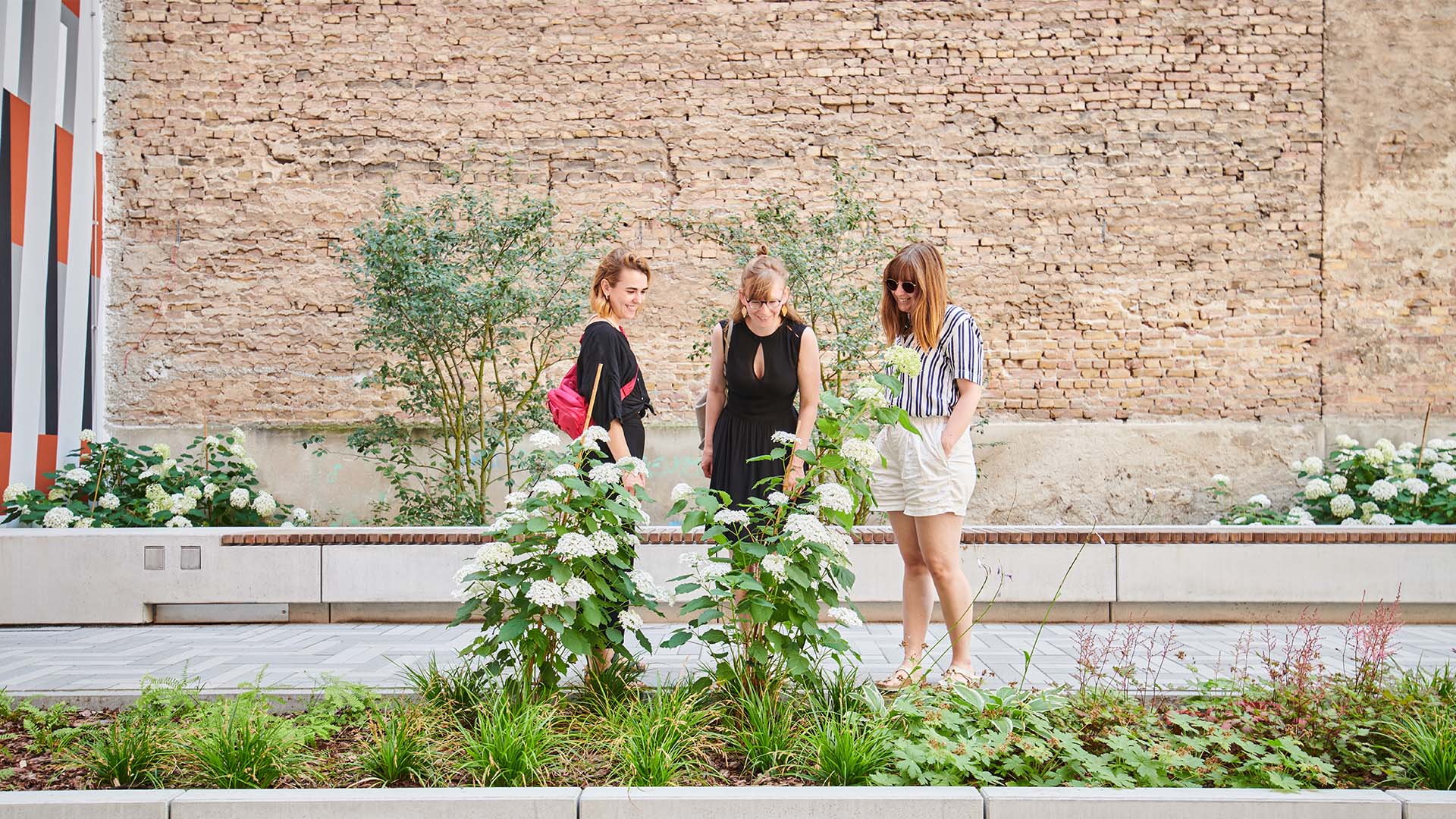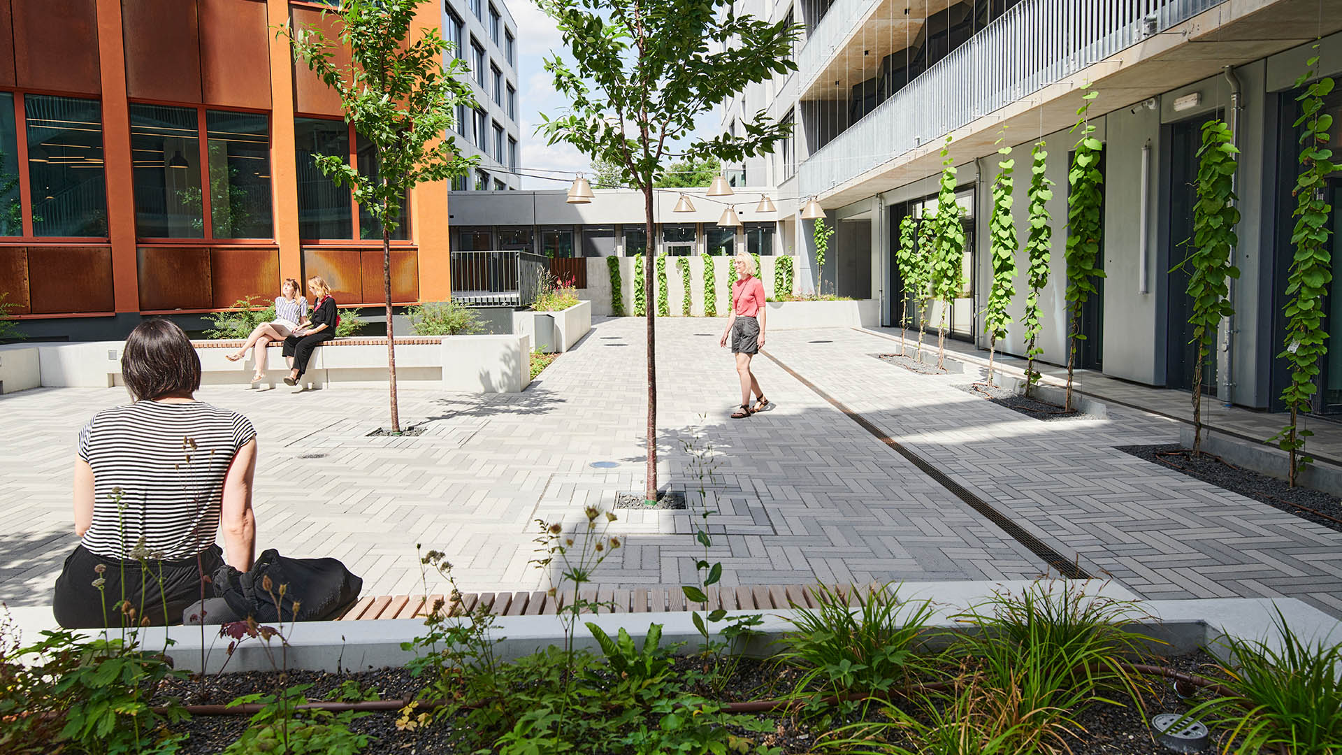 Ein weiteres raumprägendes Element in den Höfen ist die Fassadenbegrünung mit Aristolochia macrophylla. Weiterhin wurden großzügige Pflanzflächen mit Bäumen und Großsträuchern geplant.
