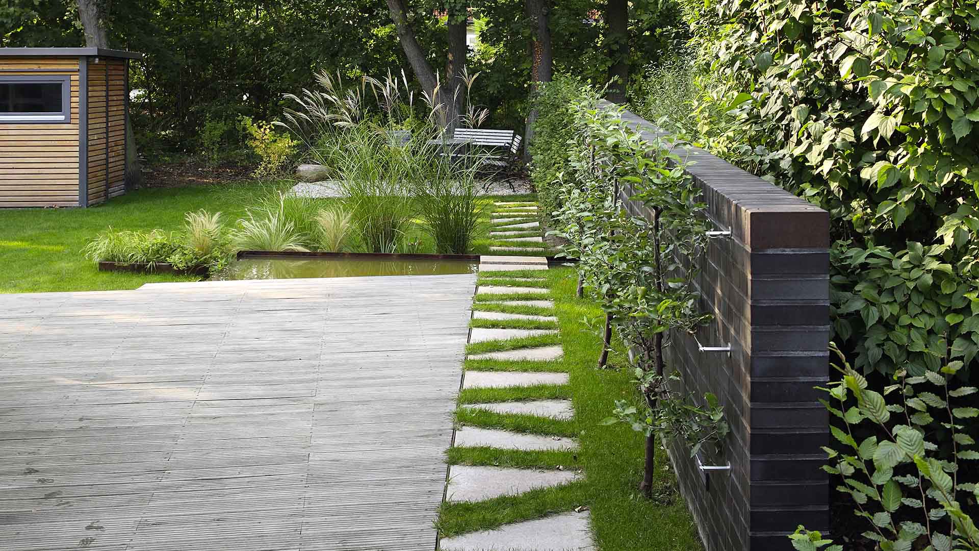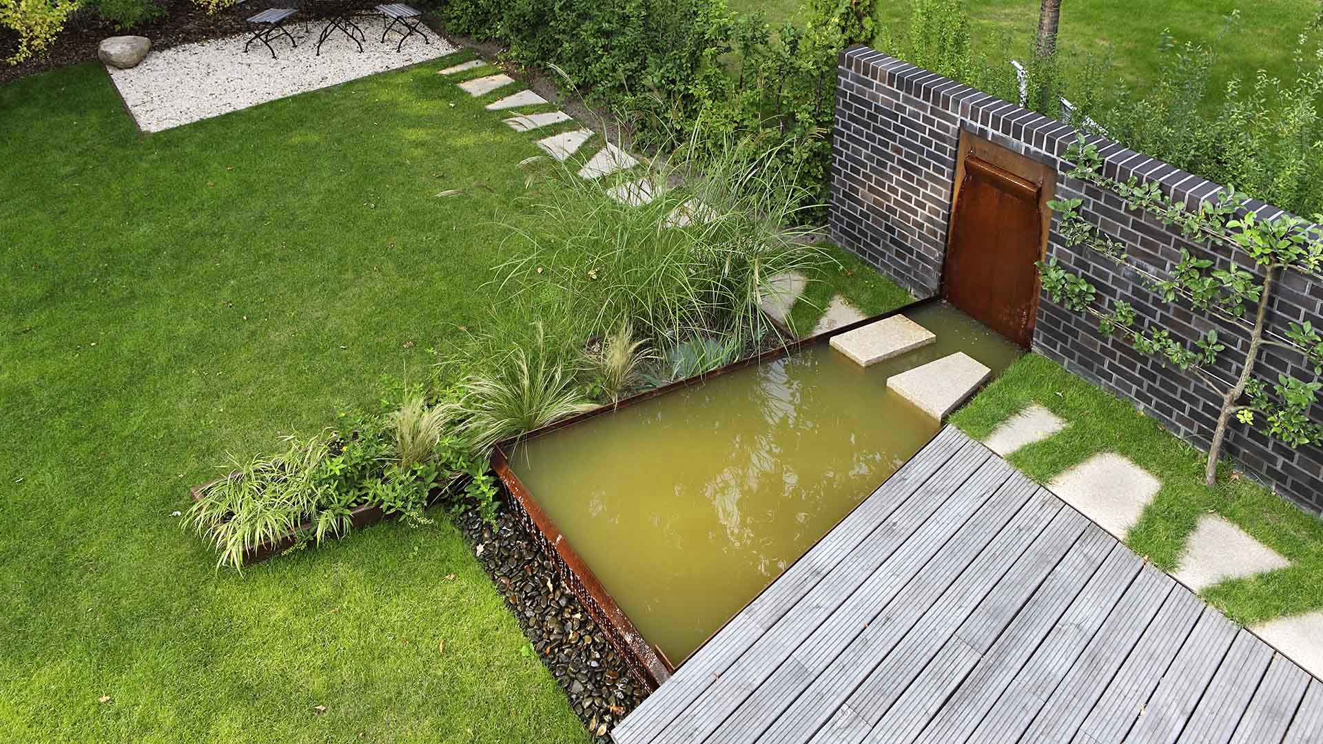 Das trapezförmige Wasserbecken aus Cortenstahl bildet das zentrale Element des Gartens. Gespeist wird der Brunnen über die stählerne Wasserwand, von wo das Wasser durch das Becken in die kiesgefüllte Überlaufrinne fließt. Direkt daneben ist die große Holzterrasse mit angeordnetem Gartenmobiliar. Eine halbhohe Klinkermauer, die sich farblich an die Fassade anlehnt, trennt den Garten optisch vom Nachbargrundstück. An dieser Mauer ranken sich Obstspaliere, die im Spätsommer beerntet werden können. Im hinteren Teil des Gartens wurde eine weitere Sitznische auf einer Kiesfläche geplant. Für Gartengeräte und Fahrräder ist in dem, mit Holzlamellen gestalterisch auf den Carport abgestimmten, Gartenpavillon Platz, an dessen Rückwand auch das Kaminholz trocken aufgestapelt werden kann. Pflanzlich wird der Garten durch Pflaumendornhecken und ein Gräserbeet in der Mitte des Gartens geprägt.
