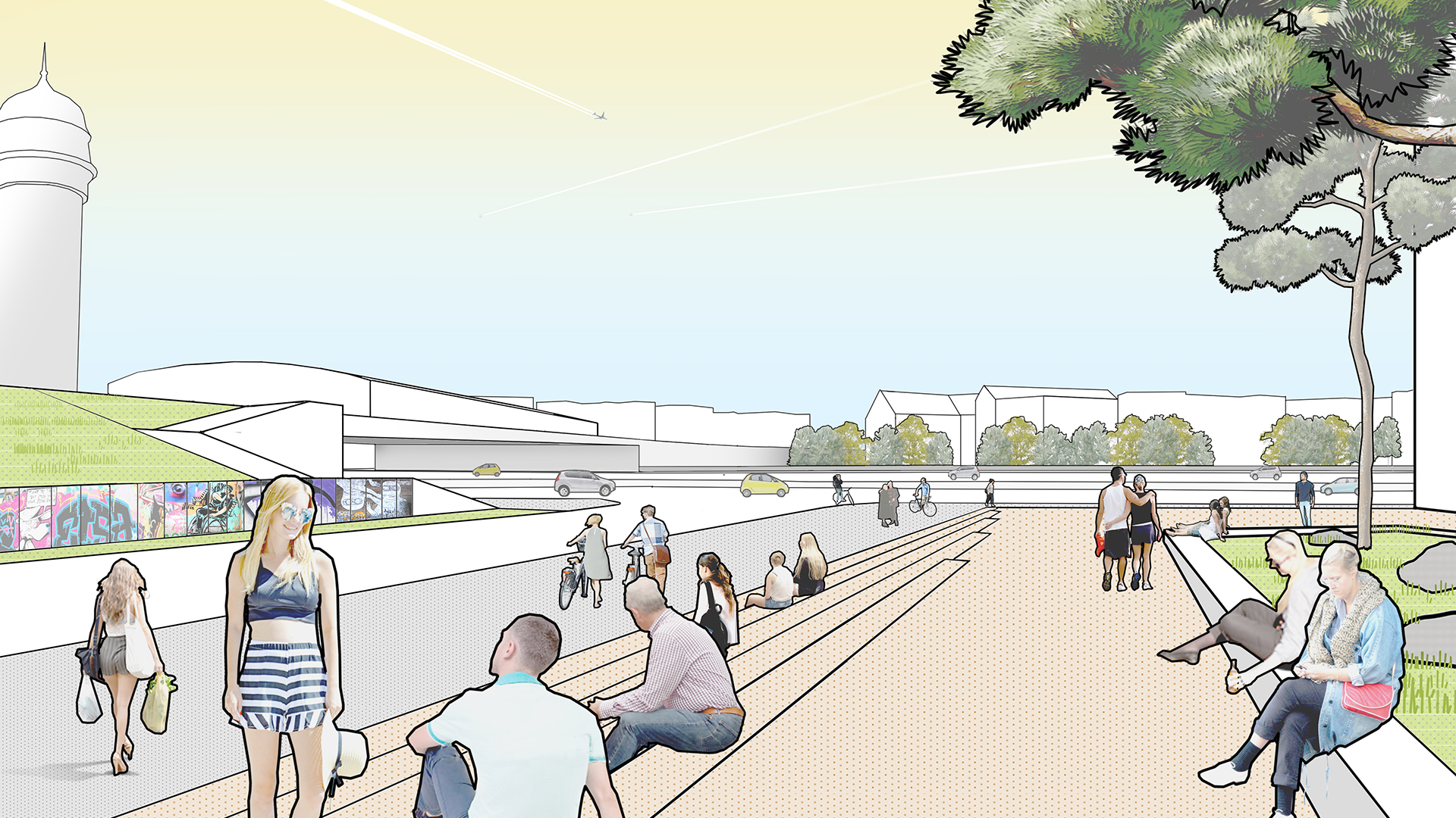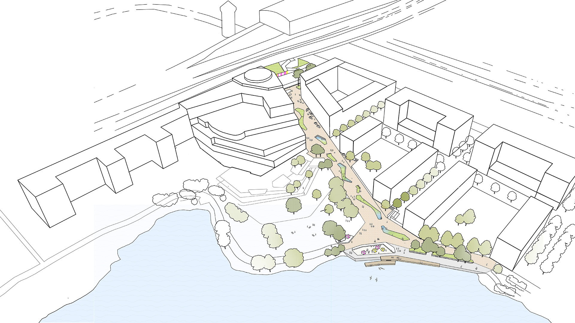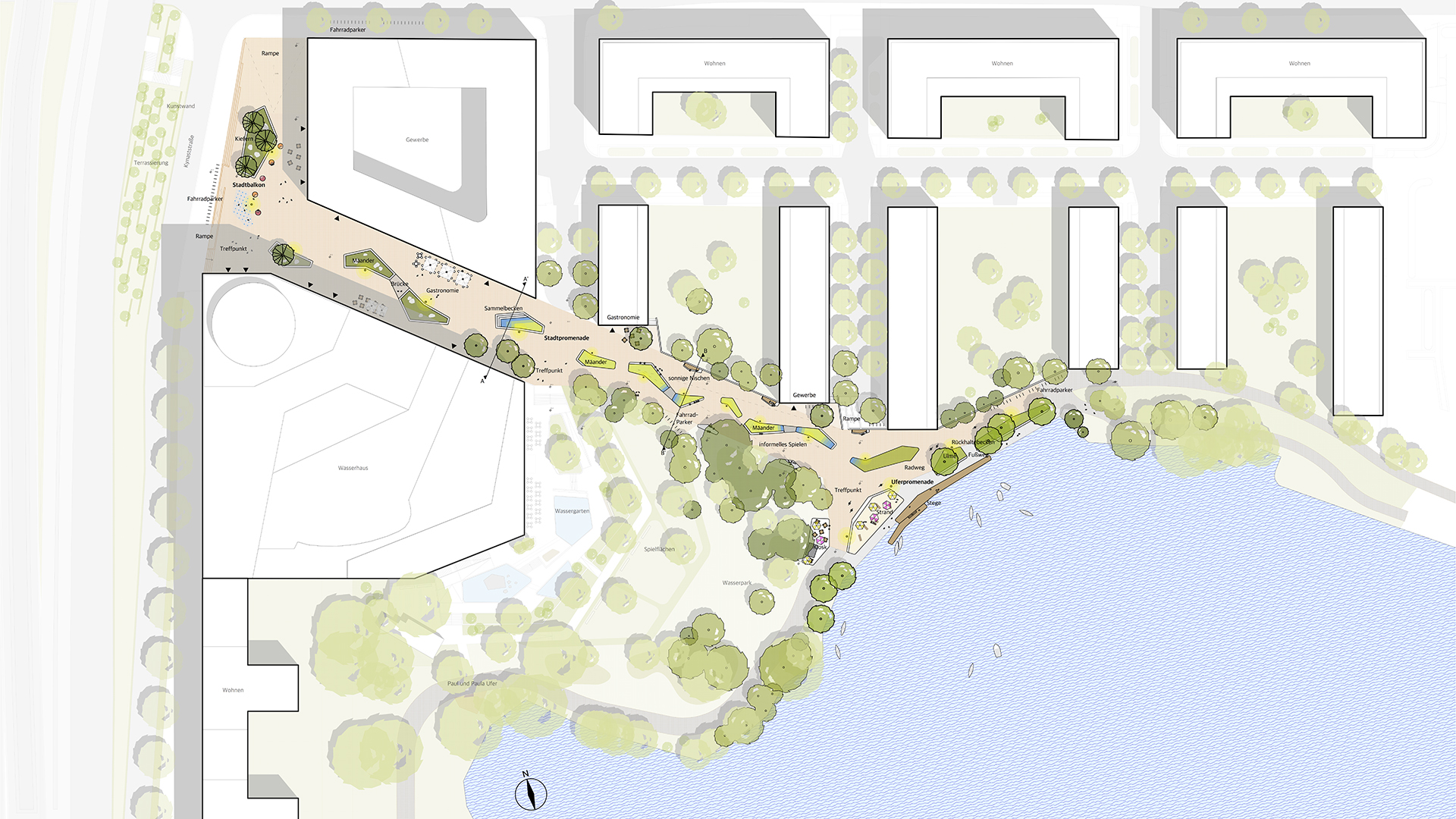 Gleichzeitig wird der langer, schmaler Raum der Promenade in 3 charakteristisch unterschiedliche Zonen gegliedert: den urbanen Stadtbalkon, die ruhige Promenade und den Stadtstrand. Der Mäander durchzieht alle 3 Bereiche, bricht den langen Raum auf und schafft kleine Taschen, die vielfältige Aufenthaltsqualitäten bieten. Es entsteht ein bunter, öffentlicher Raum mit verschiedenen Charaktereigenschaften und einem breiten Angebot an Nutzungen.