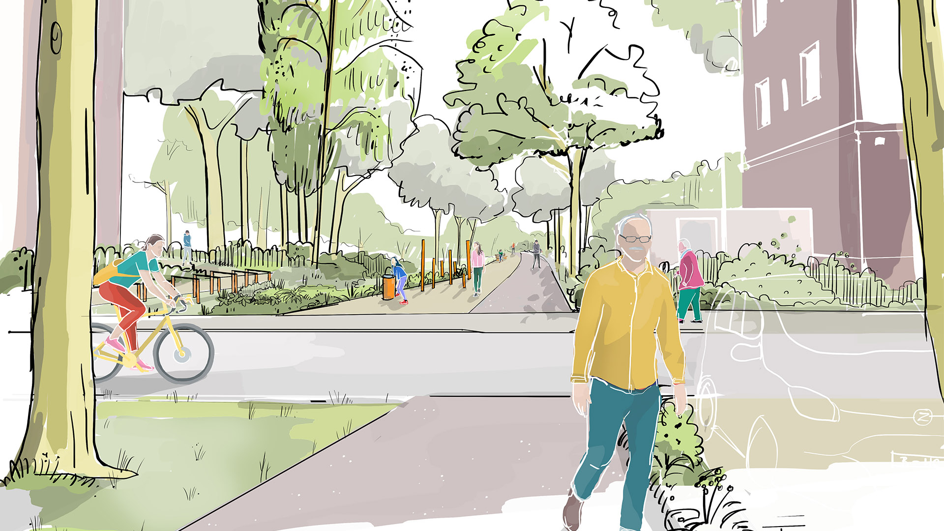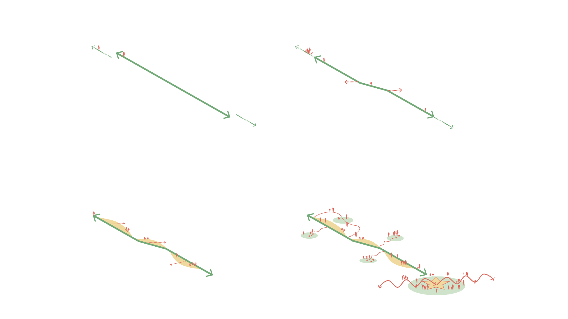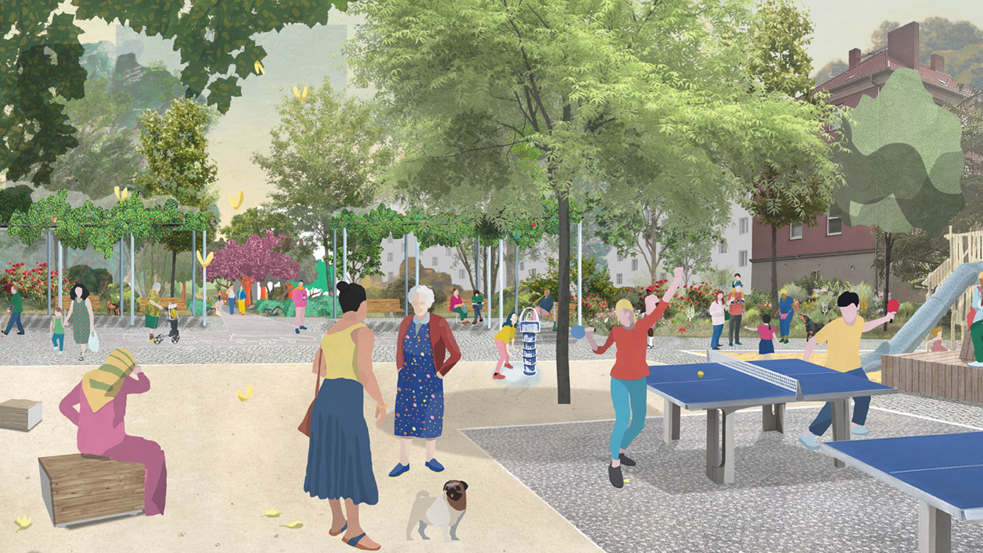 Der Grüne Weg nimmt im Norden die Impulse des Gartens der Vielfalt auf. Einem Projekt, das nicht nur die Nutzung des Raums durch Menschen aktiviert hat, sondern auch zu einem Schlüsselraum für die Interaktion mit der Artenvielfalt geworden ist. Das Element der Biotope aus Natursteinhaufen wird entlang des Grünzugs aufgegriffen. Das auf den Wegen anfallende Regenwasser wird den Vegetationsflächen zugeführt, sodass hier neben trockeneren Bildern auch temporär feuchte Momente beobachtet werden können. Das Durchschreiten des Grünraums wird je nach Bedürfnis zu einem abwechslungsreichen Erlebnis. Ein durchgehender Asphaltweg ermöglicht direkte Mobilität, während ein weicher Weg aus wassergebundener Decke daneben Räume für Bewegungsplätze eröffnet. Der sanfte Wegeversprung bricht die starre Achse dynamisch. Die Promenade wird von unterschiedlichen Atmosphären begleitet, je nach Dichte der Bepflanzung und der Wiesen- und Staudenflächen. Diese schaffen sonnige und schattige Bereiche und integrieren private Grünflächen der umliegenden Genossenschaftsgebäude durch rhythmische Bepflanzungen hinter dem Zaun. Dank der Auslichtung von Sichtbeziehungen vermittelt sich stets ein Gefühl von Offenheit und Sicherheit. Der ruhige grüne Weg mündet in einen romantisch anmutenden Platz mit berankter Pergola, die den rahmenden Auftakt zum Quartiersplatz bildet - das räumliche und pulsierende Herz, der als Mittelpunkt gestaltet ist. Dort befinden sich u. A. beschattete Spielbereiche, Mehrgenerationenflächen mit inklusiven Bewegungsangeboten für Senior*innen und Erwachsene oder Beete, welche in der Beteiligung weiterentwickelt werden können.