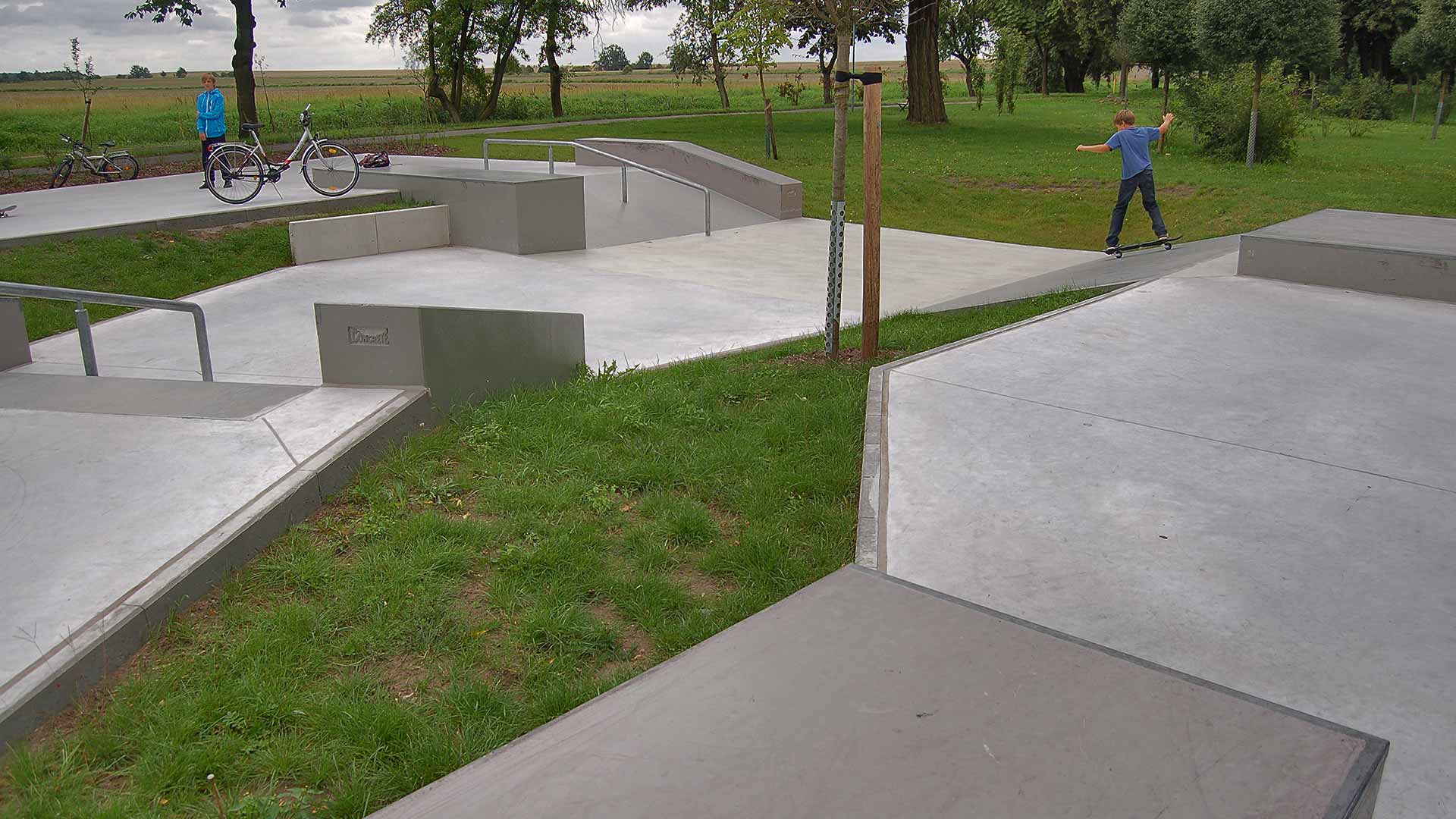Engagierten Skatern aus Jüterbog ist es mittels eines innovativen Projektantrages gelungen, Fördermittel zum Bau einer Skateanlage in ihrer Stadt einzuwerben. Gemeinsam mit den späteren Nutzern haben hochC und DSGN-concepts im Rahmen von Workshops einen Entwurf für den Skatepark erarbeitet. Die Planung geht in der Wahl der Skateelemente maximal auf die Bedürfnisse der Jugendlichen ein, zugleich ist die Anlage gestalterisch als eine Skulptur konzipiert, die sich harmonisch in die Umgebung aus Grünfläche mit angrenzendem geschützten Biotop und Sportstätten einfügt. Sowohl Skateelemente als auch die Fahrfläche (Flat) wurden aus hochwertigem Beton hergestellt. Dies garantiert optimale Fahreigenschaften bei gleichzeitiger größtmöglicher Lärmreduzierung. Bei der Standortsuche für die Skateanlage wurden Anwohner und Bürger der Stadt einbezogen. So konnte die Akzeptanz für die Skateanlage im Vorfeld gesteigert und Vorbehalte gegenüber dem Bau einer Freizeitanlage für die Jugend zerstreut werden. Mittlerweile erfreut sich die Anlage großer Beliebtheit unter den jugendlichen Skatern aus Jüterbog und der Umgebung.