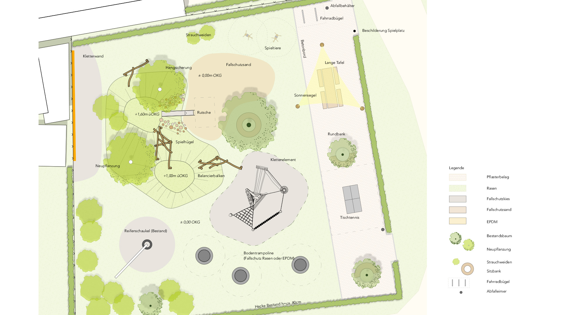 In der Mitte der Grundstücksfläche ist ein neumodellierter Spielhügel geplant, welcher umliegend unterschiedliche Spielzonen hat: eine Zone für Kleinkinder mit nahem Sichtbezug zu der langen Sitztafel und Sonnensegel sowie ein Bereich mit Angeboten für ältere Kinder und Jugendliche.