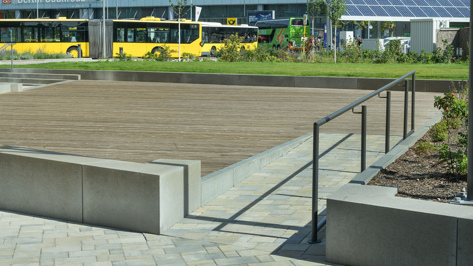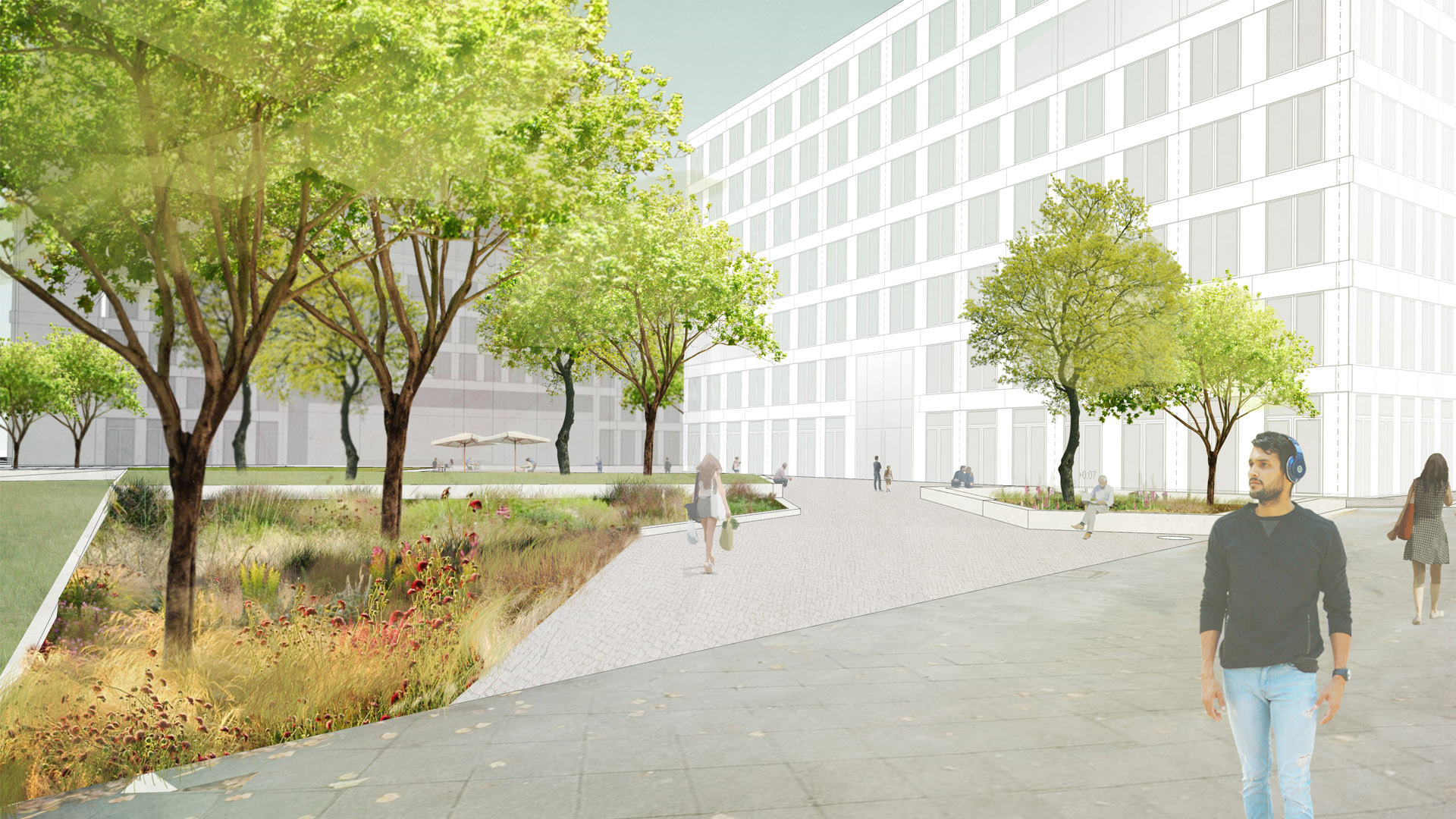 Das Grundstück direkt am Bahnhof Südkreuz neben den beiden neu geplanten Gewerbegebäuden wird als öffentlich begehbarer Stadtplatz mit großem Grünanteil geplant.