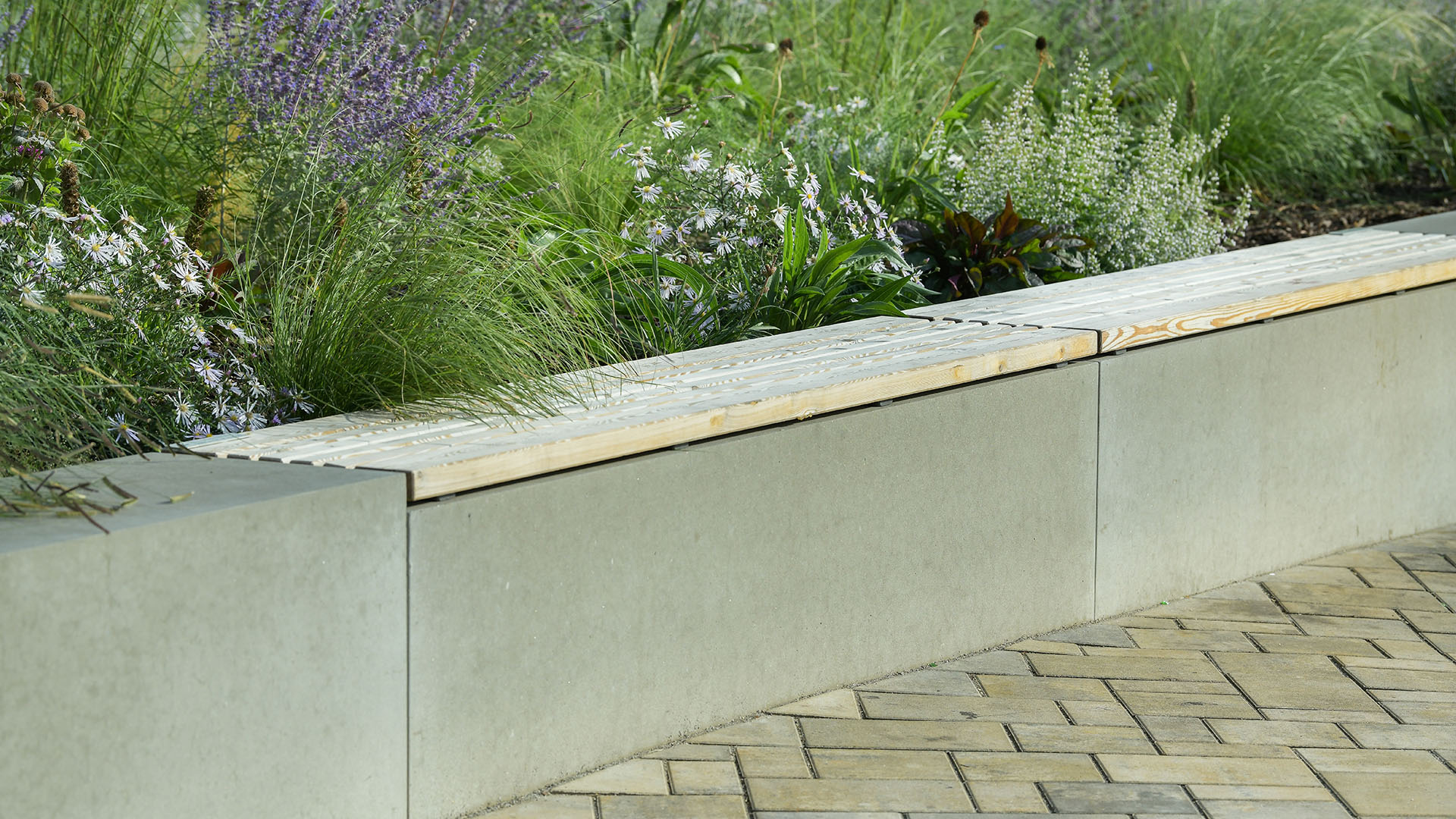 Auf dem Grundstück werden 23 neue Bäume in den begrünten Plateaus gepflanzt. Die Grünflächen werden mit unterschiedlich hohen Strauchpflanzungen gestaltet, die ein abwechslungsreiches Blütenbild schaffen und auch ökologischem Nutzen für Insekten und Vögel darstellen sollen.