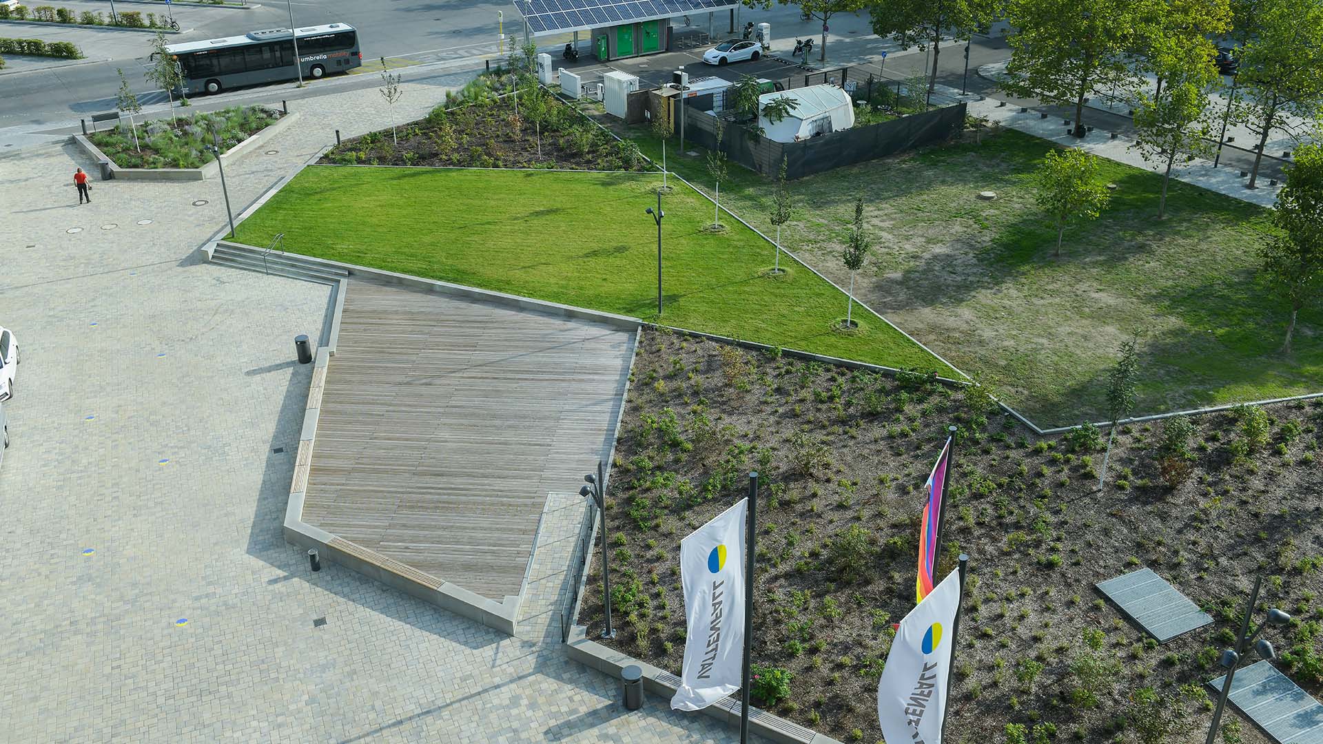 Der Entwurf spielt mit dem Thema Höhen. Schollenartig schieben sich verschieden hohe grüne Plateaus in die Platzfläche. Im Spiel von 15 bis 60 cm Höhendifferenz werden Flächen mit unterschiedlicher Aufenthaltsqualität geschaffen – Cafeterrasse, Picknick-Rasenfläche, Wiesenfläche unter Bäumen. Die Plateaus werden mit Stützmauern abgefangen, die z.T. mit Holzsitzauflagen versehen werden, die wiederum zum Verweilen einladen. Die befestigte Platzfläche wird aus einem Betonsteinpflasterbelag gestaltet. 3 unterschiedliche Formate in 2 verschiedenen Grautönen kommen in wilden Verband zum Einsatz.