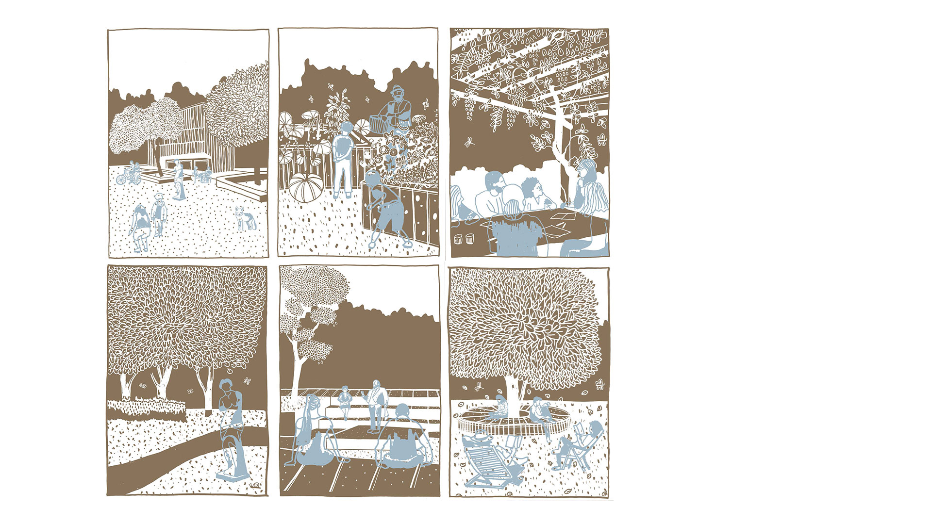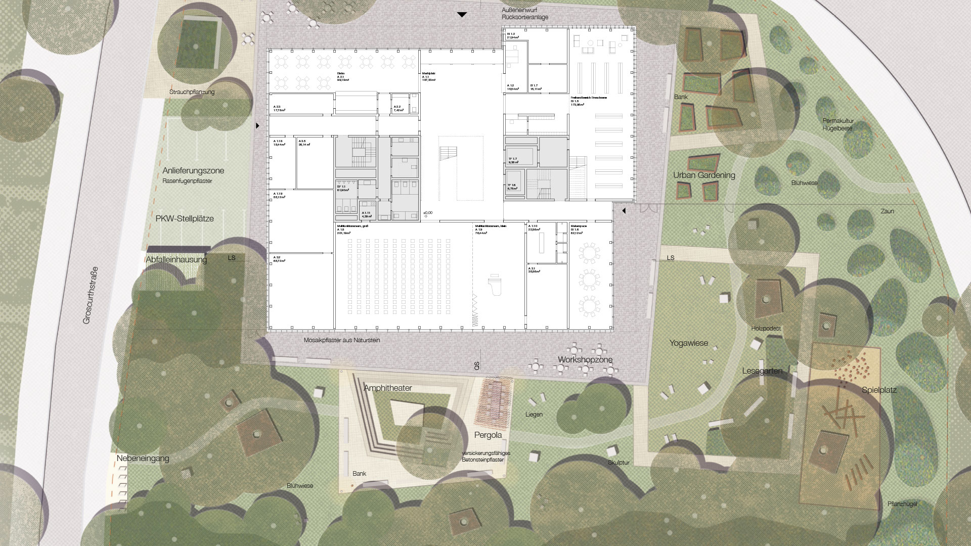 Um das Gebäude sind unterschiedliche Nutzungsangebote angeordnet, wie Urban Gardening, Yogawiese, Kinderspielplatz, Workshopzone, Naturerfahrungsraum und Amphitheater/Grünes Klassenzimmer. Insgesamt können durch die geschickte Anordnung der Nutzungen 80% der Bestandsbäume erhalten werden.