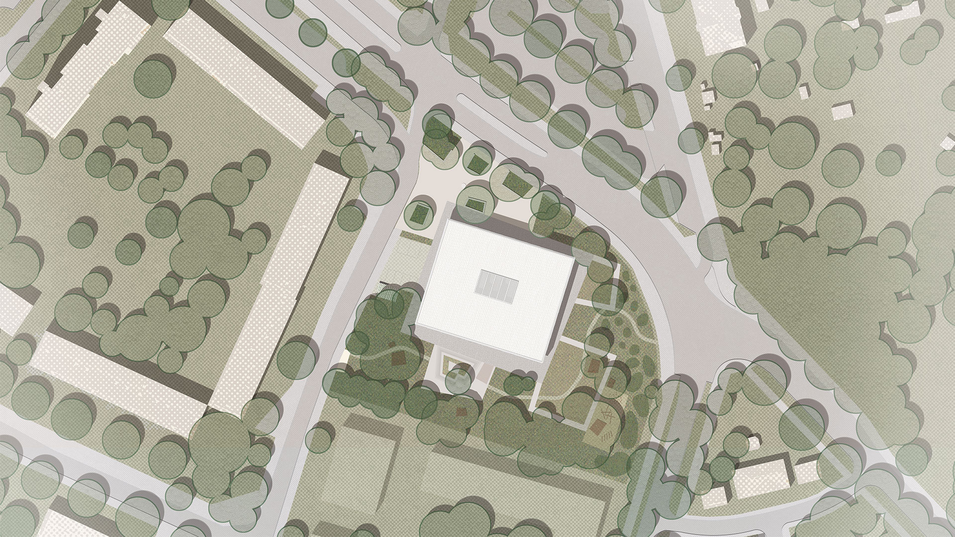 Der mittig auf der Fläche platzierte Neubau steht auf einem umlaufenden, homogen befestigten „Teppich“, welcher eine umlaufende äußere Erschließung der EG-Zone erlaubt. Der großzügige Vorplatz am Haupteingang ist Ankunfts- und Aufenthaltsort und zugleich der Endpunkt der neuen Freiraumachse.