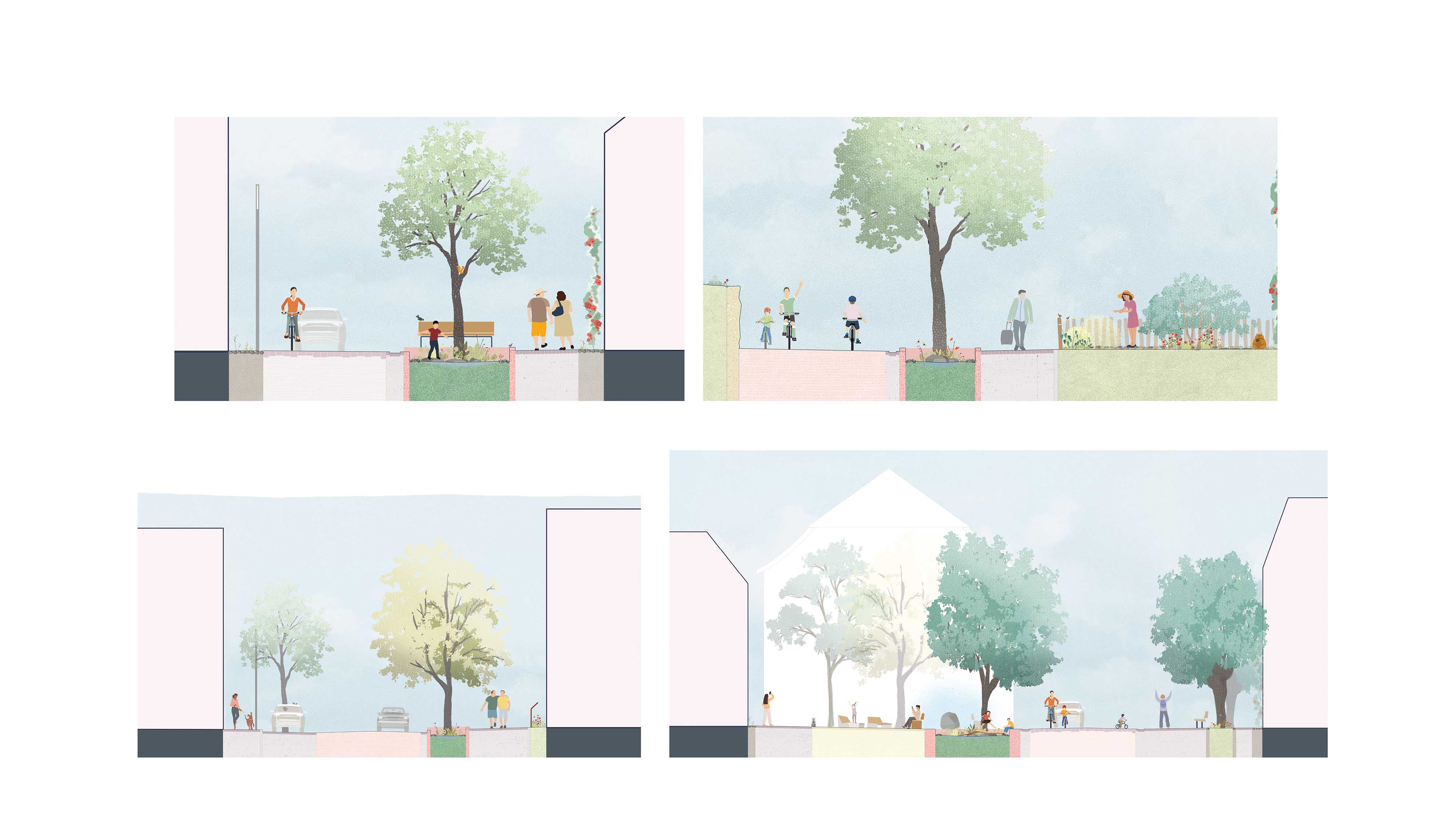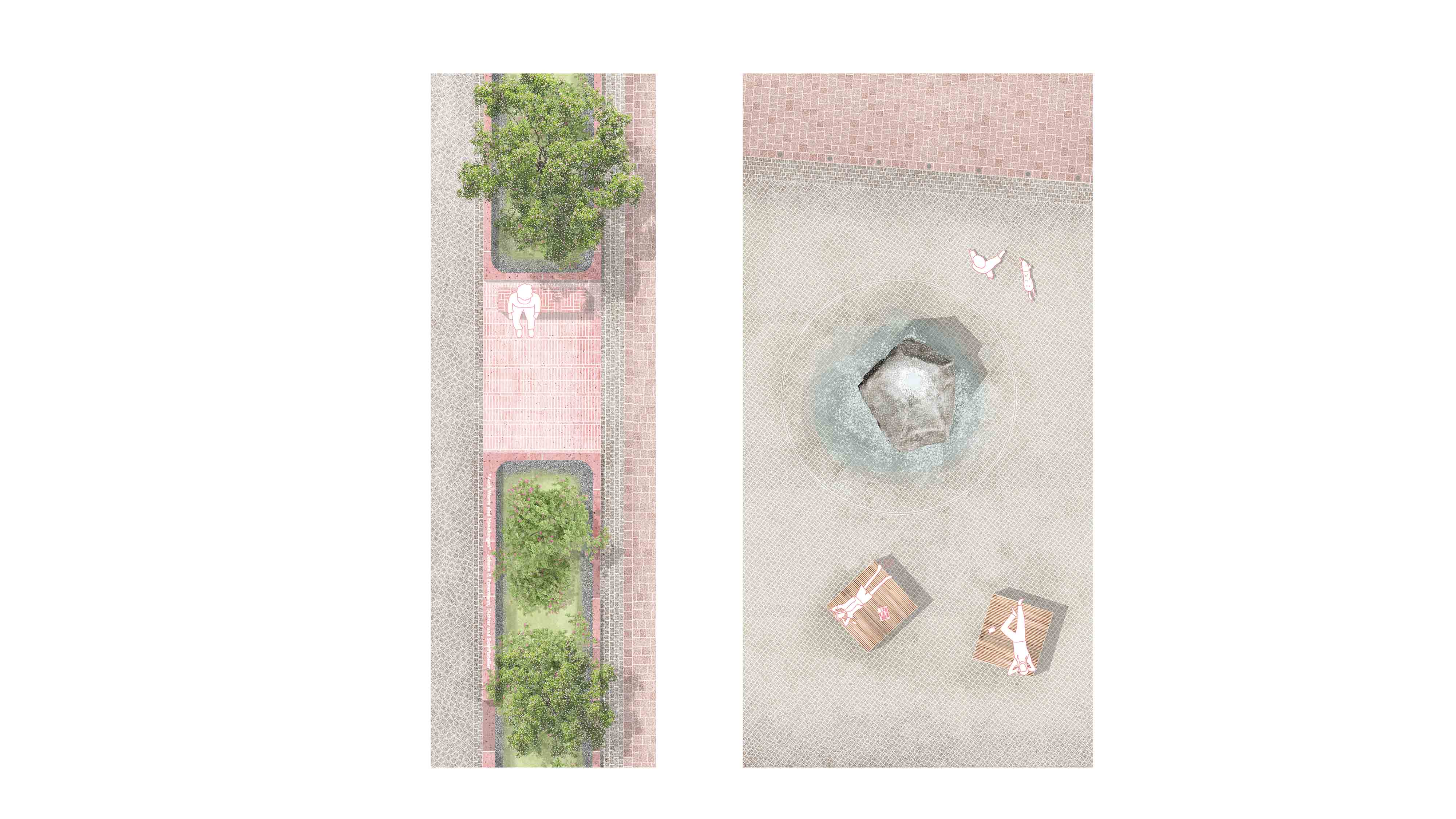 Der denkmalgeschützte Eingangsbereich bleibt in seiner Form erhalten, wird jedoch durch organische Kunstwerke und moderne Pflanzungen ergänzt, was einen zeitgenössischen Charakter schafft. Der Innenhof bietet einen spannenden Blick auf die Hintergründe der Gipsformerei und vereint üppige Grünflächen mit Kunstwerken, die zur Entdeckung und Interaktion einladen. Der Gartenhof dient den Mitarbeitenden als Ruhebereich und verbindet eine minimal befestigte Fläche mit üppiger Vegetation und mobiler Bestuhlung, die für Entspannung sorgt.